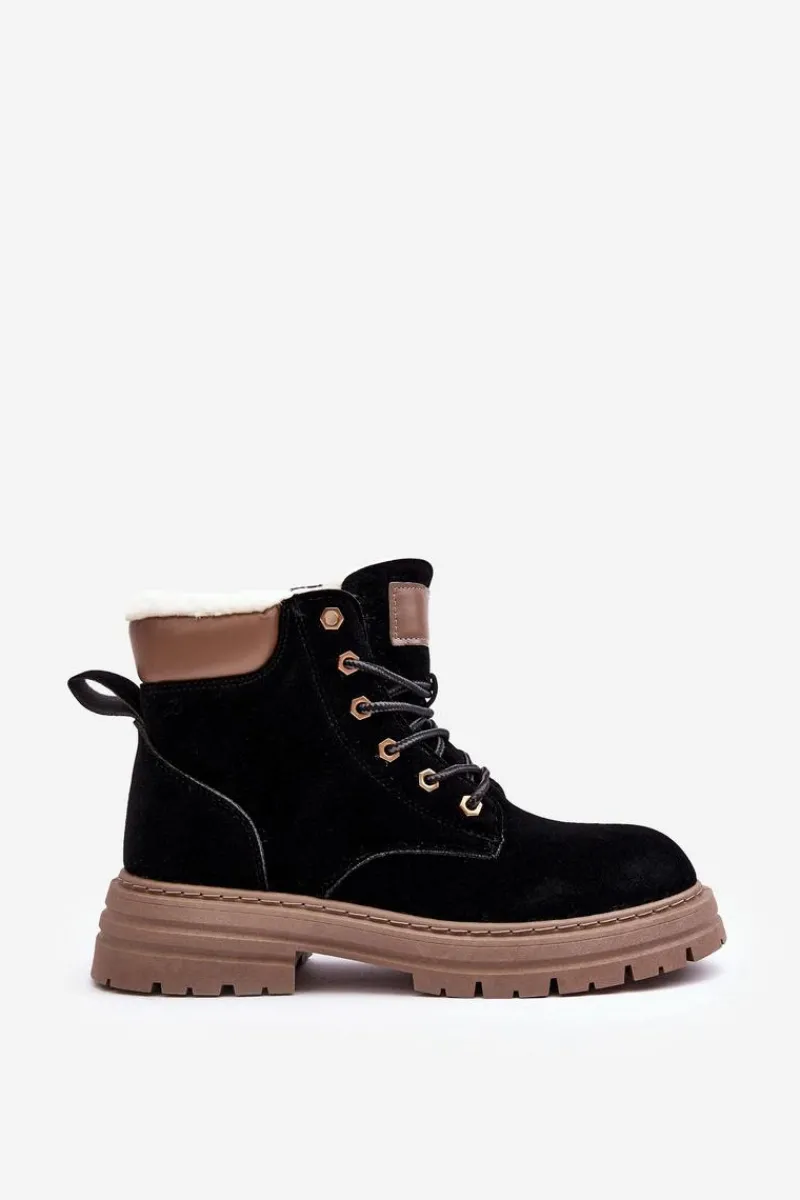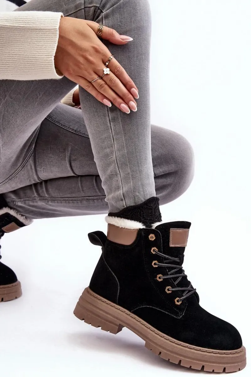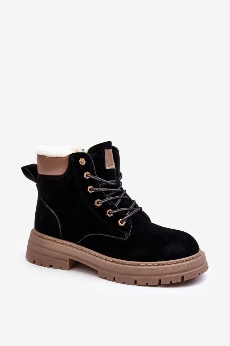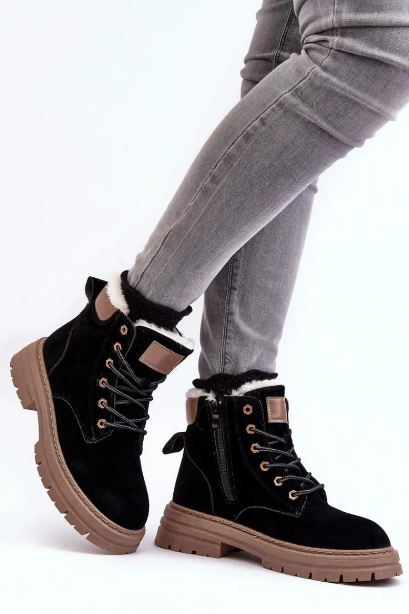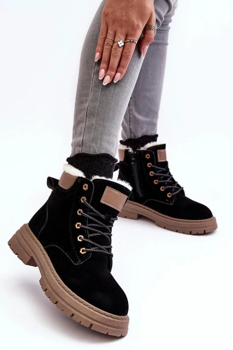 Klasyczne trapery damskie wykonane z eko skóry. Osadzone na platformie i płaskim obcasie. Zapinane na suwak z boku oraz dodatkowo posiadają sznurowanie. Środek ocieplony grubym futerkiem. Ten model traperów zachwyci każdego! Przy wyborze rozmiaru prosimy sugerować się tabelą rozmiarów.