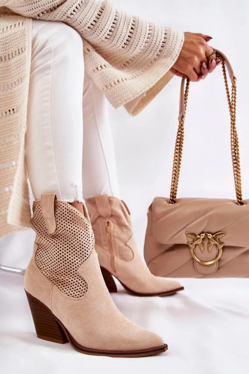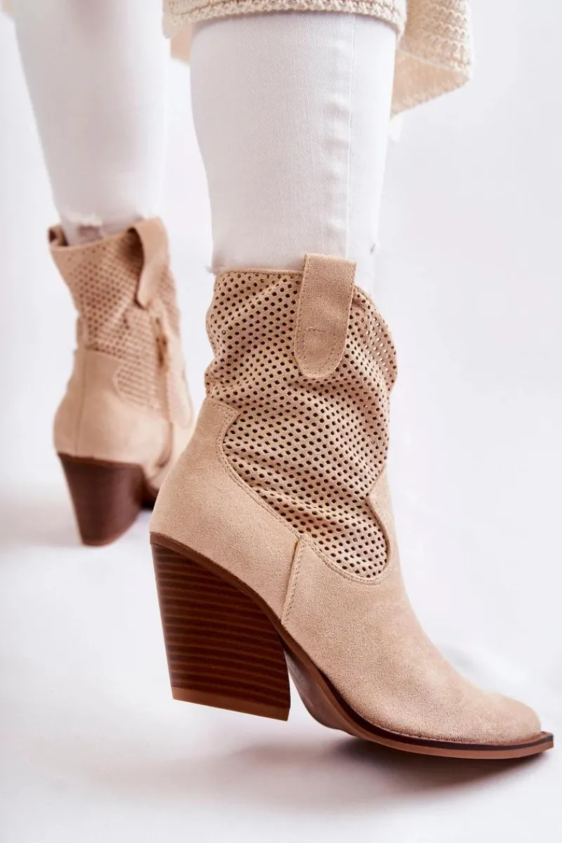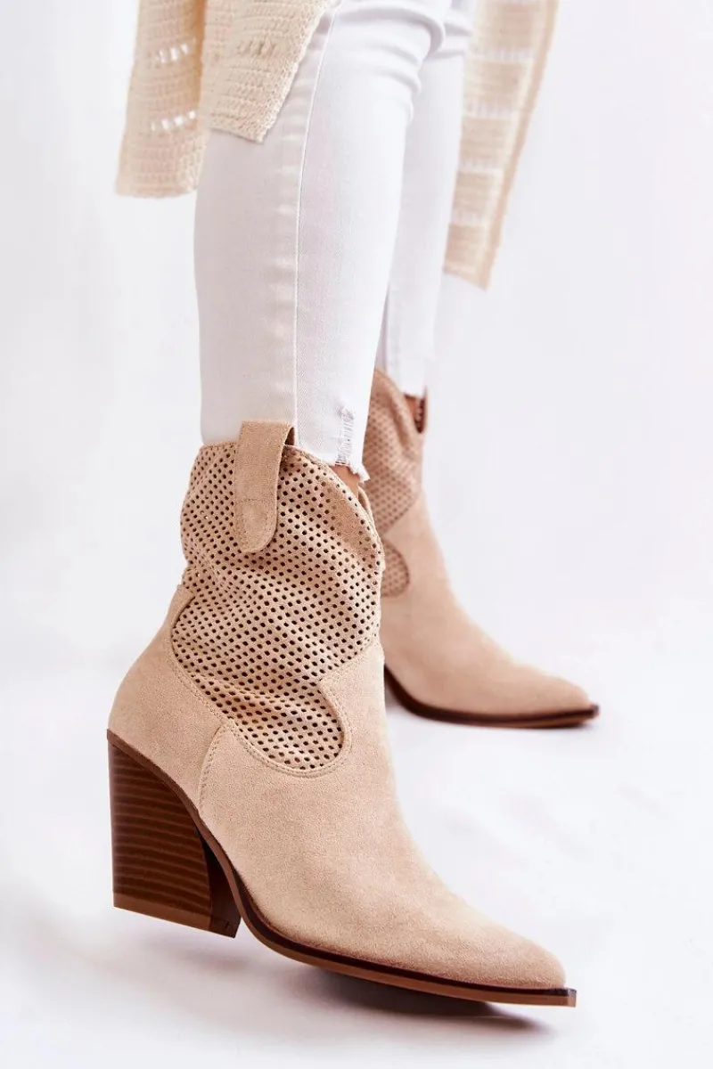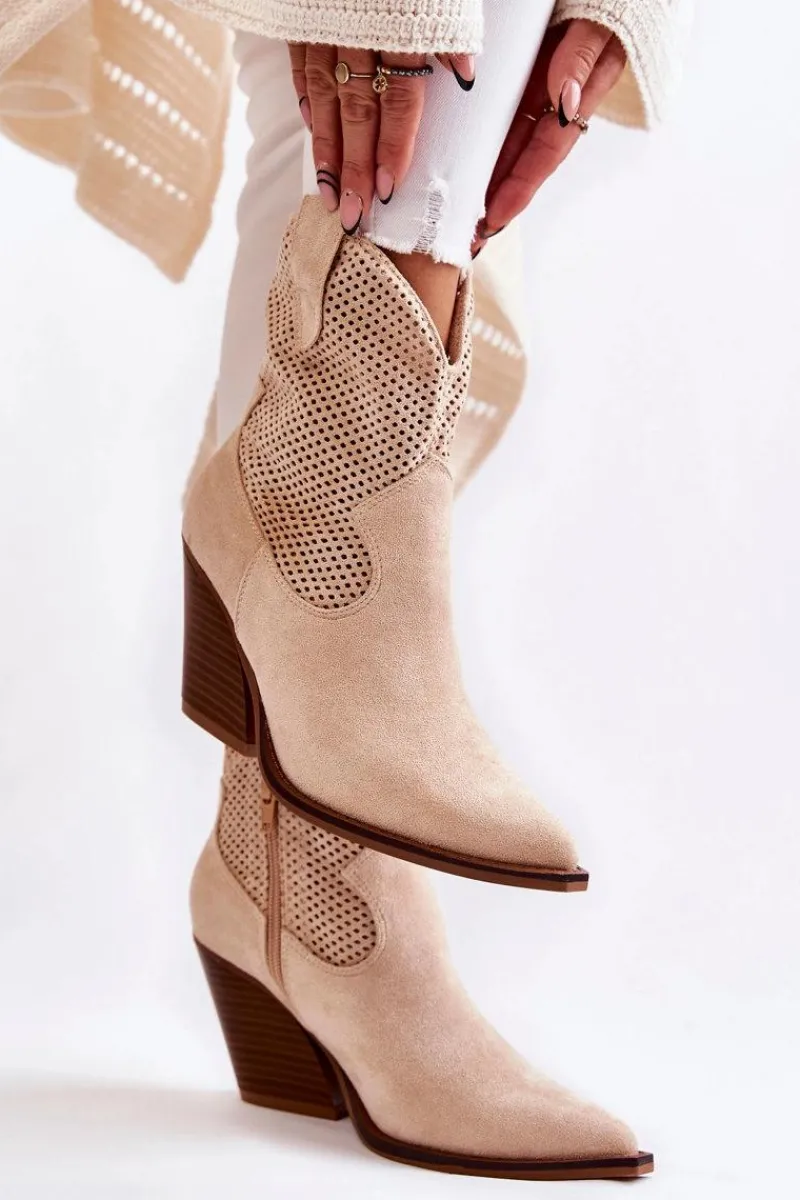 Świetne botki damskie wykonane z eko zamszu w ażurowy wzór. Posiadają usztywniany zapiętek oraz nosek w szpic charakterystyczny dla fasonu kowbojek. Model wsuwany z dodatkowym suwakiem z boku cholewki. Osadzone na masywnym obcasie w postaci ściętego słupka. Botki te to idealny model na sezon przejściowy. Świetnie będą prezentować się w wielu stylizacjach. Przy wyborze rozmiaru prosimy sugerować się tabelą rozmiarów.