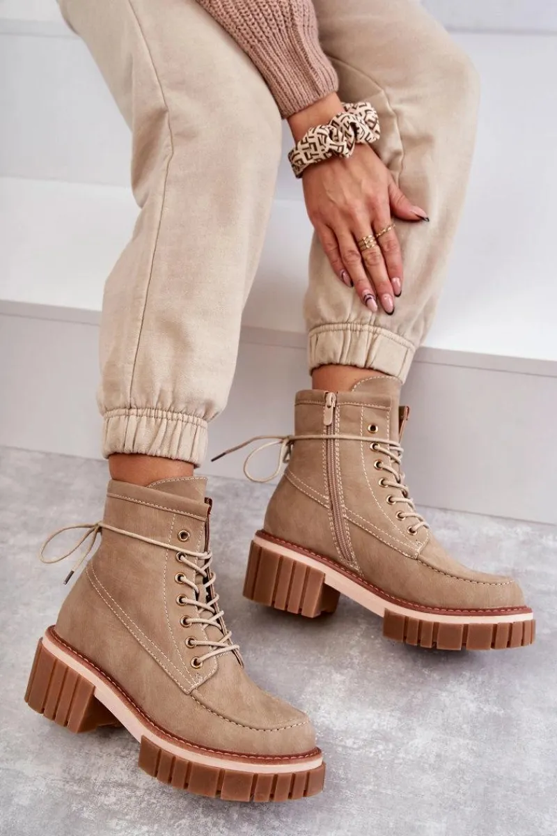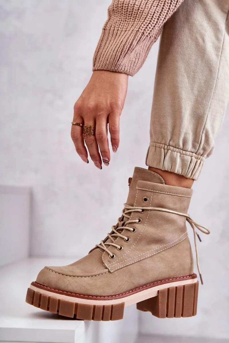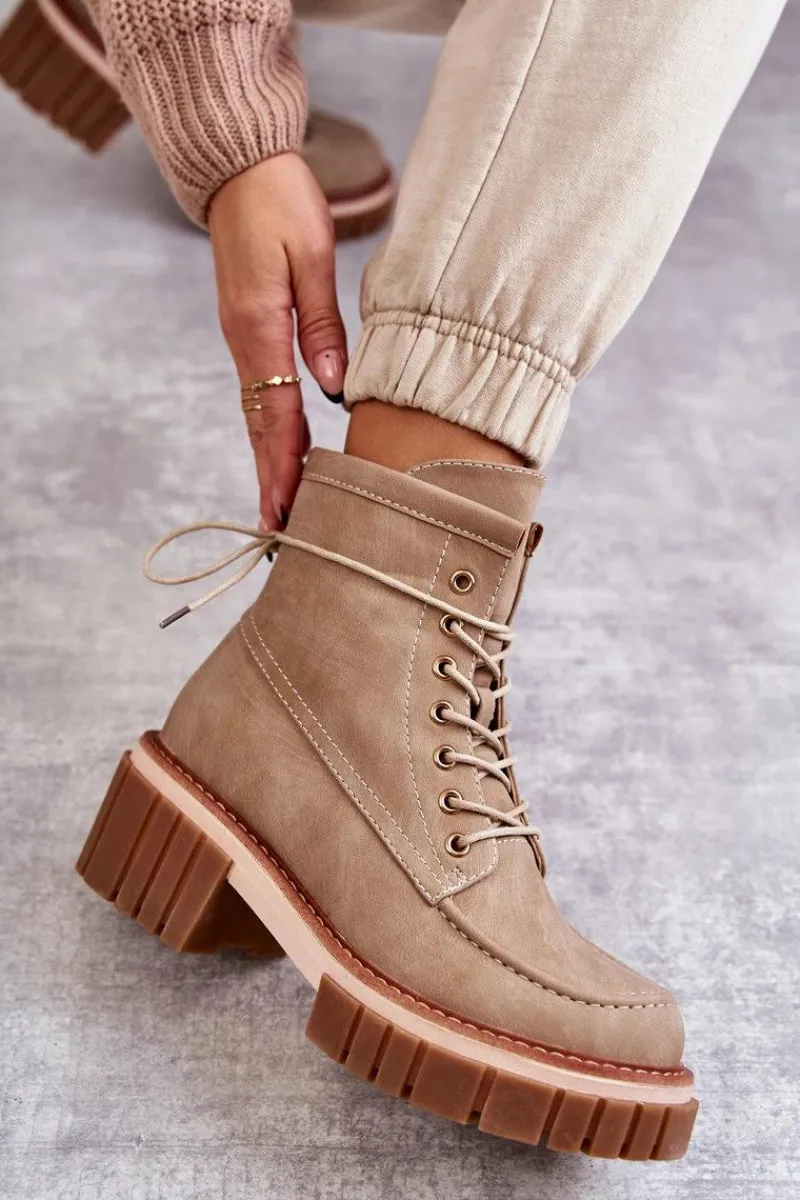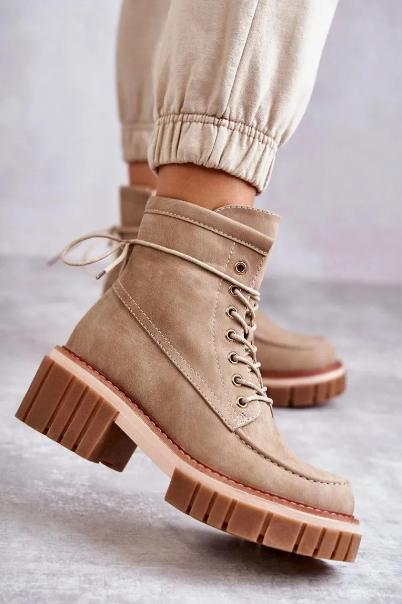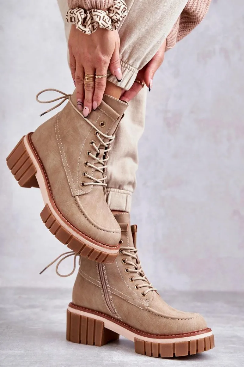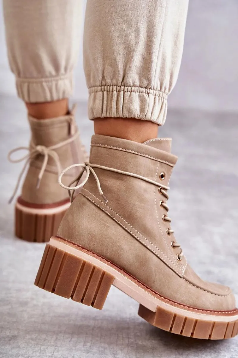 Wyjątkowe trapery damskie świetnie sprawdzą się w sezonie jesienno-zimowym. Wykonane z wysokiej jakości eko skóry. Modne przeszycia na cholewce. Botki osadzone na masywnej platformie i płaskim obcasie ze żłobieniami po bokach oraz obszytą nicią podeszwą. Ocieplone miłym w dotyku kocem obuwniczym. Podeszwa jest antypoślizgowa. Przy wyborze rozmiaru prosimy sugerować się tabelą rozmiarów.