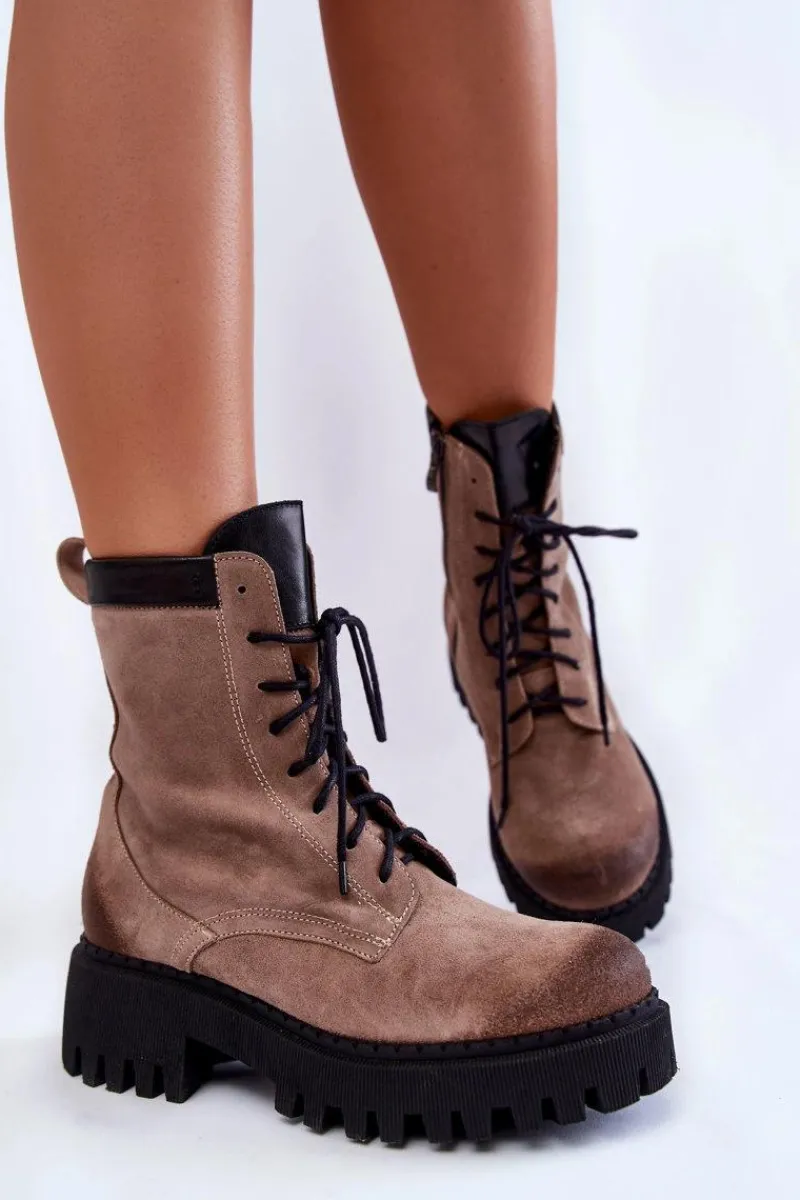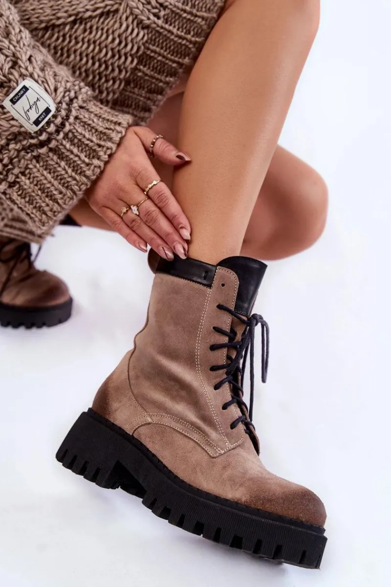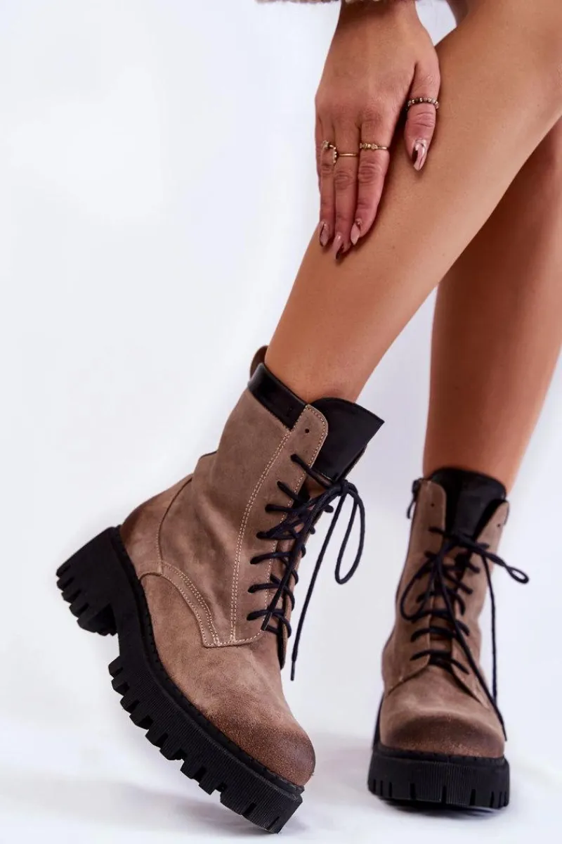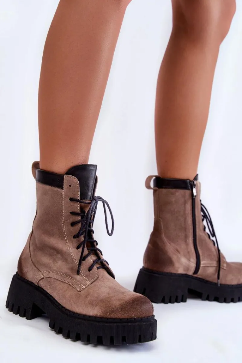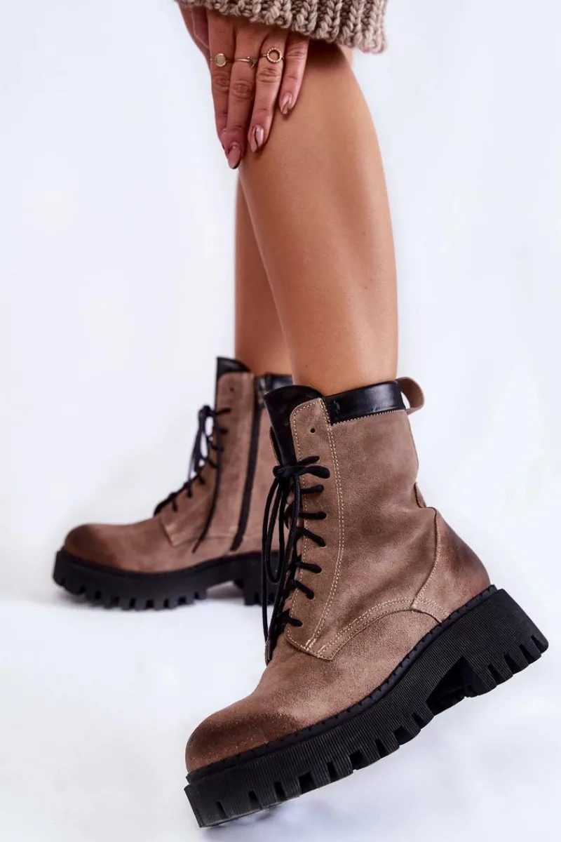 Klasyczne botki damskie zostały wykonane z wysokiej jakości naturalnych skór. Model ten posiada klasyczne sznurowanie oraz suwak z boku cholewki. Modne przetarcia na przodzie oraz tyle buta. Usztywniany zapiętek zapewni stabilizację stopy. Botki zostały ocieplone kocem obuwniczym. Osadzone na płaskim obcasie i platformie ze żłobieniami. Przy wyborze rozmiaru prosimy sugerować się tabelą rozmiarów.
