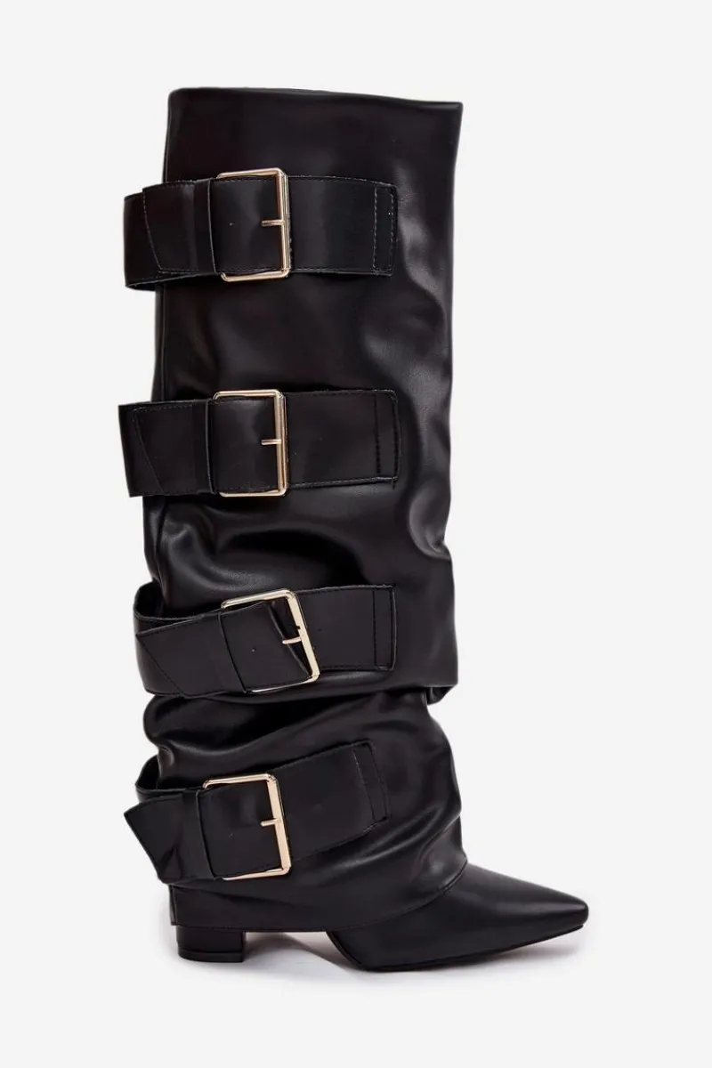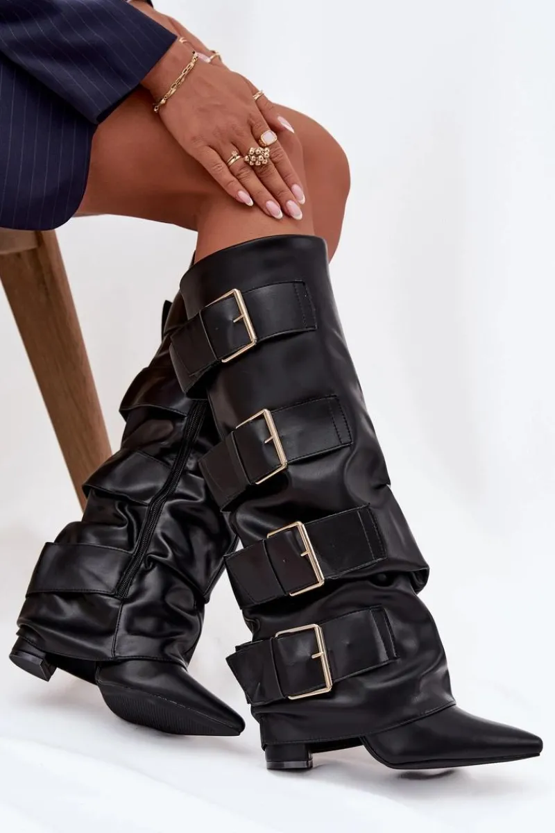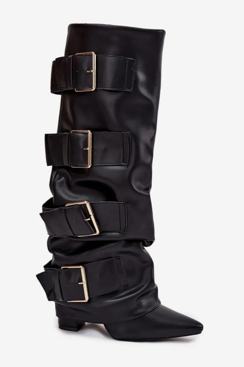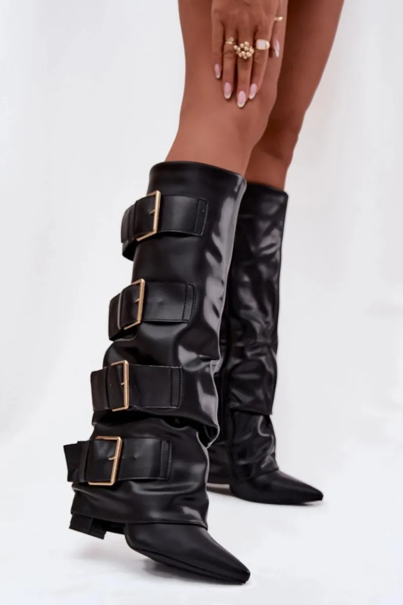 Stylowe kozaki damskie z eko skóry to połączenie elegancji i nowoczesnego wyglądu. Osadzone na obcasie typu słupek, ze szpiczastymi noskami, podkreślają kobiecą sylwetkę. Wywinięta cholewka, ozdobiona złotymi klamrami, przyciąga wzrok i dodaje charakteru, a zamek ułatwia szybkie zakładanie i zdejmowanie. Doskonale komponują się z sukienkami i spódnicami, wprowadzając modny, wyrafinowany akcent do każdej stylizacji. Przy wyborze rozmiaru prosimy sugerować się tabelą rozmiarów.