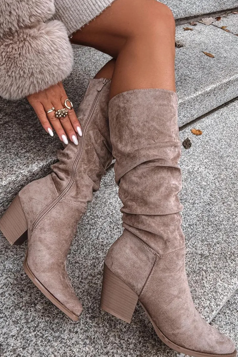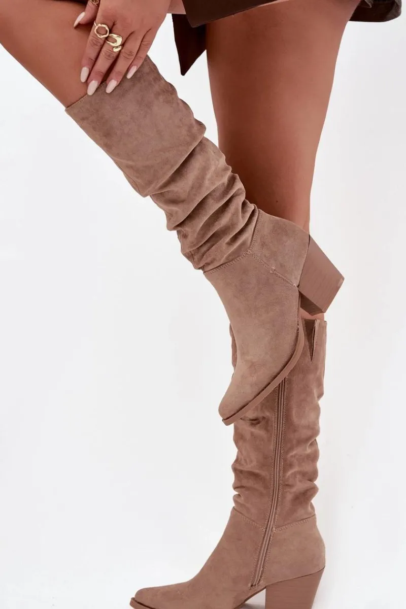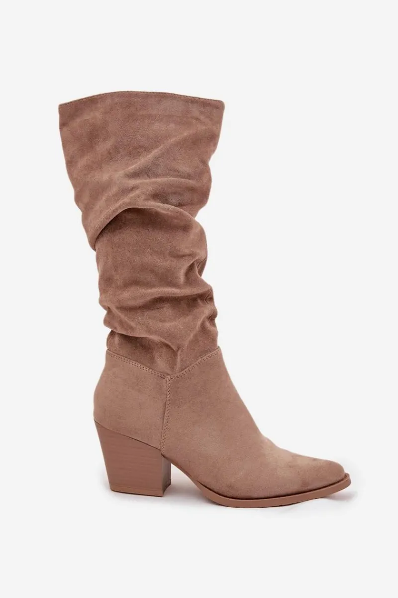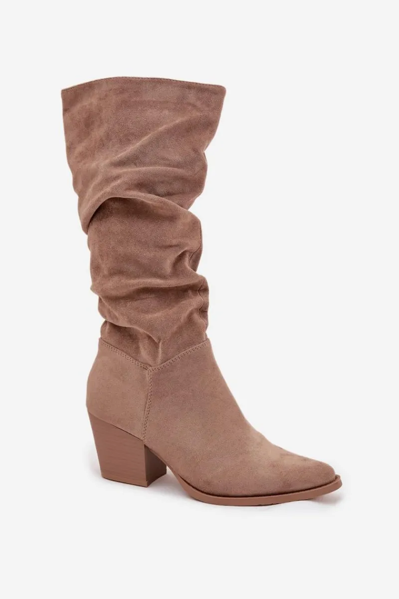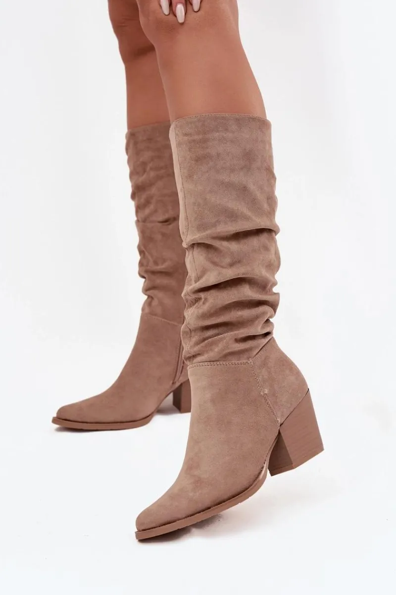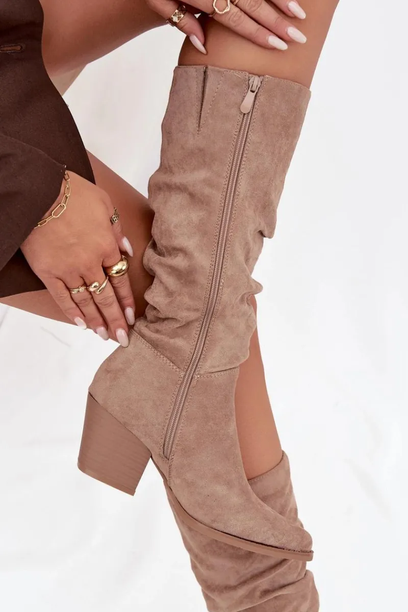 Kozaki damskie wykonane z eko zamszu to stylowa propozycja dla kobiet ceniących elegancję w modnym wydaniu. Model wyróżnia się marszczoną cholewką, która dodaje całości oryginalnego charakteru. Osadzone na stabilnym, ściętym obcasie typu słupek, subtelnie wysmuklają sylwetkę, zapewniając jednocześnie wygodę podczas noszenia. Szpiczaste noski podkreślają kobiecy styl, a praktyczne zapięcie na zamek ułatwia zakładanie. Wnętrze ocieplane miękkim kocem obuwniczym gwarantuje ciepło w chłodniejsze dni. To kozaki, które doskonale dopełnią zarówno eleganckie, jak i codzienne stylizacje. Przy wyborze rozmiaru prosimy sugerować się tabelą rozmiarów.