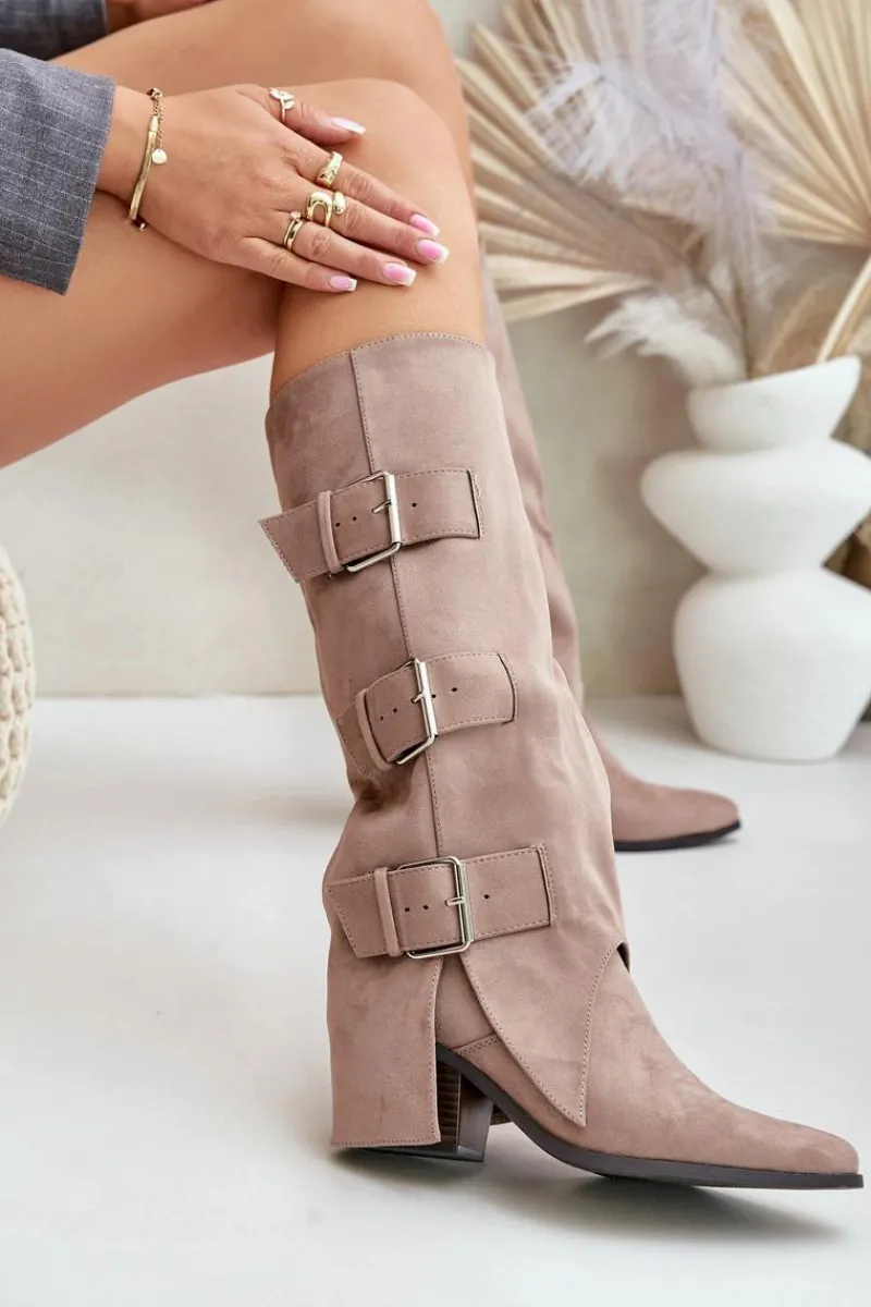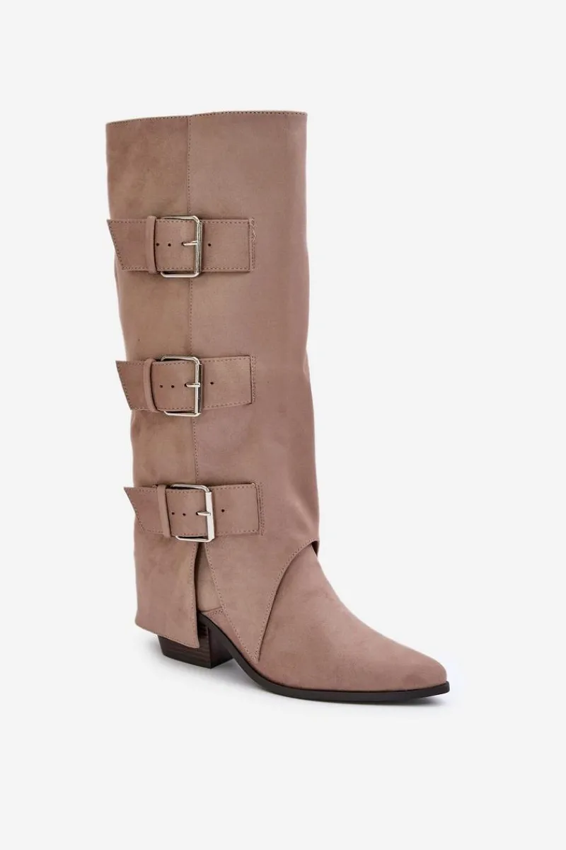 Stylowe kozaki damskie wykonane z eko zamszu. Osadzone na obcasie w formie słupka. Noski w szpic. Środek ocieplony kocem obuwniczym. Głównym atutem tego modelu jest wywinięta cholewka ozdobiona złotymi klamrami. Model wsuwany z dodatkowym suwakiem na dole. Idealnie sprawdzą się w stylizacjach z luźnymi marynarkami, spódnicami i sukienkami! Koniecznie powinnaś je mieć! Przy wyborze rozmiaru prosimy sugerować się tabelą rozmiarów.