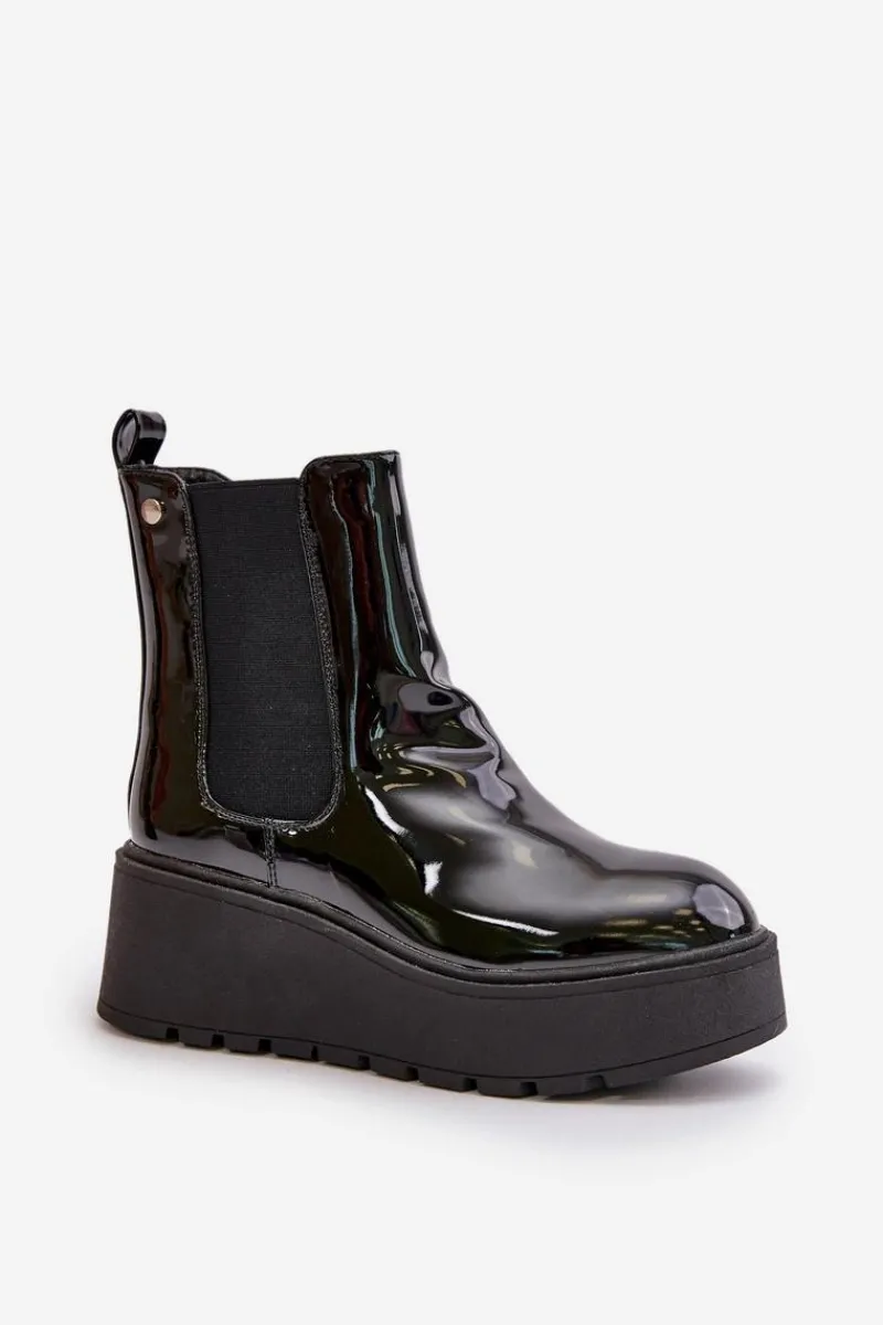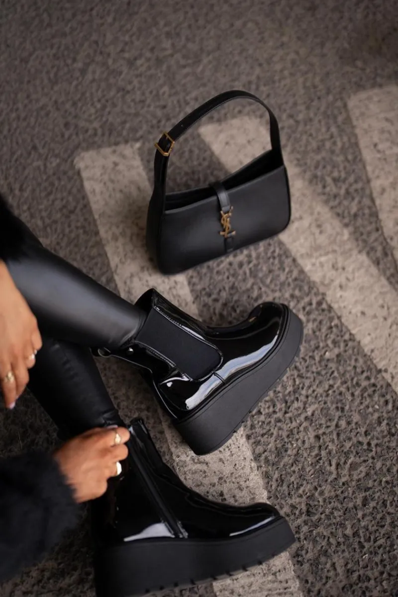 Stylowe lakierowane botki na platformie i koturnie, które łączą elegancję z wygodą. Zapinane na zamek, co zapewnia łatwe zakładanie i zdejmowanie. Wnętrze ocieplone kocem obuwniczym, gwarantując ciepło w chłodniejsze dni. Idealne na jesień i zimę, te botki będą doskonałym uzupełnieniem wielu modnych stylizacji. Przy wyborze rozmiaru prosimy sugerować się tabelą rozmiarów.