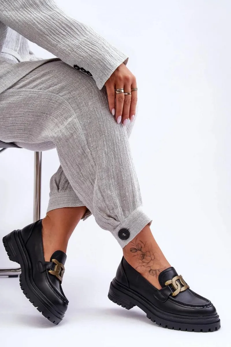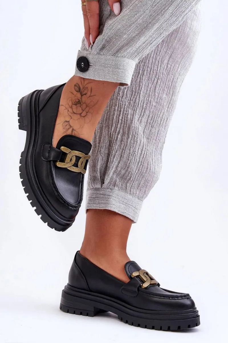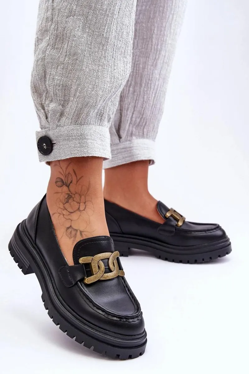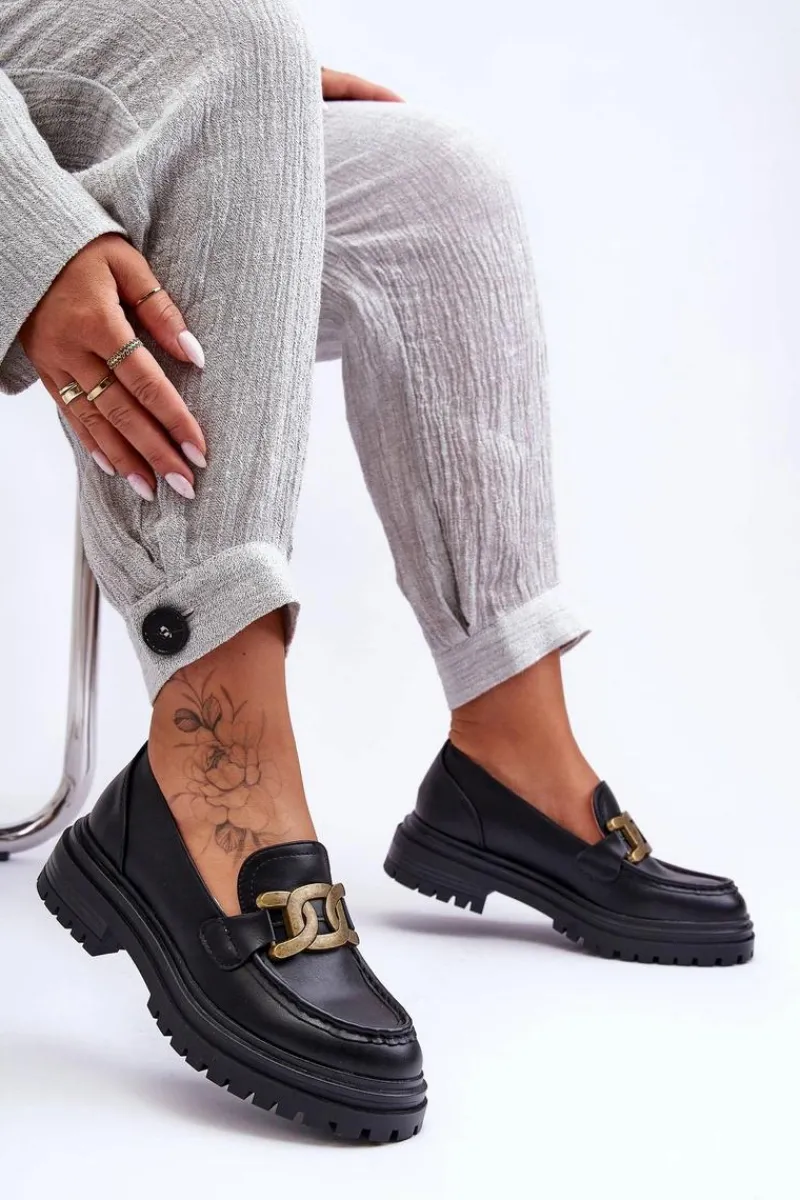 Stylowe, damskie mokasyny świetnie sprawdzą się do wielu stylizacji! Wykonane zostały z eko skóry. Model ten osadzony jest na masywnej platformie i płaskim obcasie. Z przodu znajduje się ozdoba. Koniecznie powinnaś je mieć! Przy wyborze rozmiaru prosimy sugerować się tabelą rozmiarów.