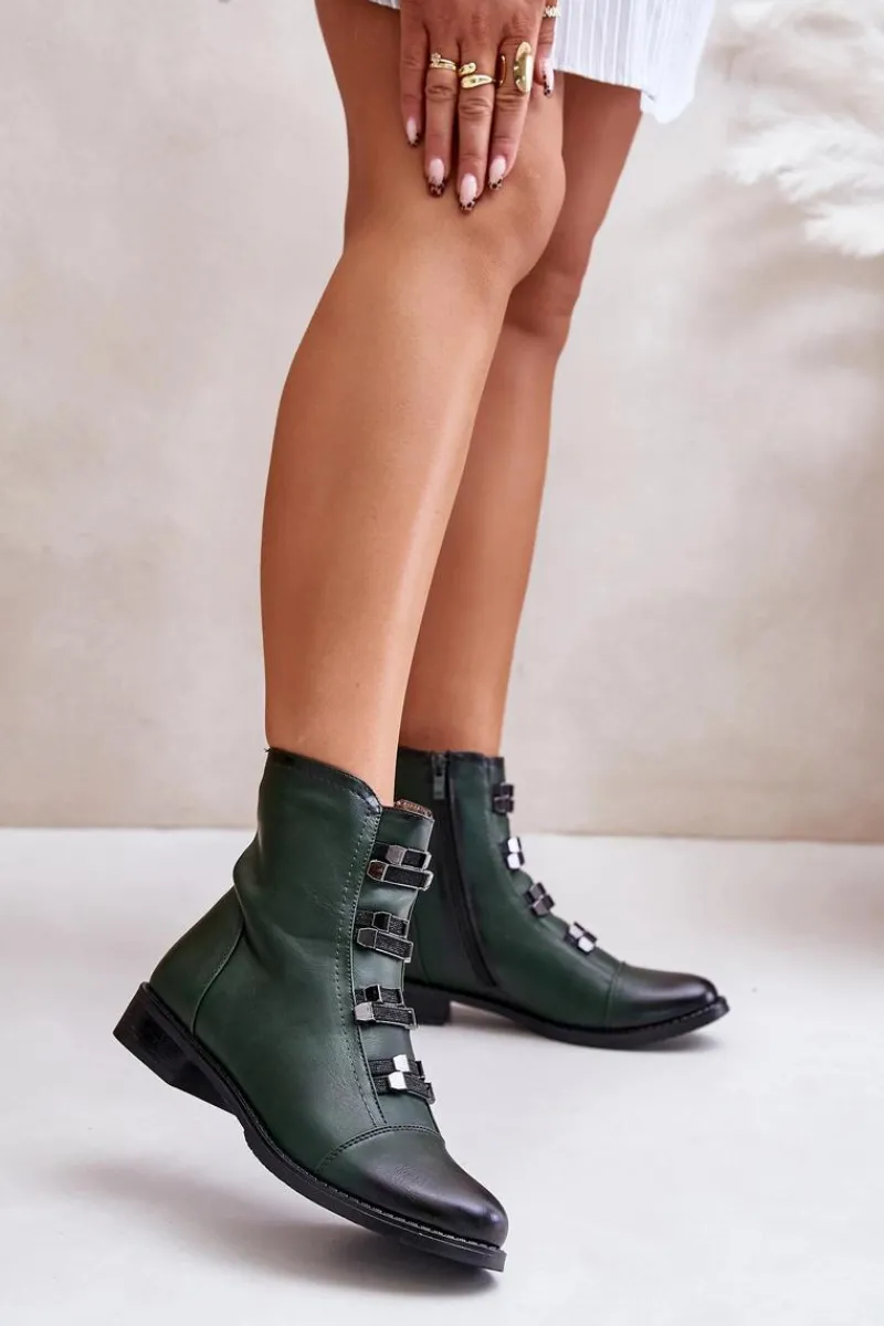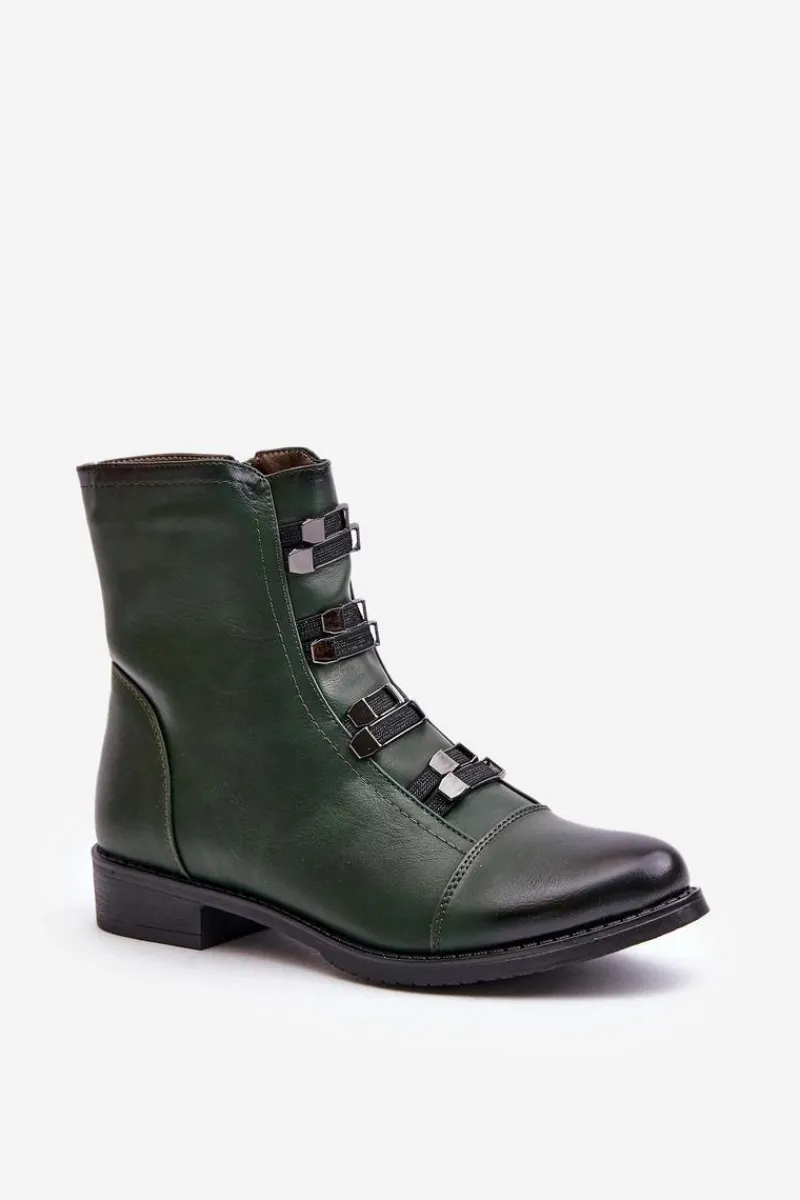 Botki marki Jezzi wykonane z eko skóry, które łączą styl z wygodą. Osadzone na płaskim obcasie, z zaokrąglonymi noskami, zapewniają komfort noszenia na co dzień. Zapinane na zamek, co ułatwia zakładanie i zdejmowanie. Model ten wyróżnia się ozdobnymi gumkami z przodu. Wnętrze ocieplane kocem obuwniczym. Te botki to świetny wybór na jesienne i zimowe stylizacje.Przy wyborze rozmiaru prosimy sugerować się tabelą rozmiarów.