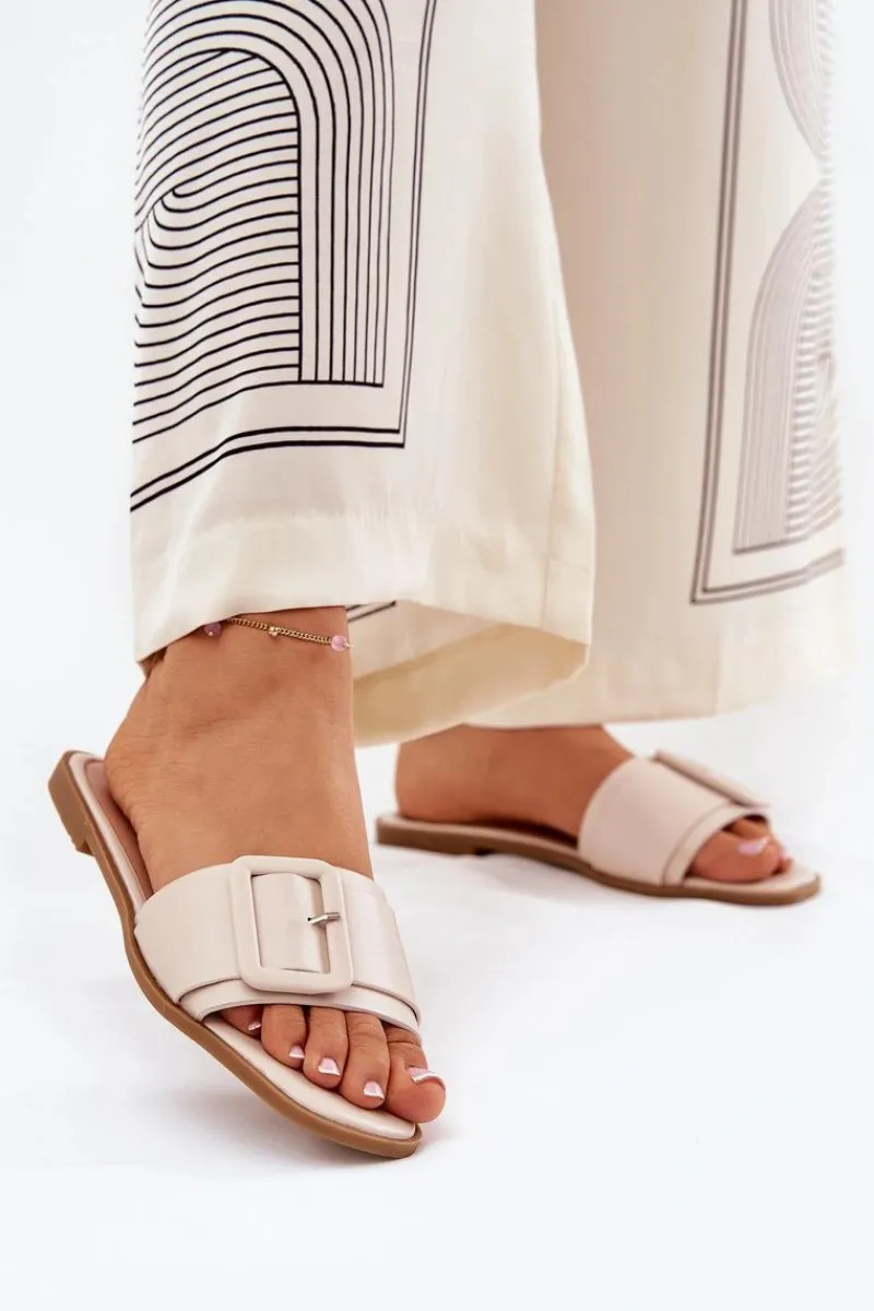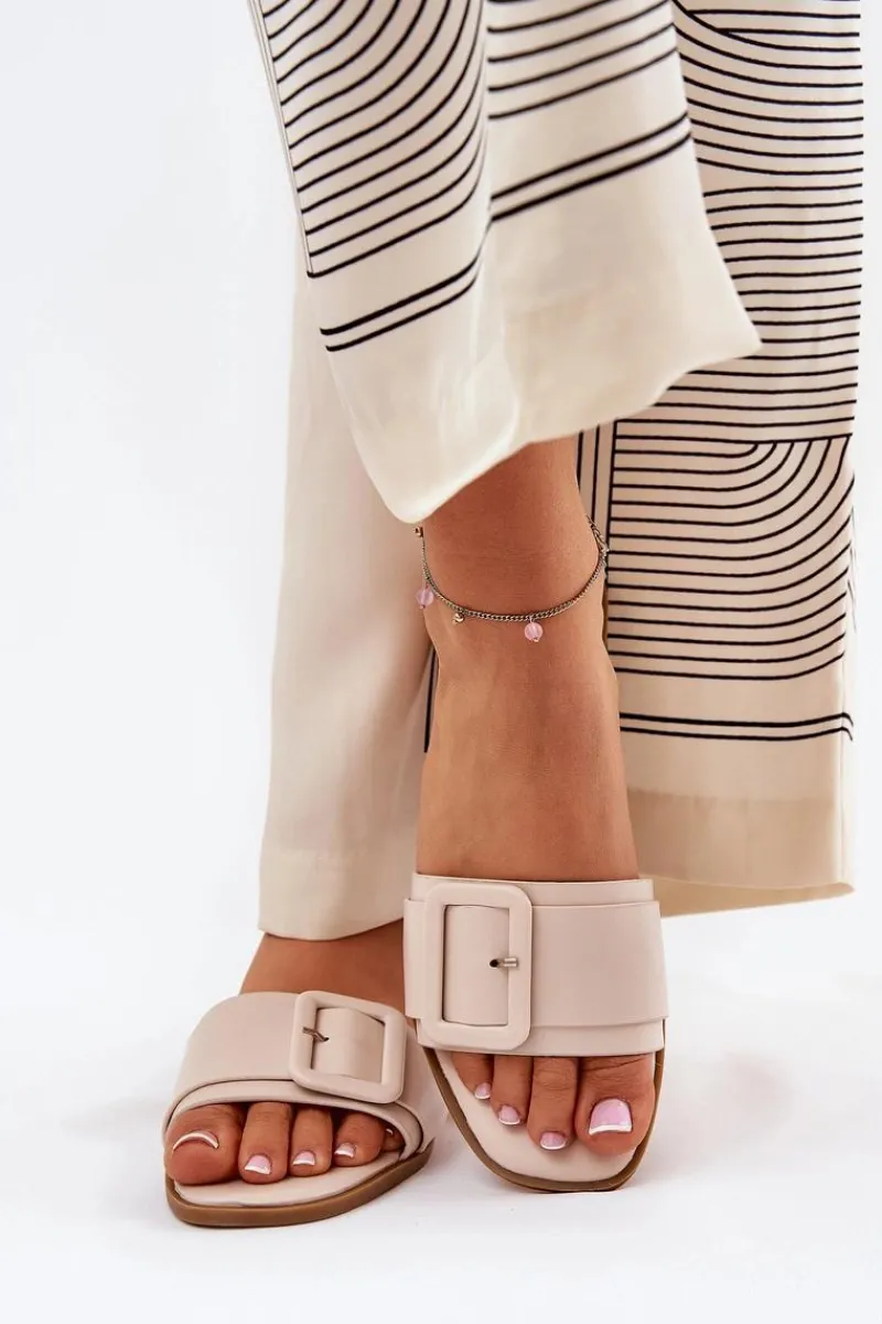 Klasyczne klapki damskie z eko skóry, osadzone na płaskim obcasie, które łączą wygodę z eleganckim wyglądem. Duża klamra na pasku dodaje im subtelnego charakteru. Idealne na co dzień, te klapki doskonale komponują się z letnimi stylizacjami, zapewniając komfort i prostą elegancję przez cały dzień. Przy wyborze rozmiaru prosimy sugerować się tabelą rozmiarów.