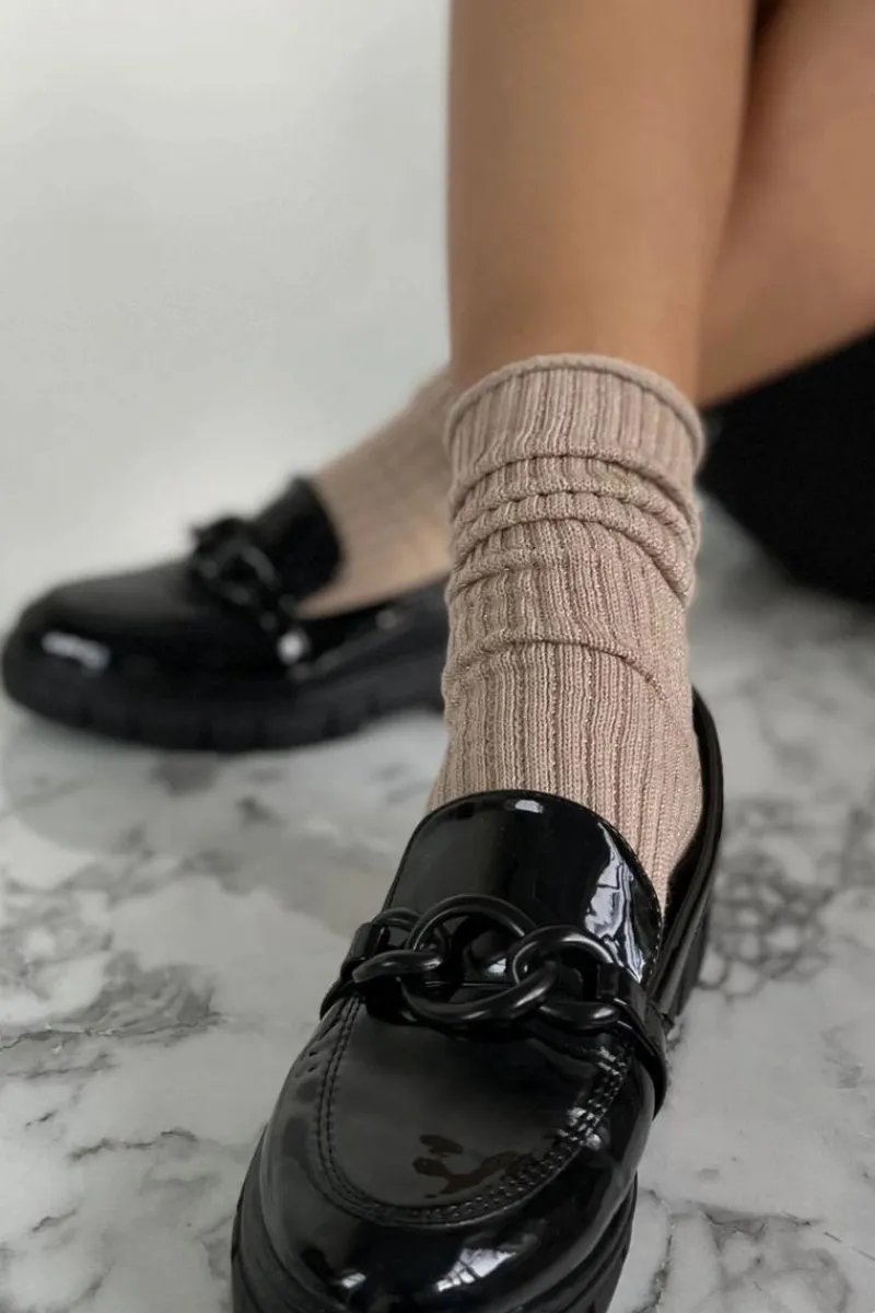Damskie skarpety z delikatnym prążkowanym ściągaczem nieuciskającym nogi. Ściągacz może być marszczony, tworząc efektowny akcent w stylizacji. Miękkie w dotyku, zapewniają wysoki komfort noszenia.