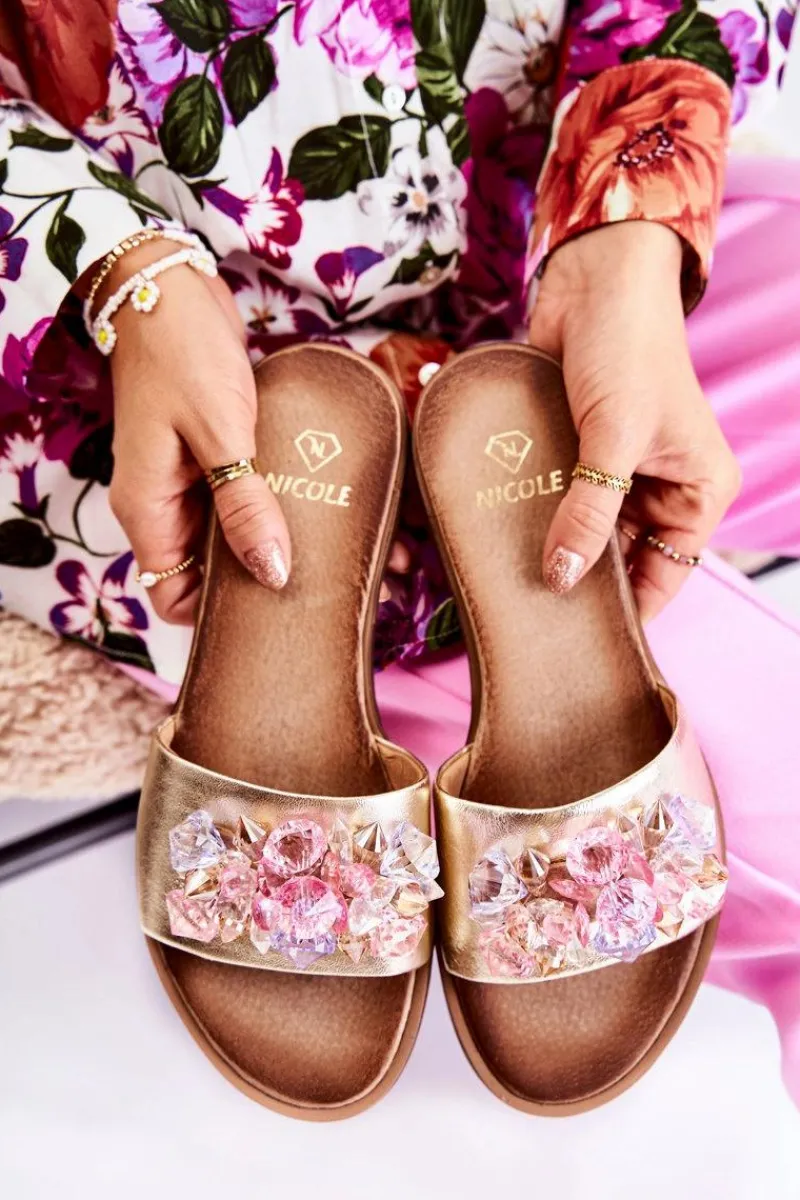 Klasyczne, wsuwane klapki marki Nicole. Buty wykonane są w całości ze skóry naturalnej z dbałością o szczegóły. Posiadają ozdobę na przodzie w postaci kolorowych kryształków. Miękka wkładka także została wykonana z naturalnej skóry, dzięki której komfort użytkowania jest jeszcze większy. Buty osadzone na płaskim obcasie. Koniecznie sprawdź całą naszą kolekcję butów marki Nicole. Przy wyborze rozmiaru prosimy sugerować się tabelą rozmiarów.
