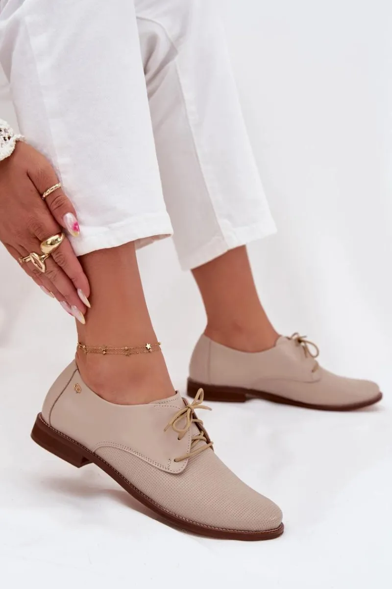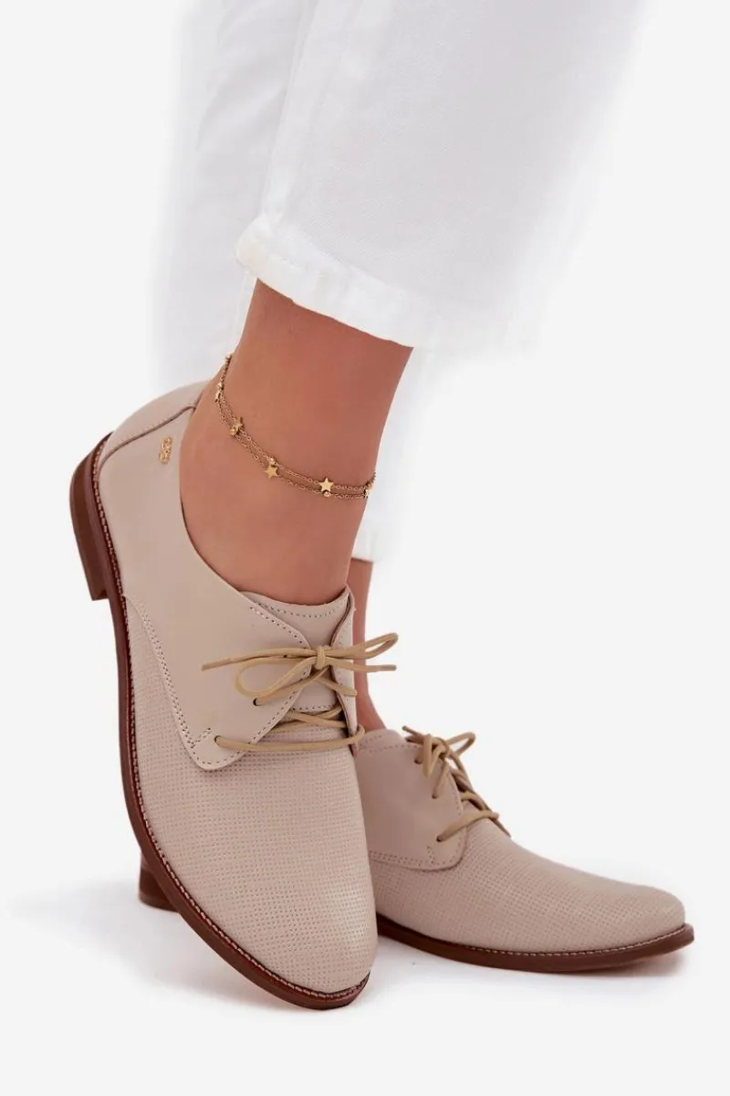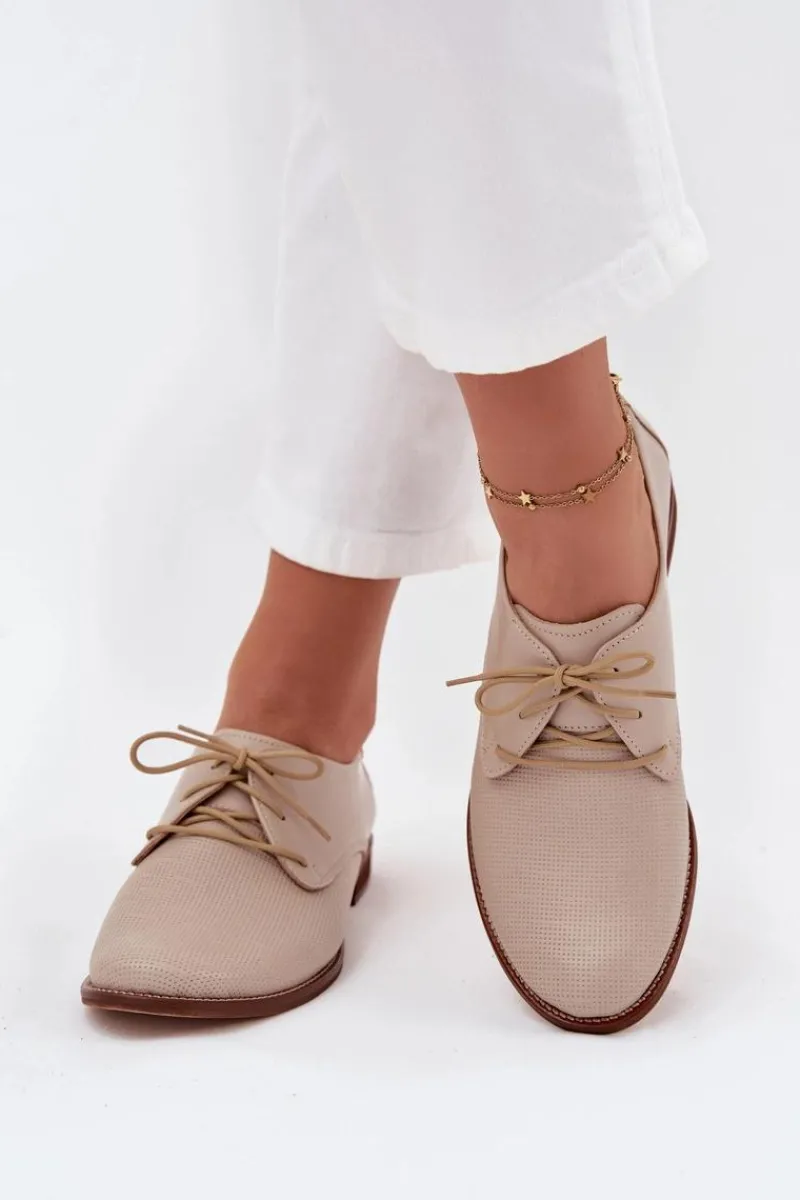 Eleganckie damskie półbuty wykonane z wysokiej jakości skóry naturalnej to połączenie klasyki z komfortem. Charakteryzują się płaskim obcasem, który zapewnia wygodę przez cały dzień. Noski zaokrąglone. Sznurowany, lekki fason pozwala na idealne dopasowanie, a elegancki wygląd sprawia, że świetnie komponują się zarówno z codziennymi, jak i bardziej formalnymi stylizacjami. Przy wyborze rozmiaru prosimy sugerować się tabelą rozmiarów.