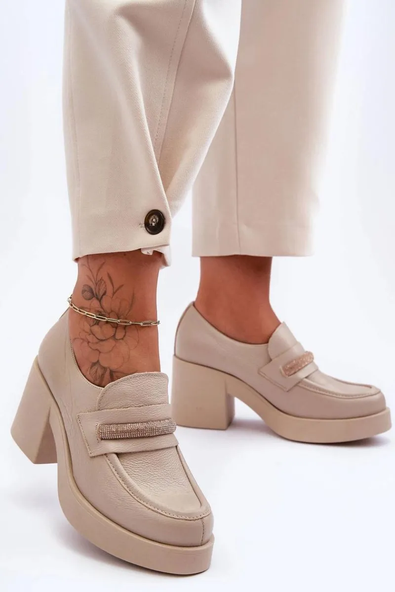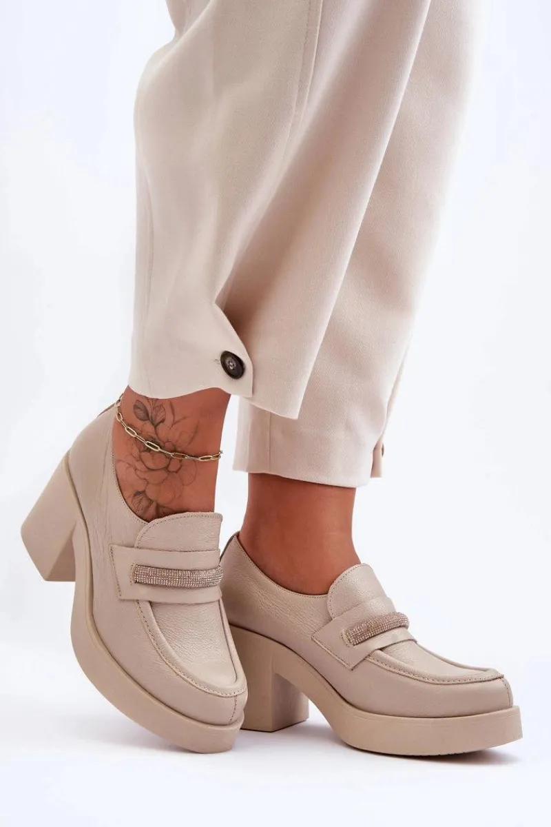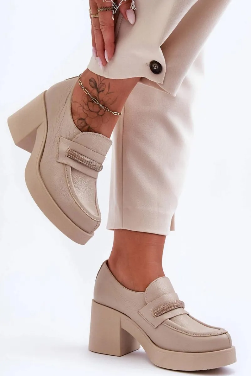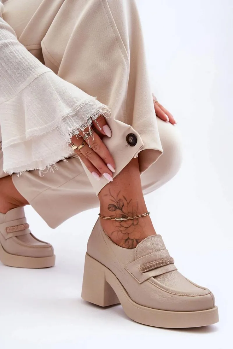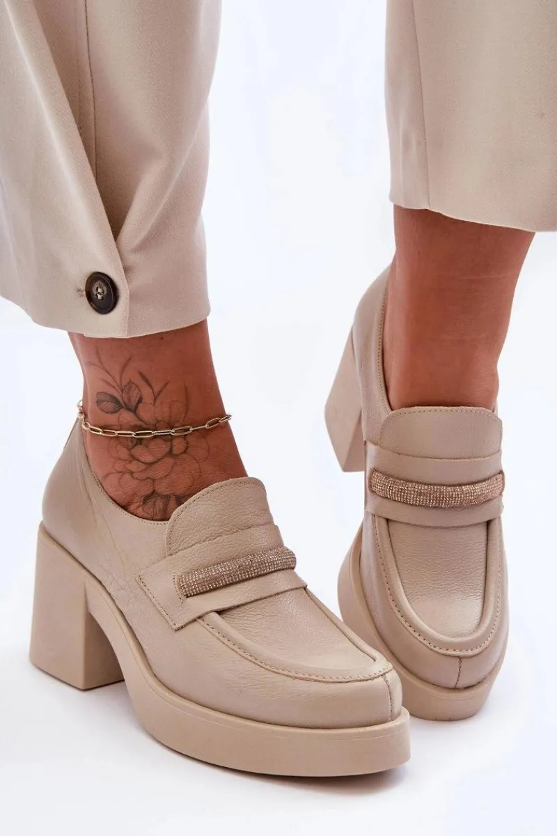 Damskie półbuty na obcasie z cholewką wykonaną ze skóry naturalnej. Wnętrze zostało pokryte również skórą naturalną dzięki temu są bardzo komfortowe w użytkowaniu. Z przodu znajduje się błyszcząca ozdoba. Stylowy obcas w postaci szerokiego słupka zapewni stabilizację na każdym kroku. Zapiętek jest usztywniany. Dodatkowo pod językiem znajduje się gumka ściągająca, która sprawi, że but będzie idealnie dopasowany do stopy. Przy wyborze rozmiaru prosimy sugerować się tabelą rozmiarów.