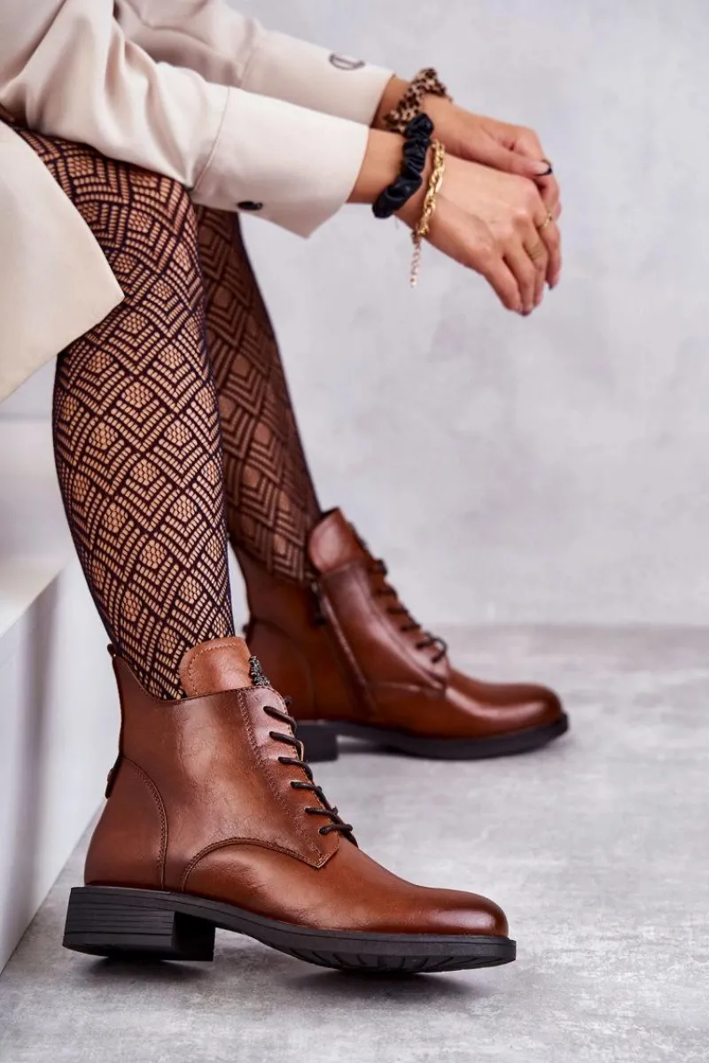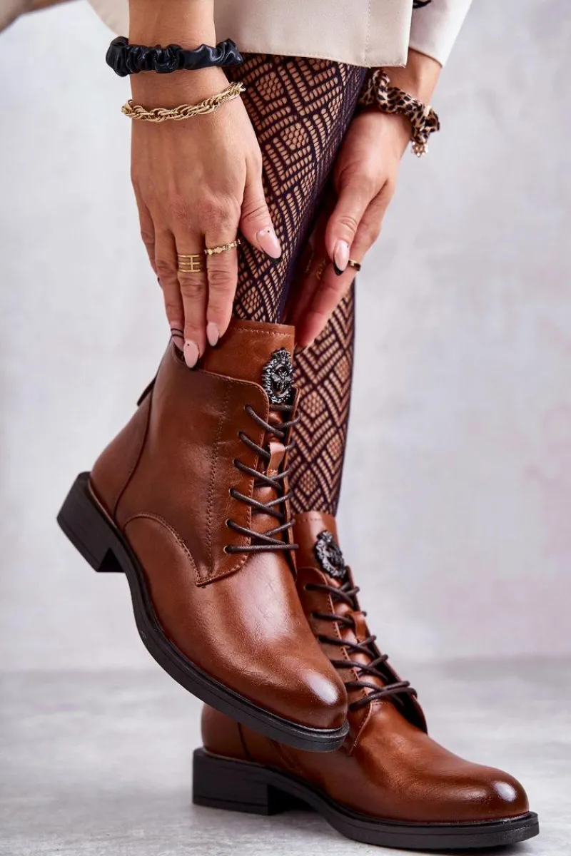 Botki damskie z cholewką wykonaną z eko skóry. Botki na języku zostały przyozdobione elementem z tworzywa sztucznego, który nadaje im niepowtarzalny wygląd. Model klasycznie sznurowany. Buty te zostały osadzone na płaskim obcasie. Środek ocieplony kocem obuwniczym sprawi, że chłodne dni nie będą już takie straszne! Ten model powinien być Twój! Przy wyborze rozmiaru prosimy sugerować się tabelą rozmiarów.