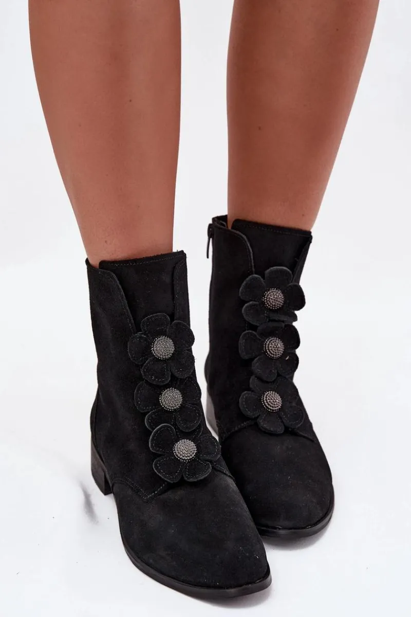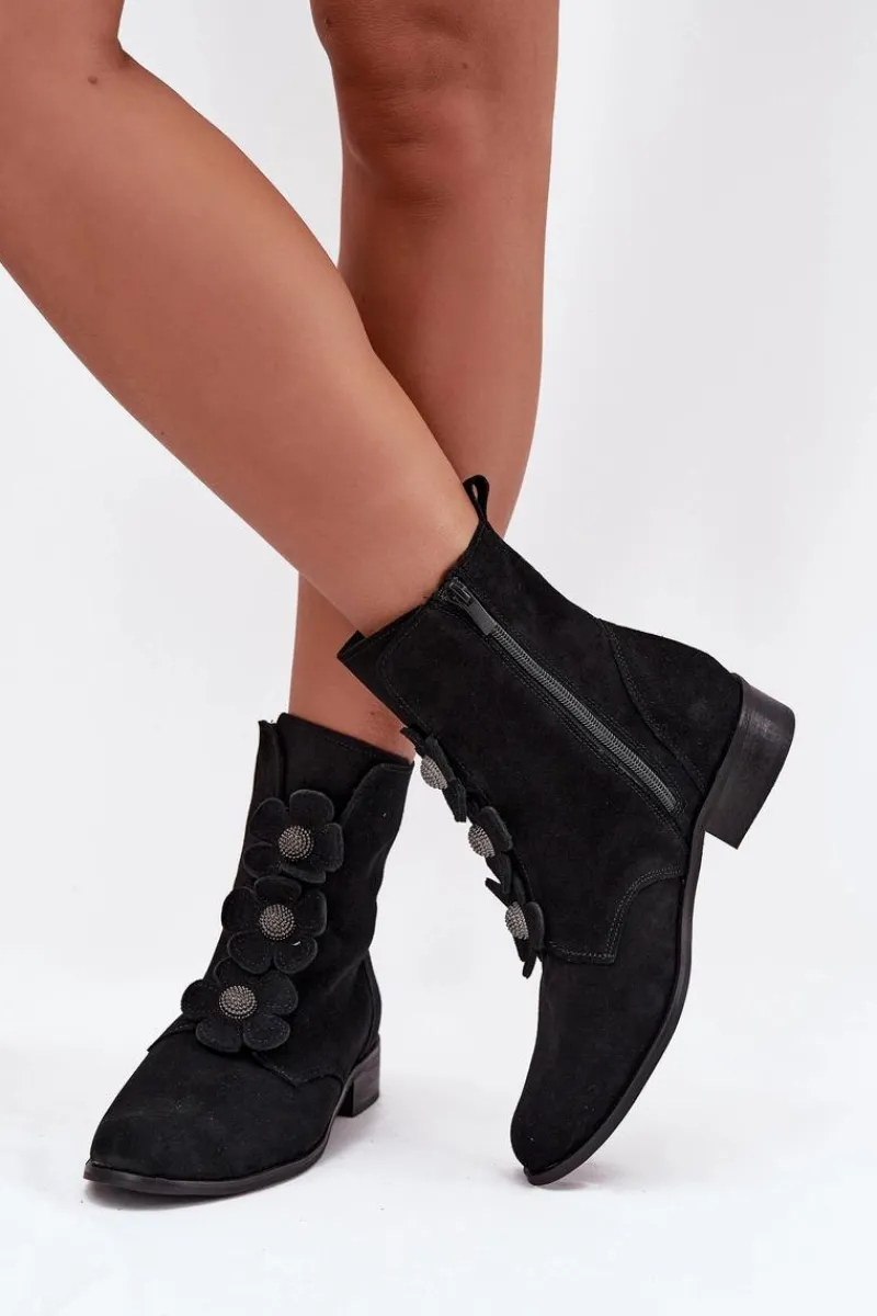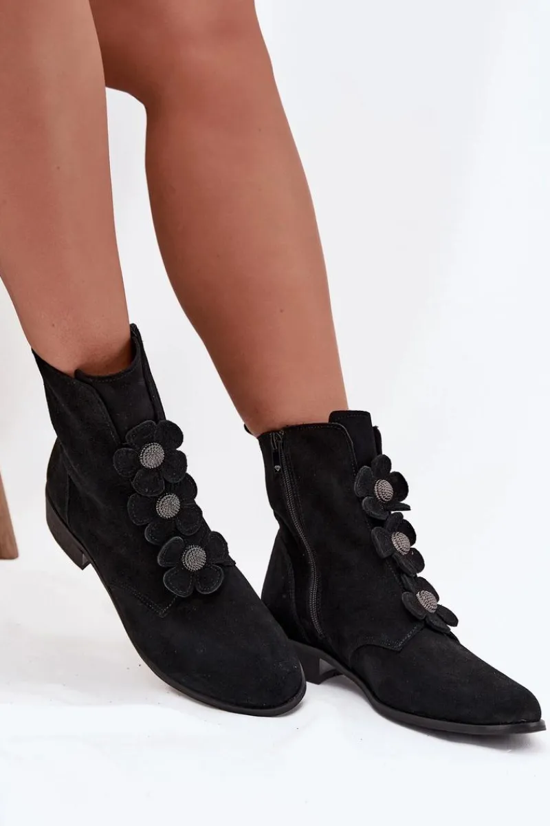 Botki damskie z naturalnego zamszu to doskonały wybór dla kobiet ceniących elegancję i subtelność. Wykonane z wysokiej jakości materiału, oferują nie tylko estetyczny wygląd, ale także komfort noszenia przez cały dzień. Zapinane na zamek błyskawiczny. Przód buta ozdobiony jest pięknymi, urokliwymi kwiatkami, które nadają im niepowtarzalnego, delikatnego charakteru. Dzięki temu stanowią doskonały dodatek do zarówno codziennych, jak i bardziej eleganckich stylizacji. Świetnie komponują się z sukienkami, spódnicami czy spodniami. Przy wyborze rozmiaru prosimy sugerować się tabelą rozmiarów.