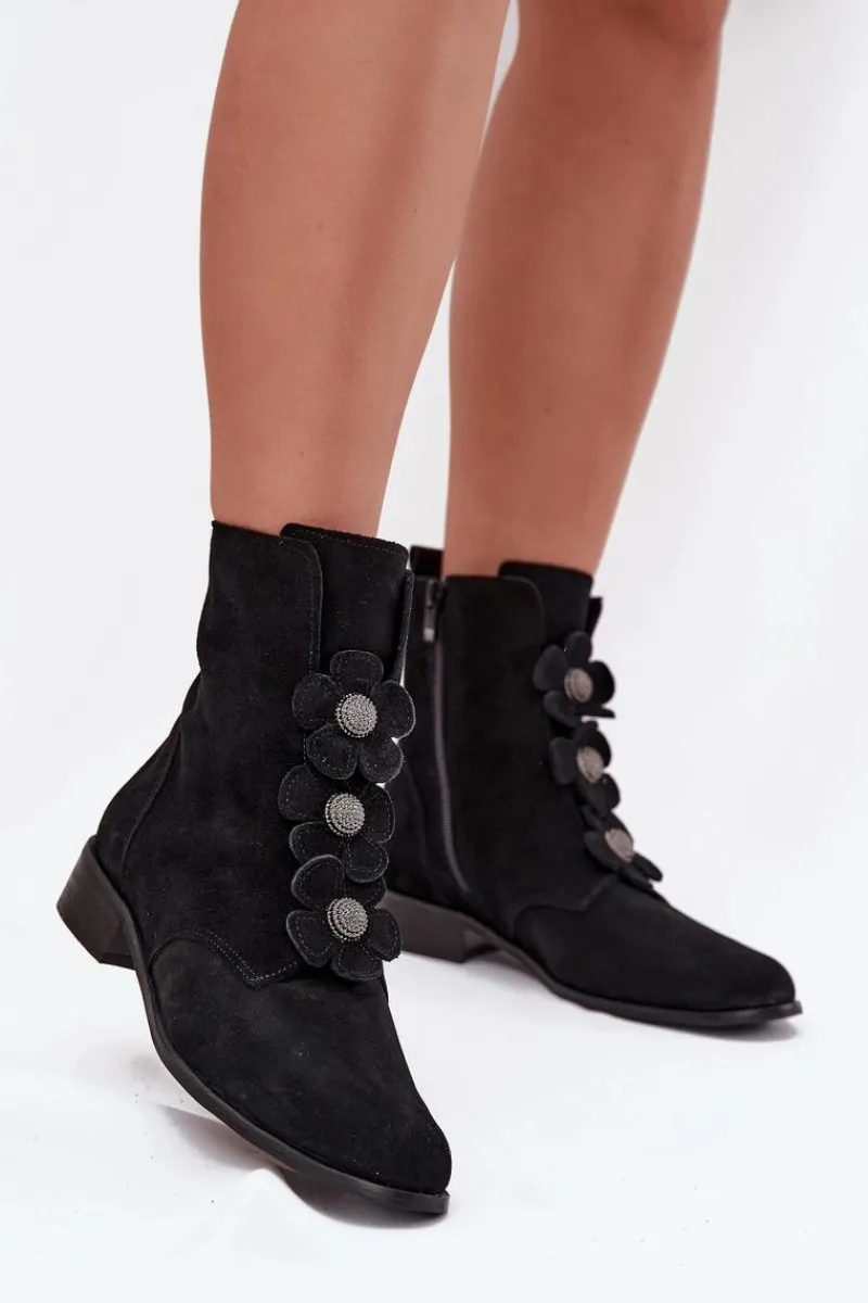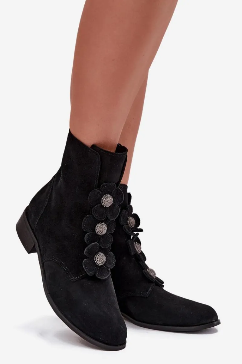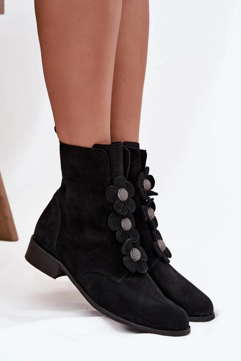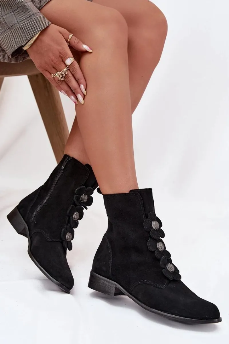 Botki damskie z naturalnego zamszu to doskonały wybór dla kobiet ceniących elegancję i subtelność. Wykonane z wysokiej jakości materiału, oferują nie tylko estetyczny wygląd, ale także komfort noszenia przez cały dzień. Zapinane na zamek błyskawiczny. Przód buta ozdobiony jest pięknymi, urokliwymi kwiatkami, które nadają im niepowtarzalnego, delikatnego charakteru. Dzięki temu stanowią doskonały dodatek do zarówno codziennych, jak i bardziej eleganckich stylizacji. Świetnie komponują się z sukienkami, spódnicami czy spodniami. Przy wyborze rozmiaru prosimy sugerować się tabelą rozmiarów.