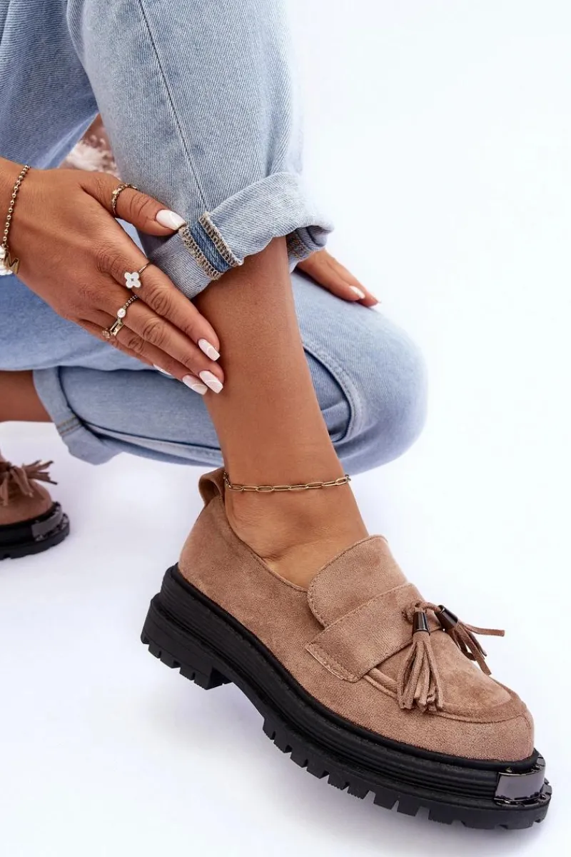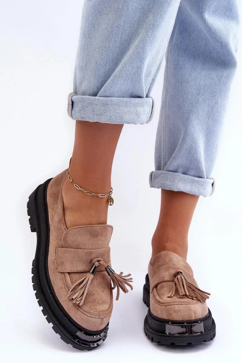 Damskie mokasyny to idealne obuwie na wiele okazji! Wykonane z eko zamszu. Osadzone na płaskim obcasie oraz platformie. Noski zaokrąglone. Przód ozdobiony paskiem z frędzlami. Miękka eko skórzana wkładka zapewni komfort podczas użytkowania. Dodatkowo zapiętek jest usztywniony. Ten model z pewnością przypadnie Ci do gustu! Przy wyborze rozmiaru prosimy sugerować się tabelą rozmiarów.
