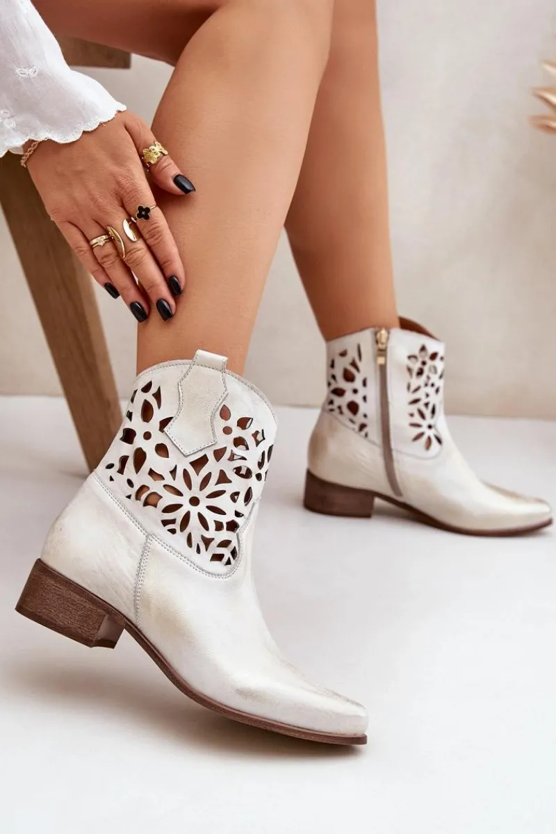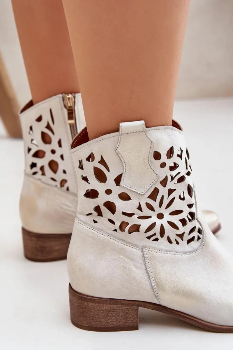 Botki damskie wykonane z naturalnej skóry. Osadzone na niskim obcasie, co sprawia, że są zarówno stylowe, jak i wygodne. Ażurowy wzorek na cholewce dodaje im elegancji. Model ten zapiany jest na zamek, co ułatwia zakładanie obuwia. Miękka wkładka gwarantuje komfort noszenia. Przy wyborze rozmiaru prosimy sugerować się tabelą rozmiarów.