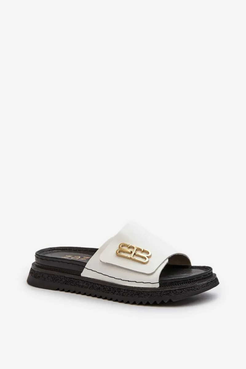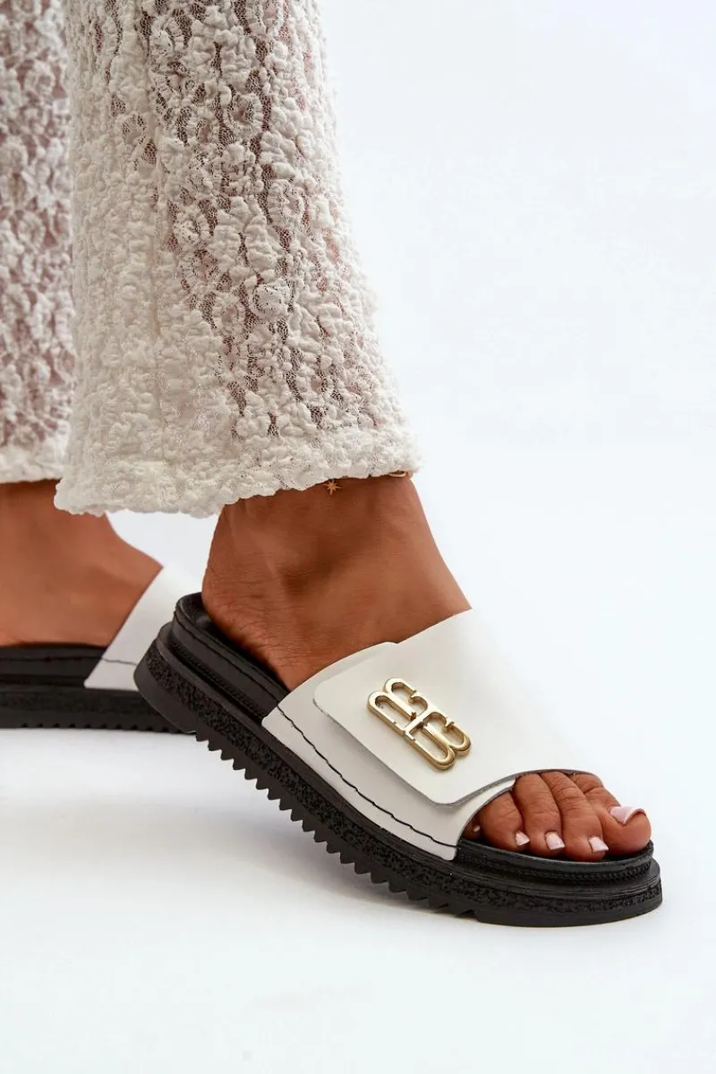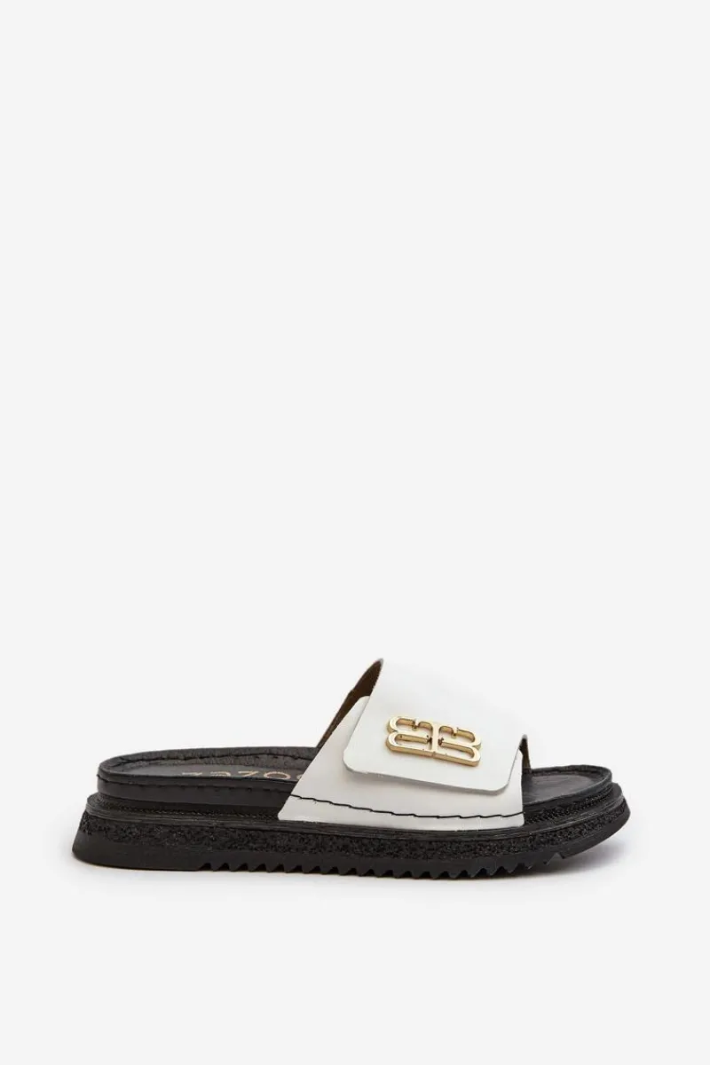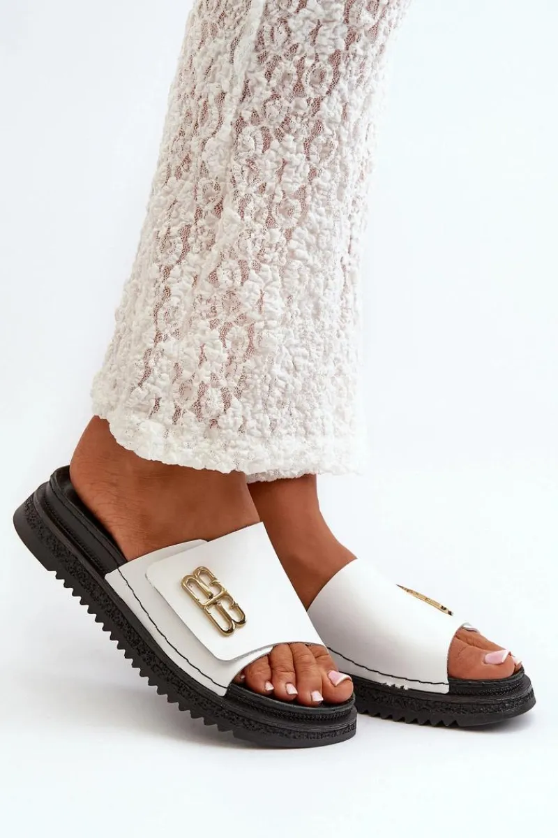 Klapki damskie wykonane ze skóry naturalnej. Osadzone na platformie. Pasek ozdobiony złotym detalem dodaje im elegancji. Idealne na letnie dni, te klapki doskonale dopełnią każdą stylizację, łącząc funkcjonalność z modnym wyglądem. Przy wyborze rozmiaru prosimy sugerować się tabelą rozmiarów.