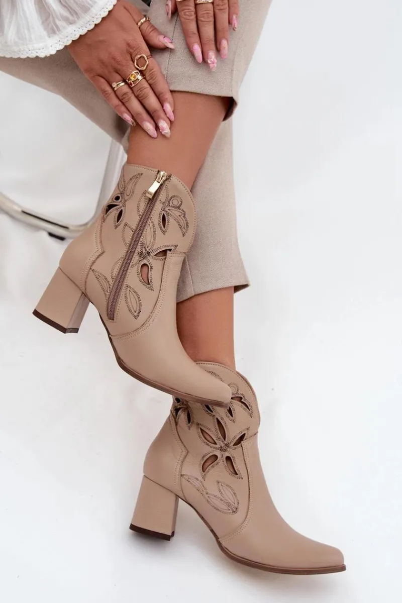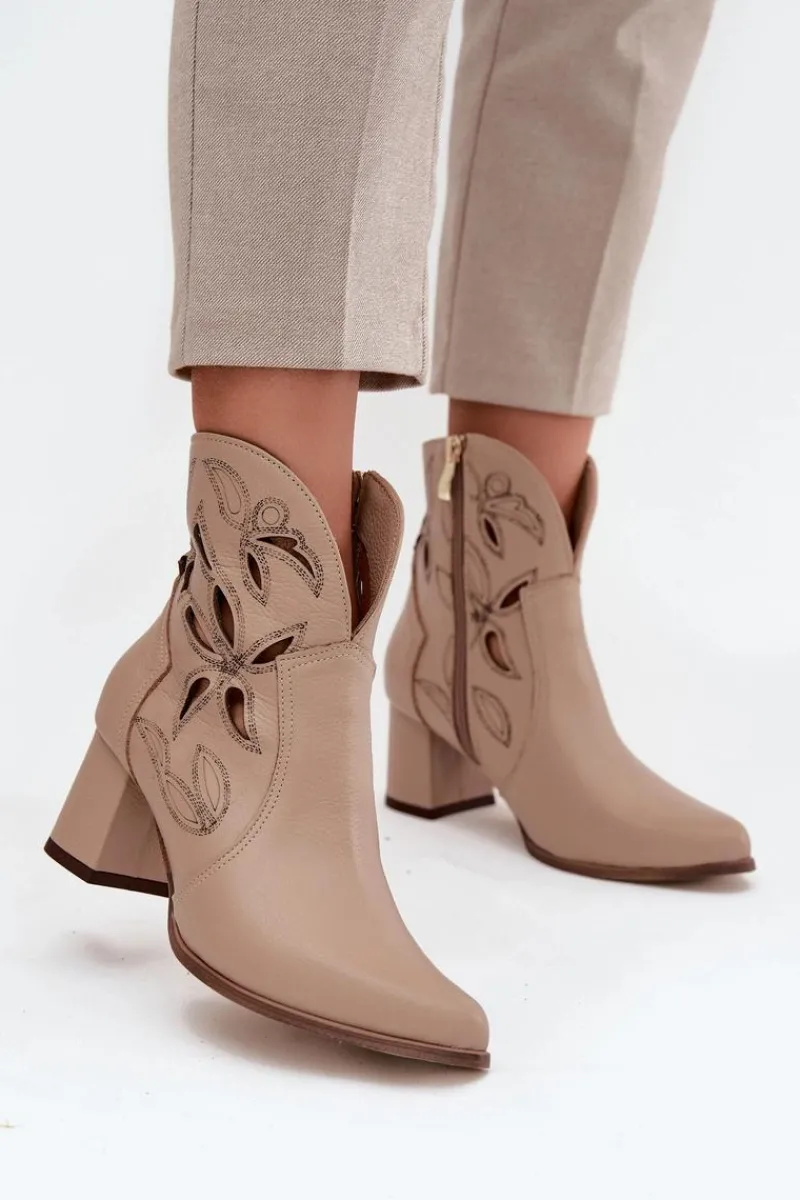 Botki damskie wykonane z naturalnej skóry. Ażurowy wzór dodaje im oryginalności i lekkości, podkreślając wyjątkowy charakter tego modelu. Obcas typu słupek zapewnia stabilność i wygodę, a jednocześnie pięknie wydłuża sylwetkę. Szpiczaste noski wprowadzają elegancki akcent, sprawiając, że buty prezentują się niezwykle zgrabnie. Dzięki zapięciu na zamek są łatwe w zakładaniu i zdejmowaniu, co zwiększa komfort codziennego użytkowania. To obuwie idealne na sezon przejściowy, które świetnie uzupełni zarówno casualowe, jak i bardziej eleganckie zestawy. Przy wyborze rozmiaru prosimy sugerować się tabelą rozmiarów.