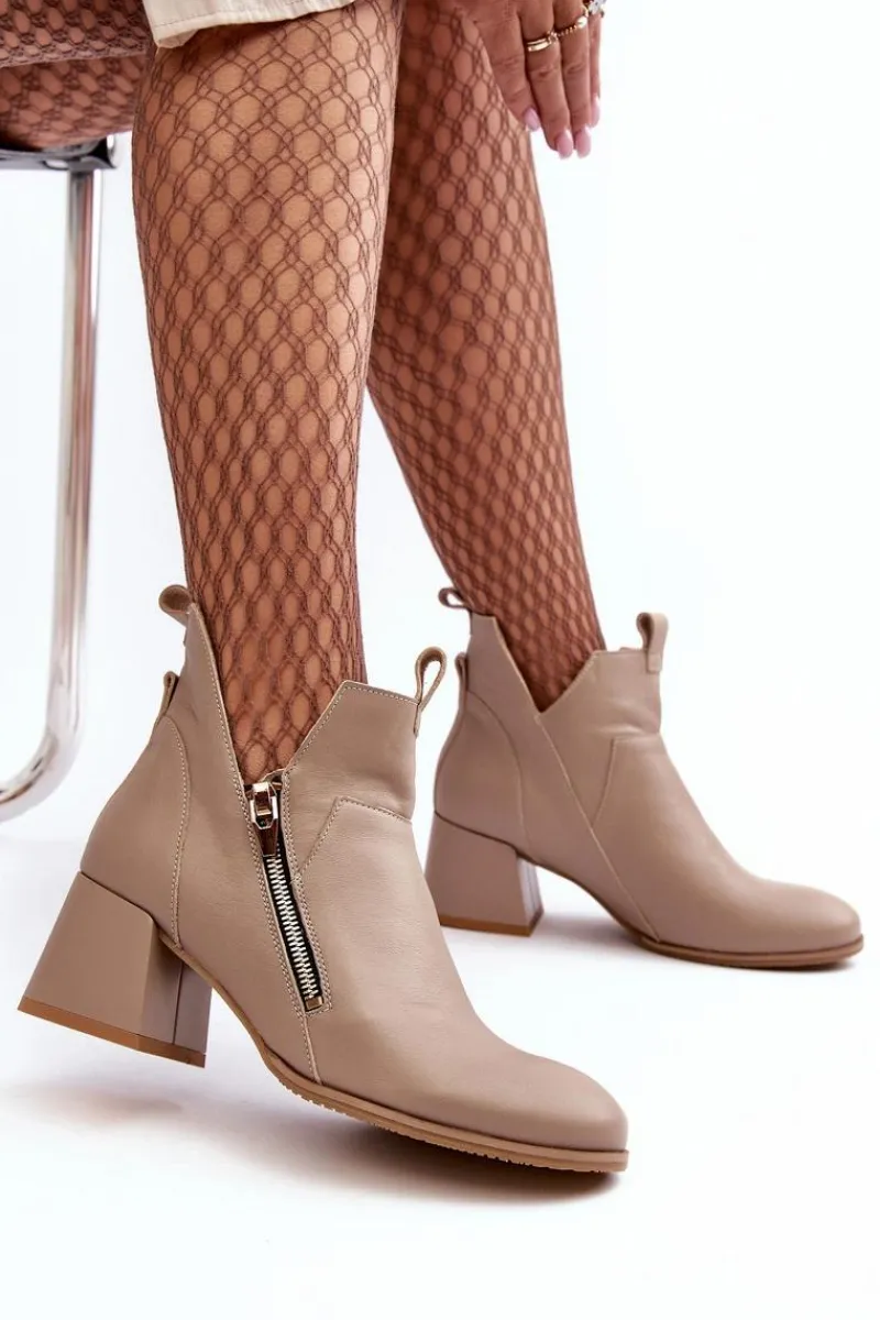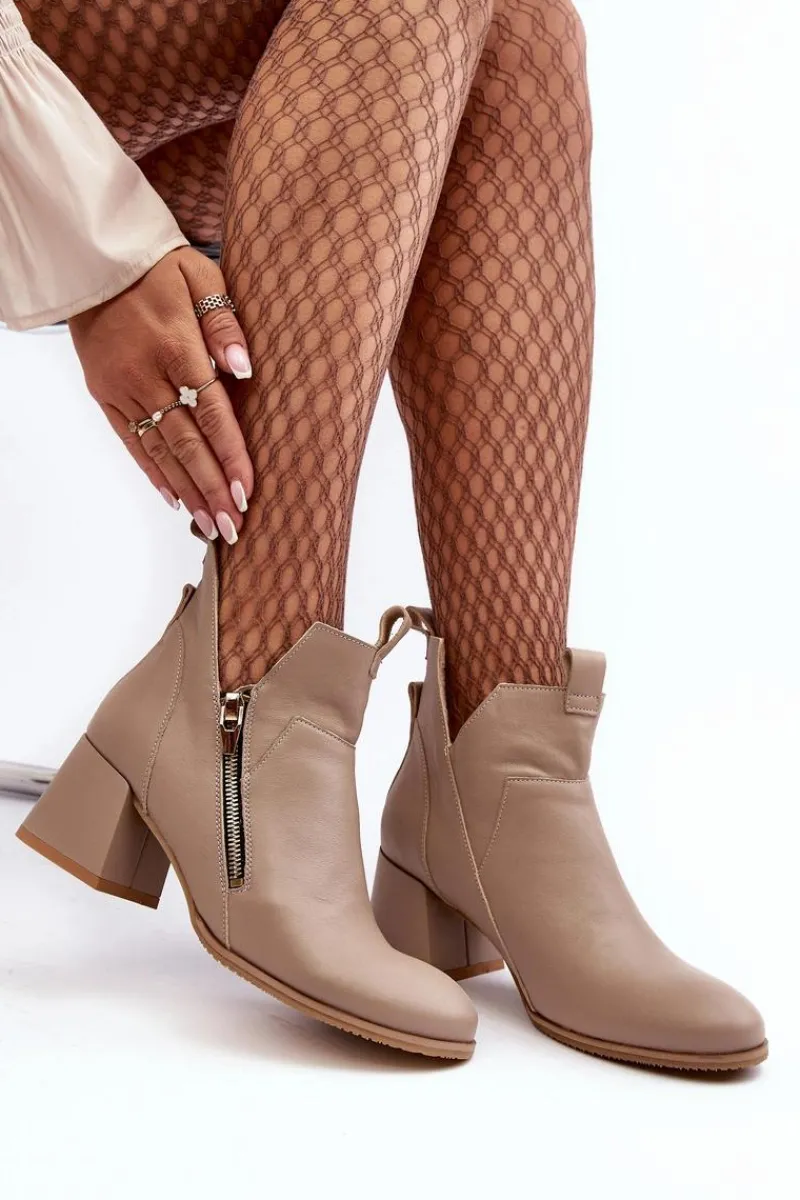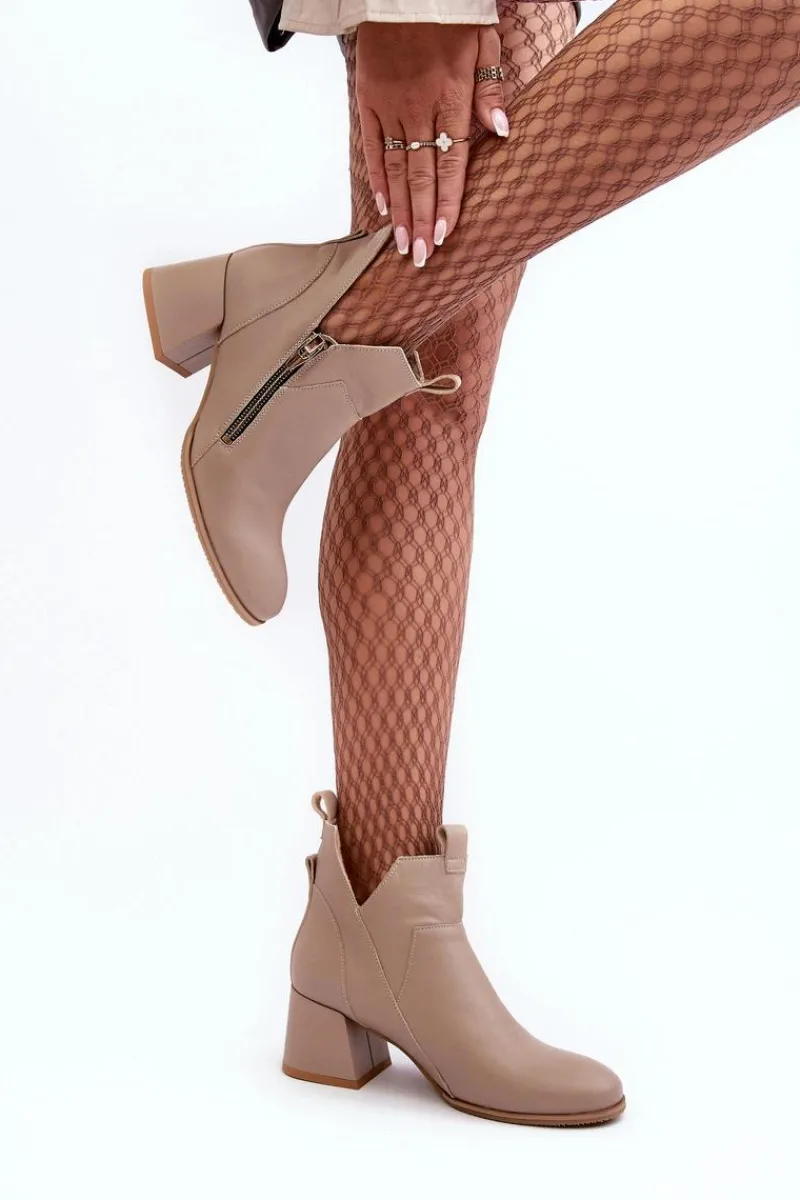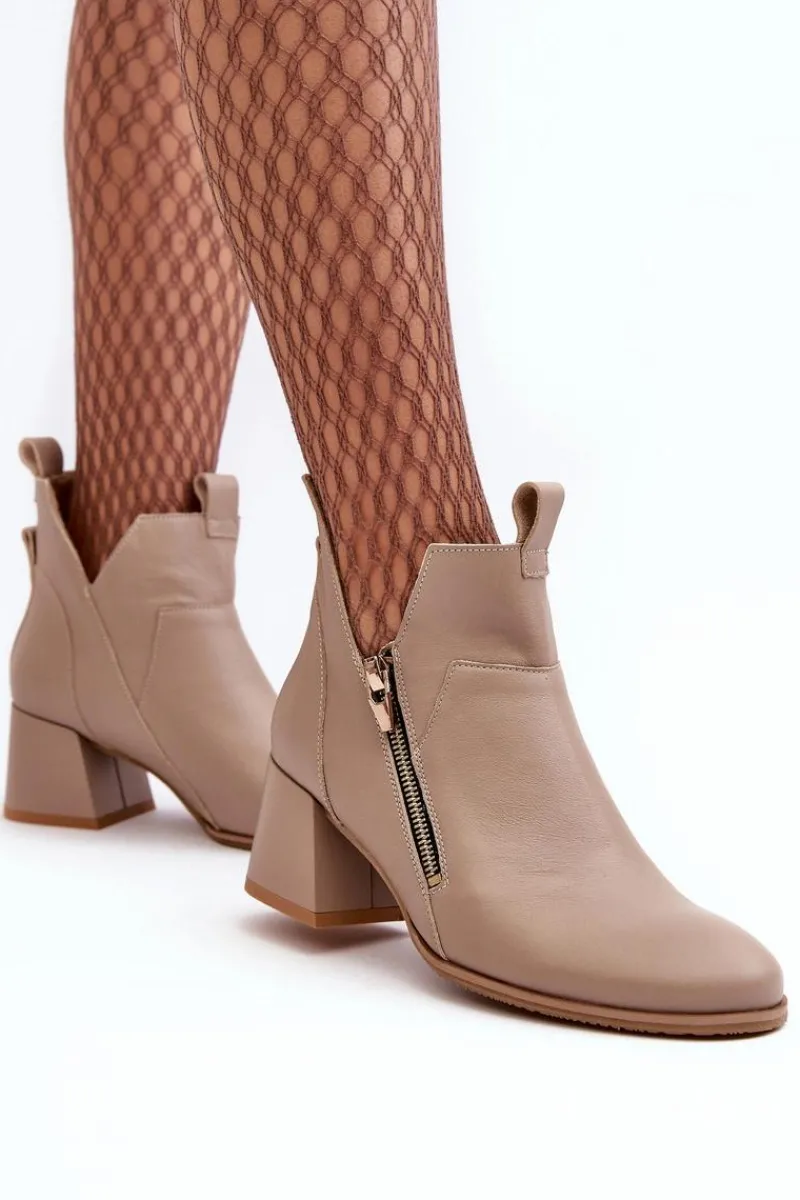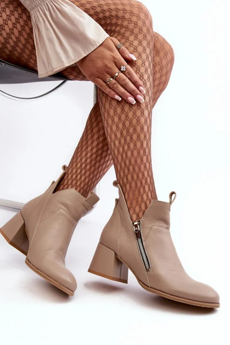 Botki damskie z cholewką za kostkę. Wykonane ze skóry naturalnej. Osadzone na niskim, stabilnym obcasie w postaci klocka. Zapinane na suwak po zewnętrznej stornie. Środek ocieplony. Noski zaokrąglone. Usztywniony zapiętek. Botki te doskonale sprawdzą się w jesiennych stylizacjach. Przy wyborze rozmiaru prosimy kierować się tabelą rozmiarów
