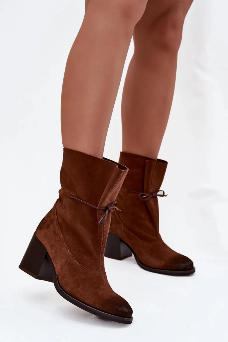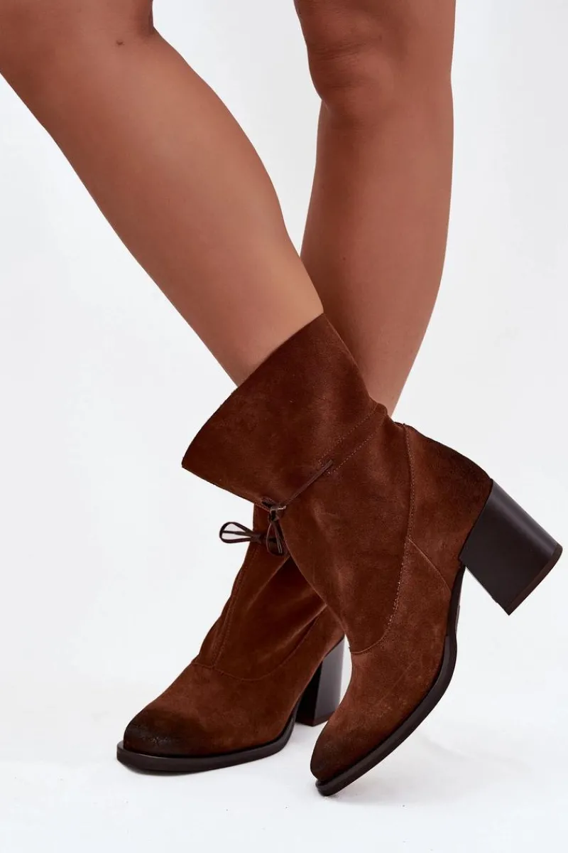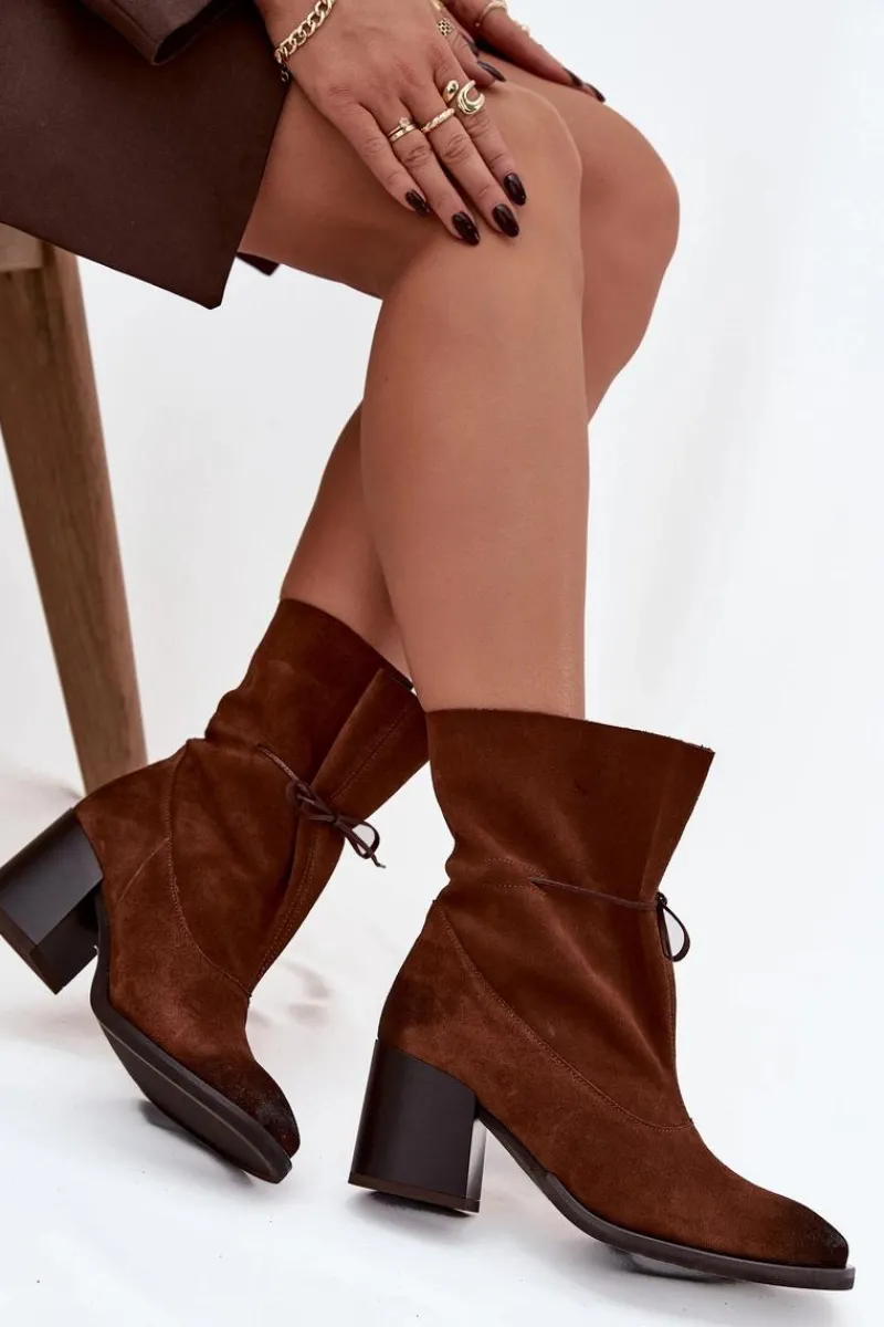 Botki damskie wykonane z naturalnego zamszu to elegancka propozycja dla kobiet ceniących styl i wygodę. Model wsuwany prezentuje się nowocześnie, a obcas w formie stabilnego słupka dodaje sylwetce lekkości i zapewnia komfort noszenia. Na cholewce znajduje się delikatny sznureczek, który pozwala dopasować botki do nogi i subtelnie podkreśla ich kobiecy charakter. To uniwersalny model, który doskonale sprawdzi się zarówno w codziennych, jak i bardziej eleganckich stylizacjach. Przy wyborze rozmiaru prosimy kierować się tabelą rozmiarów.
