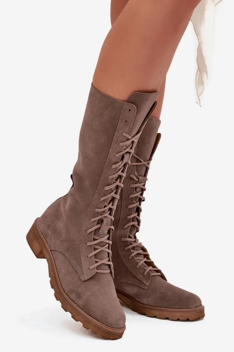 Damskie botki z naturalnego zamszu to doskonała propozycja na każdą okazję. Sięgające do połowy łydki, idealnie eksponują nogę, dodając jej smukłości. Cała długość cholewki została ozdobiona sznurowaniem, które nie tylko przyciąga wzrok, ale również pozwala na idealne dopasowanie do nogi. Dodatkowo botki zapinane są na zamek, co ułatwia ich zakładanie i zdejmowanie. Te botki stanowią świetny wybór do codziennych, jak i bardziej eleganckich stylizacji. Przy wyborze rozmiaru prosimy sugerować się poniższą tabelą rozmiarów.