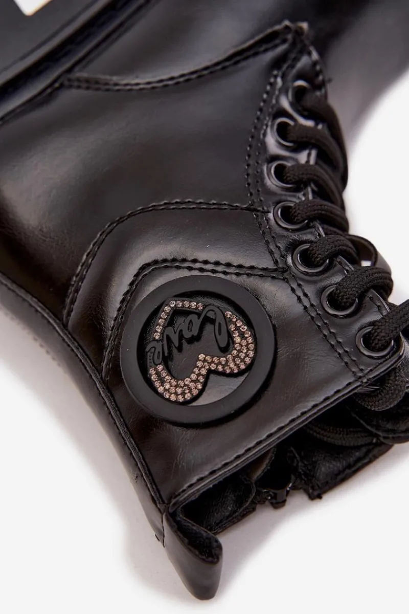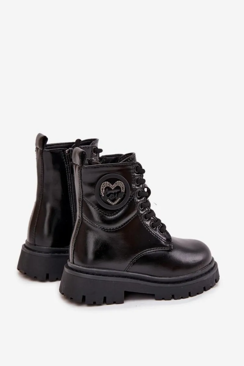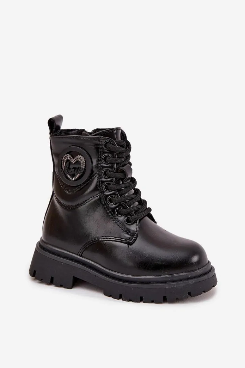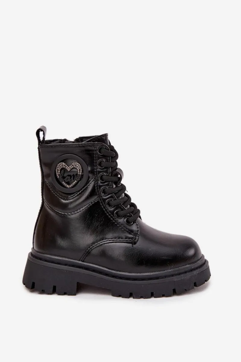 Urocze botki dla dziewczynek wykonane z eko skóry to połączenie wygody, funkcjonalności i dziewczęcego stylu. Model jest sznurowany i zapinany na zamek, co ułatwia zakładanie oraz idealne dopasowanie do stopy. Wnętrze butów zostało ocieplone miękkim futerkiem, dzięki czemu zapewnia ciepło i komfort w chłodniejsze dni. Z boku cholewki znajduje się ozdobny detal w kształcie serduszka z napisem „LOVE” i błyszczącymi cyrkoniami, który dodaje całości uroku i modnego charakteru. To doskonały wybór dla małych elegantek – idealne na co dzień, do szkoły czy na spacery w jesienno-zimowym sezonie.