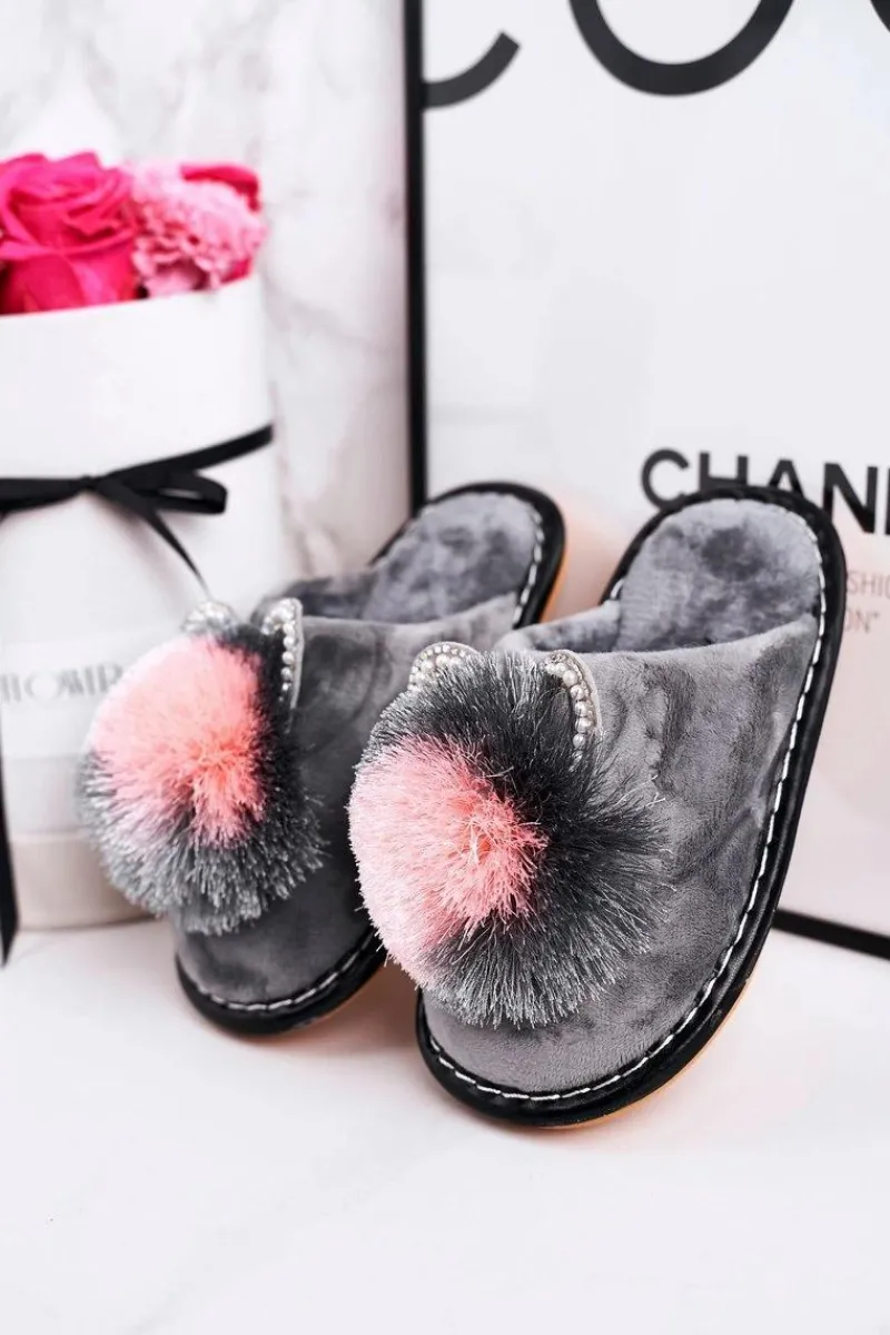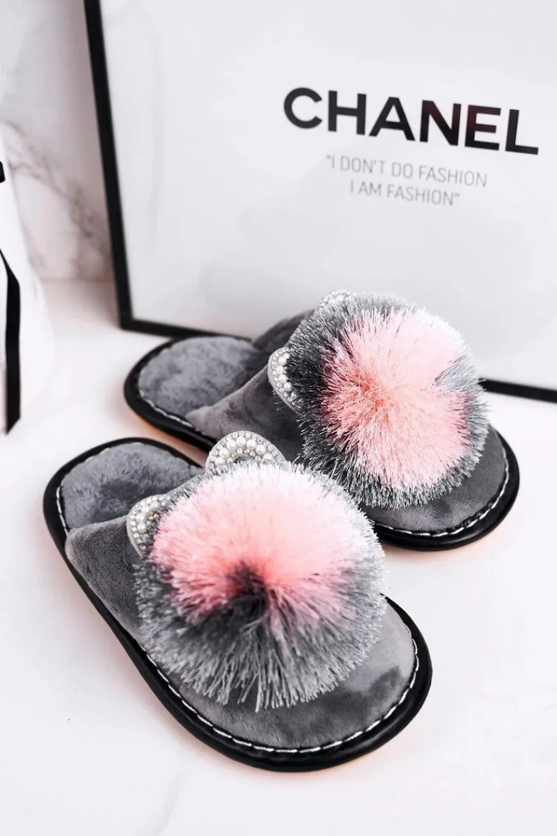Dziewczęce>Boto Dziecięce Klapki Papcie Z Pomponem Szare Cinderella