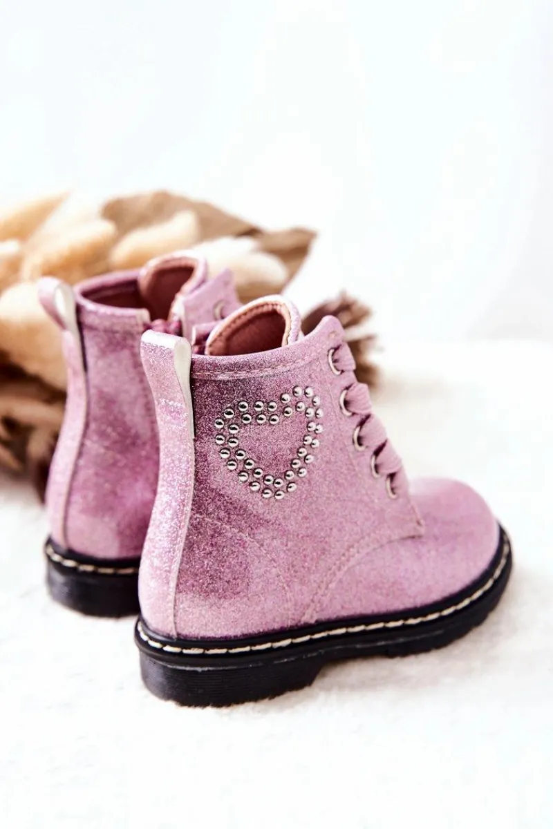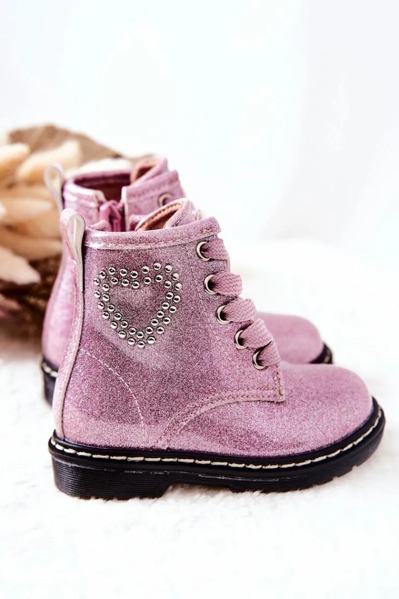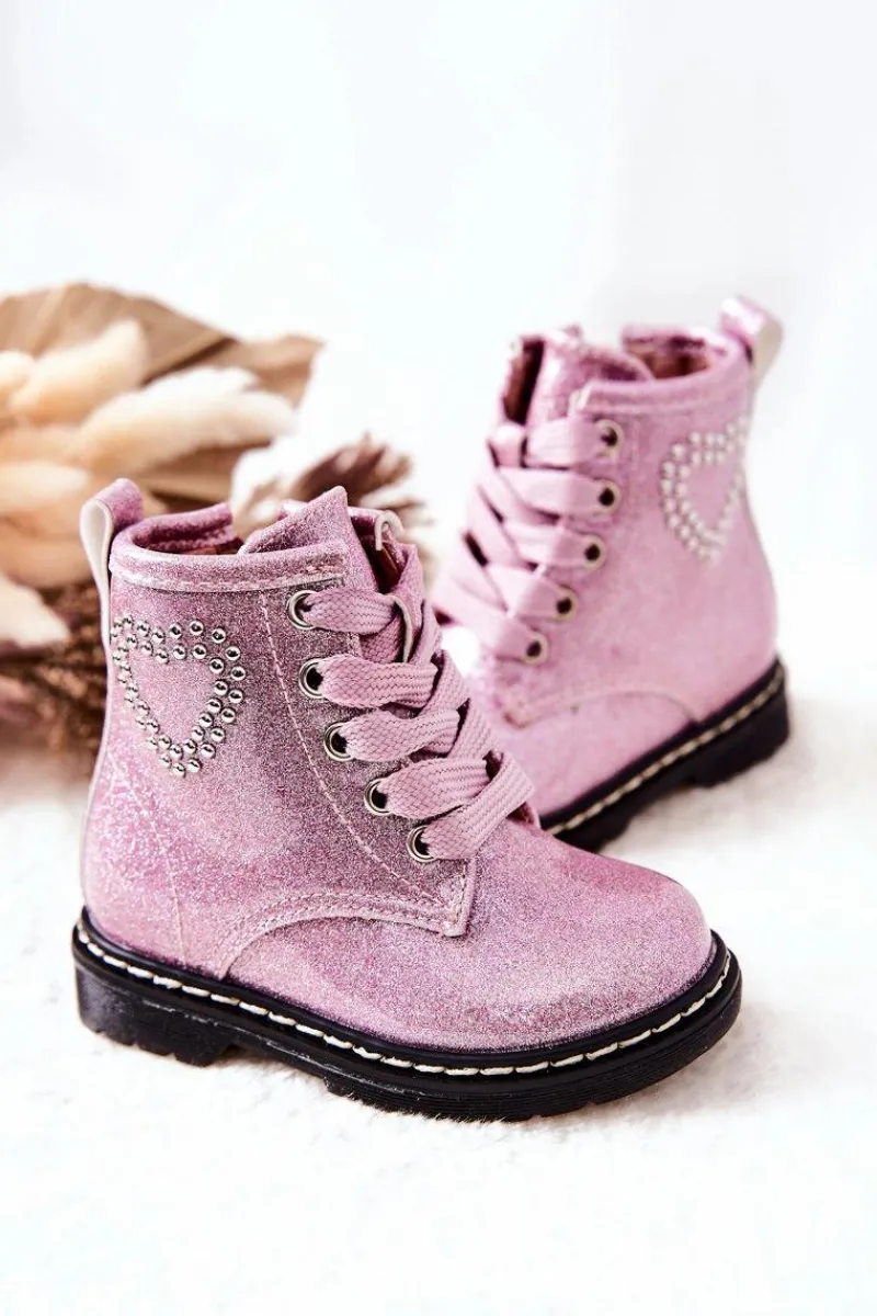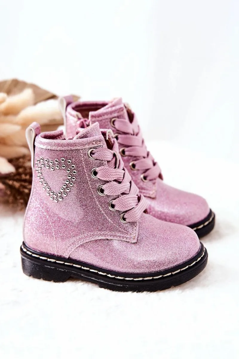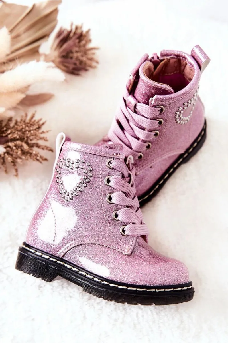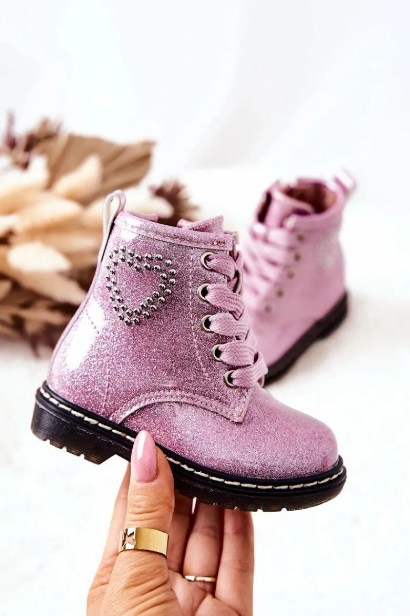 Cudowne botki z błyszczącym efektem i serduszkiem z ćwieków zachwyci niejedną miłośniczkę mody! Dopasowanie do stopy zapewni wygodne i klasyczne sznurowanie, a zakładanie ułatwi wszyty na boku suwak. Wykonane z lakierowanej eko skóry. Koniecznie sprawdź całą naszą ofertę dziecięcych botków. Przy wyborze rozmiaru prosimy kierować tabelą rozmiarów.