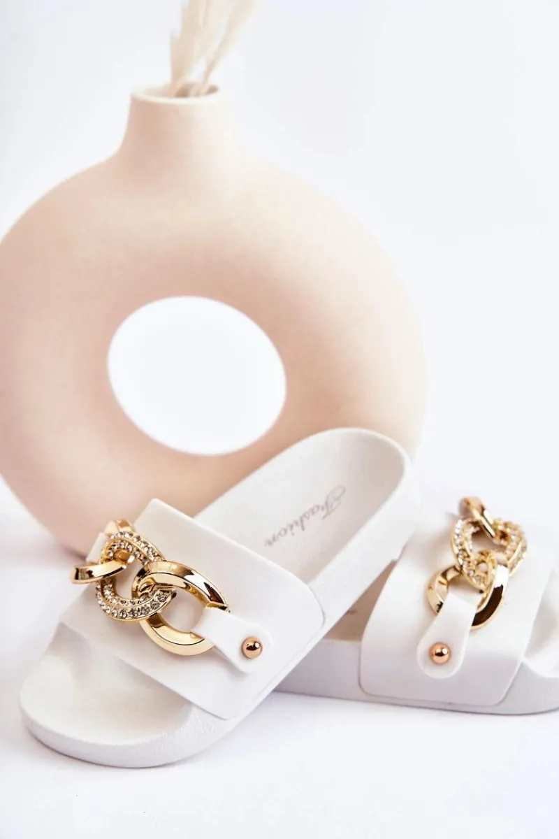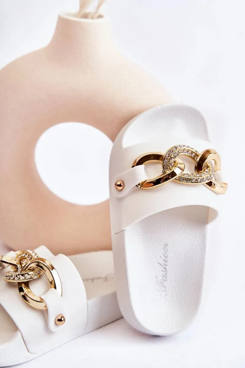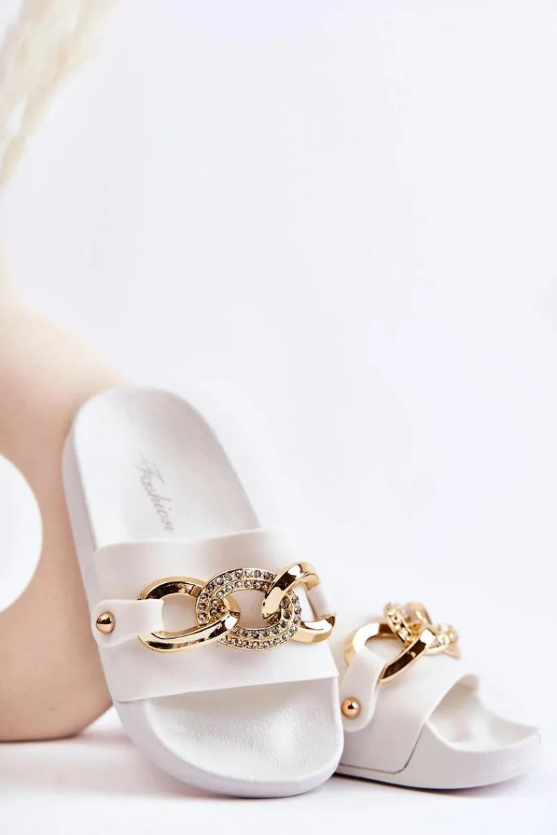 Cudowne dziecięce klapki zostały wykonane z gumowego tworzywa. Model ten posiada na przodzie ozdobny łańcuch wykonany z tworzywa sztucznego. Dodatkowo jest przyozdobiony dżetami imitującymi cyrkonie. Wkładka jest profilowana. Klapki są osadzone na platformie. Nosek odkryty, zaokrąglony. Model klasyczny, wsuwany. Twoja pociecha na pewno będzie zadowolona z tego modelu! Koniecznie sprawdź także pozostałe modele dziecięcych klapek! Przy wyborze rozmiaru prosimy sugerować się tabelą rozmiarów.