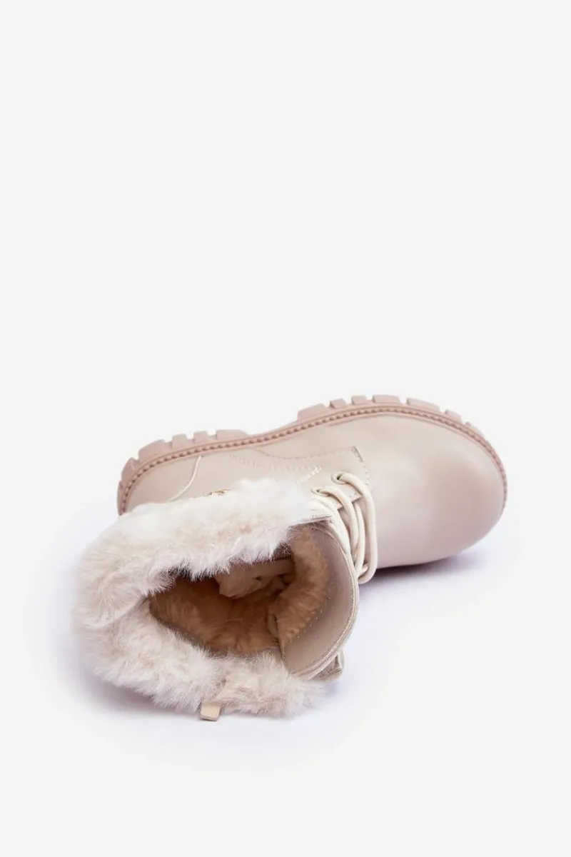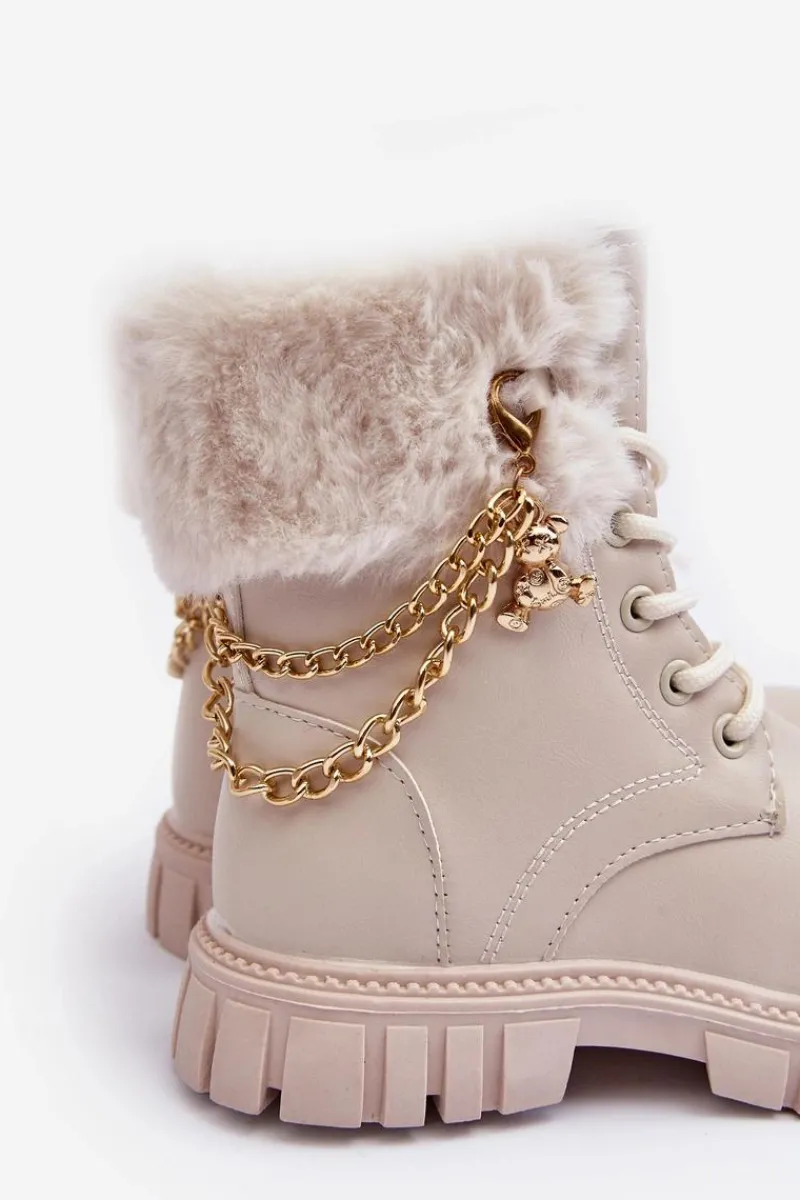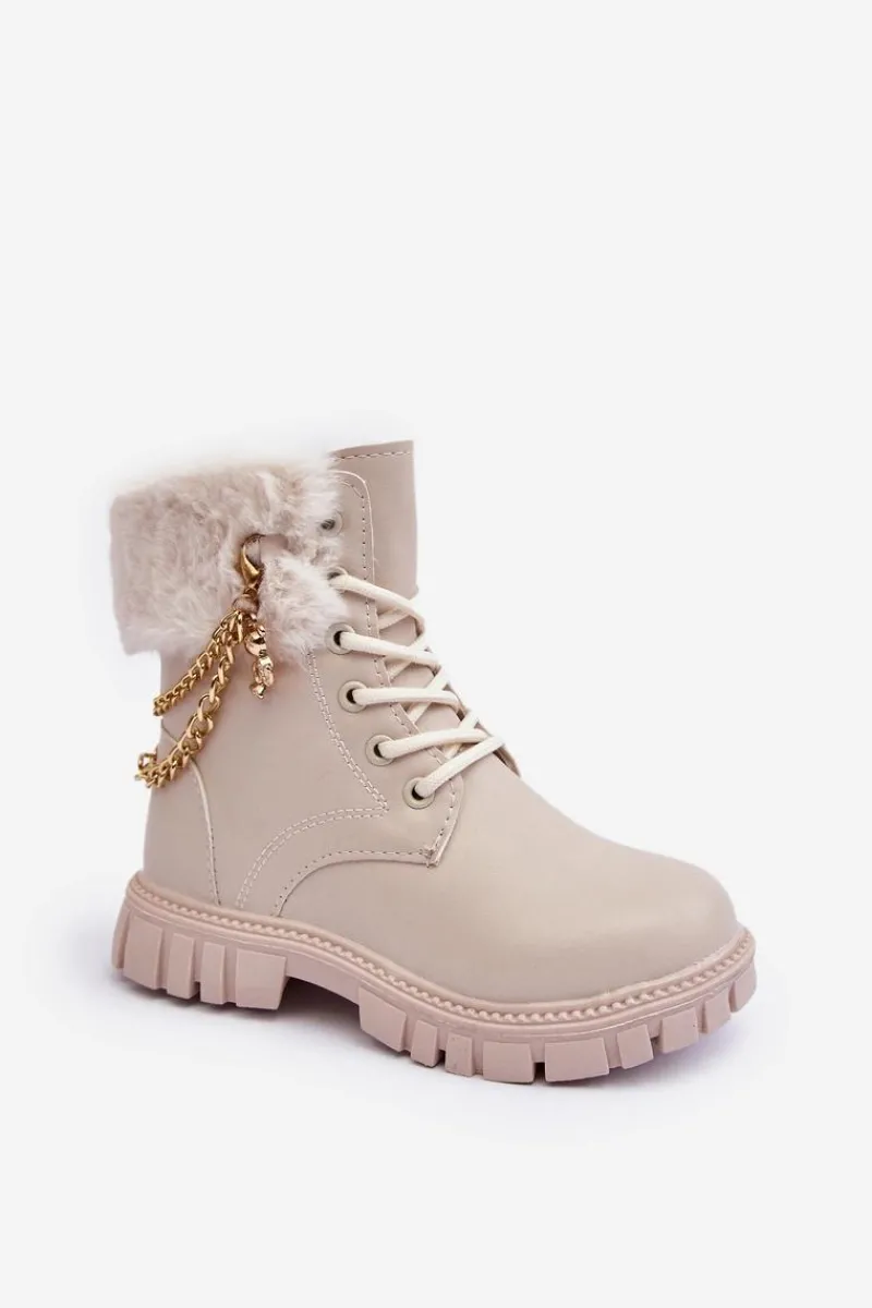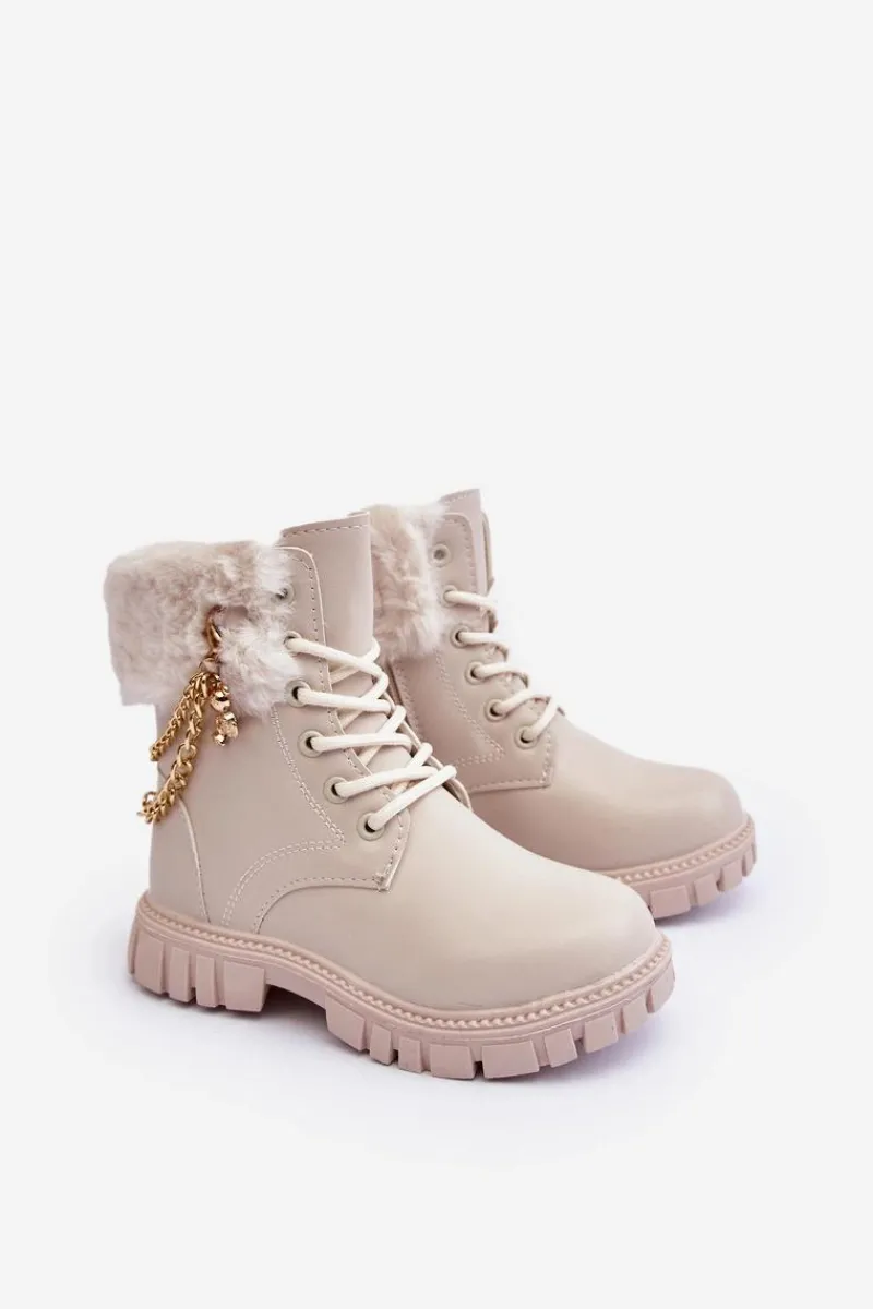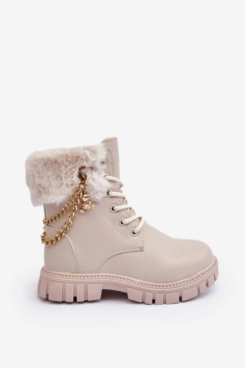 Modne dziecięce botki wykonane z eko skóry. Ozdobione łańcuchem oraz futerkiem. Zapinane na suwak z boku oraz dodatkowo posiadają sznurowanie. Środek ocieplony. Noski zaokrąglone. Zapiętek jest usztywniony. Piękne, dziewczęce botki skradną serce niejednej małej miłośniczce mody! Przy wyborze rozmiaru prosimy sugerować się tabelą rozmiarów.
