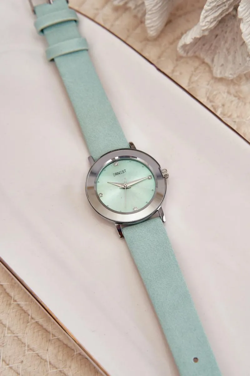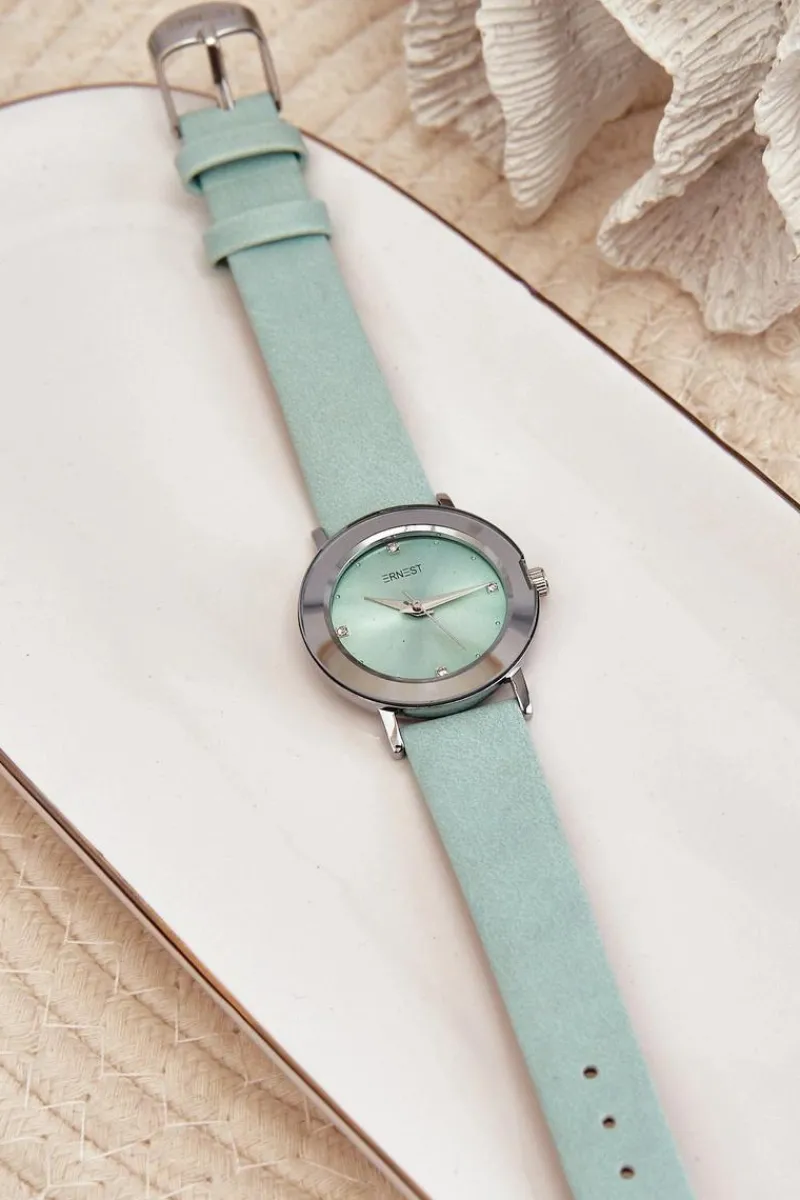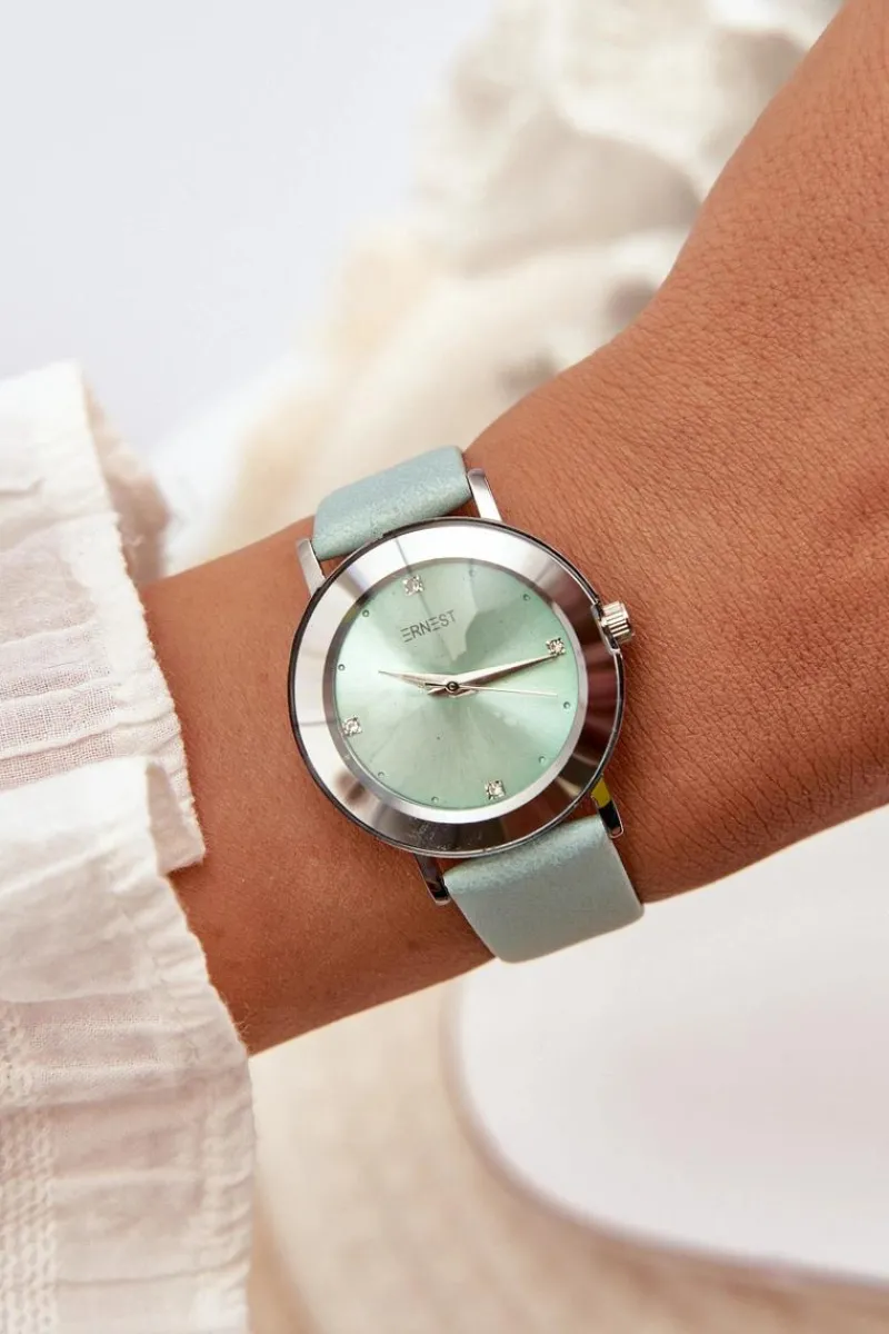 Klasyczny zegarek damski marki Ernest. Pasek wykonany z eko skóry. Minimalistyczny design sprawia, że doskonale komponuje się z różnymi stylizacjami, dodając im subtelnej elegancji.