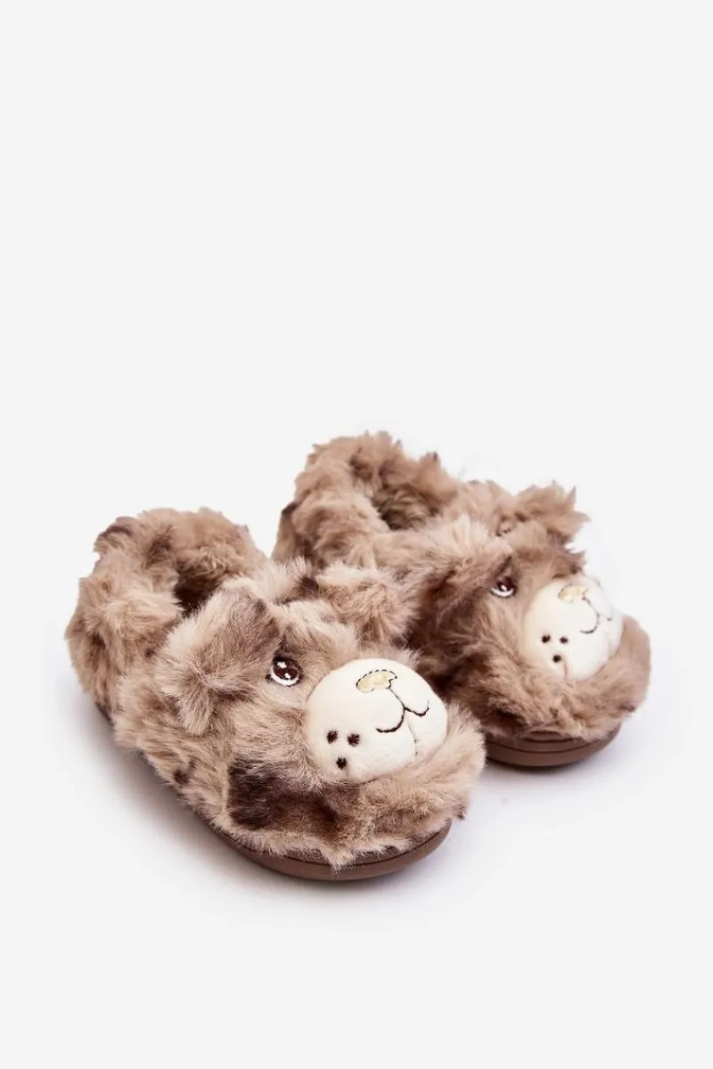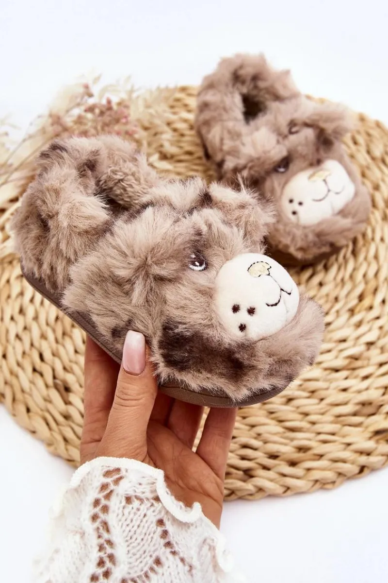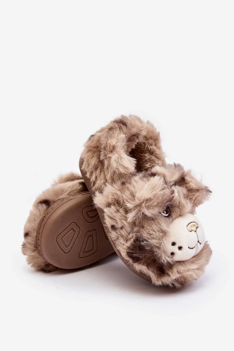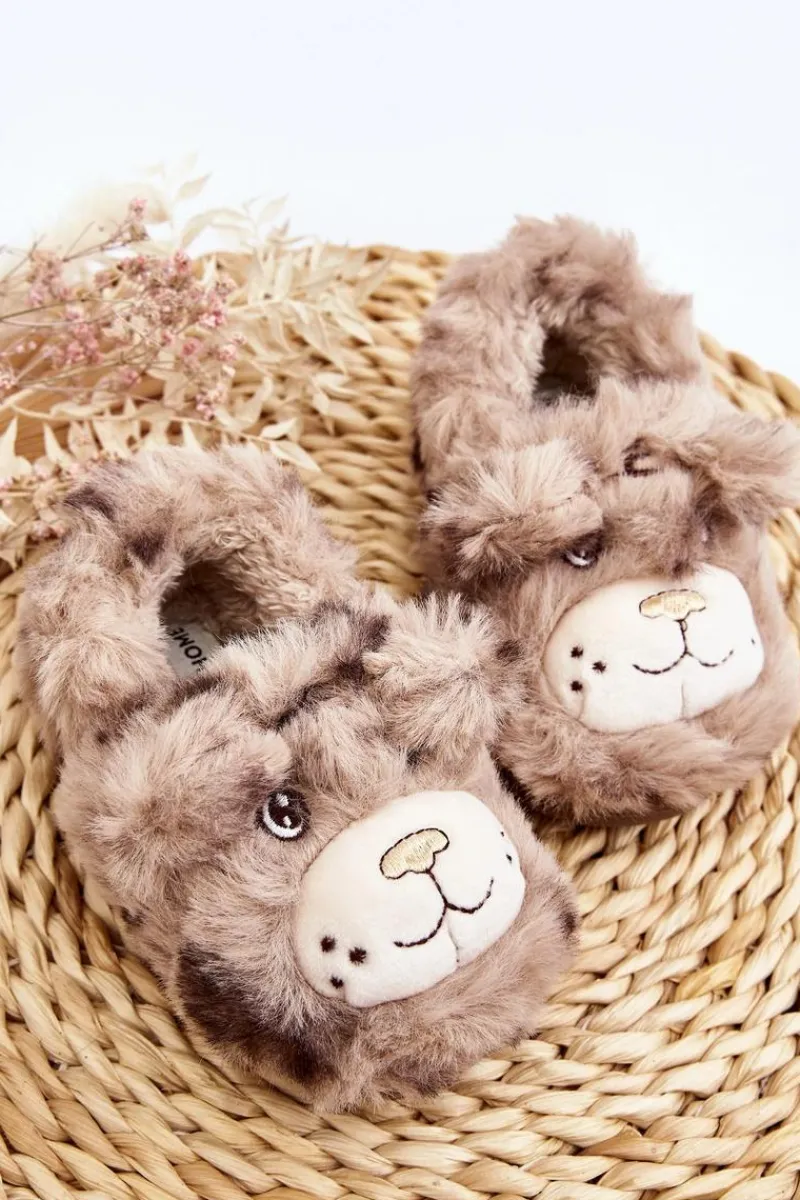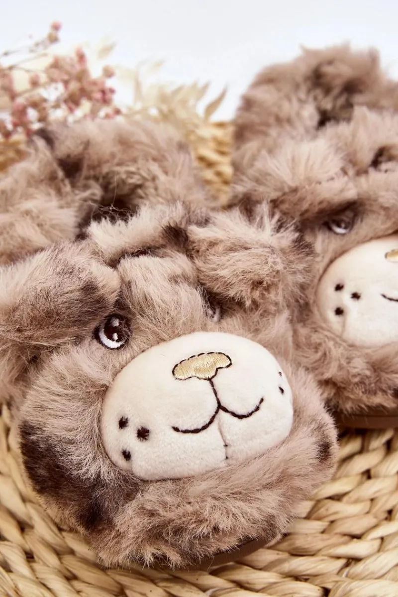 Futrzane Kapcie Dziecięce Z Misiem Ciemnobeżowe Apolanie Dzieci Dziewczęce