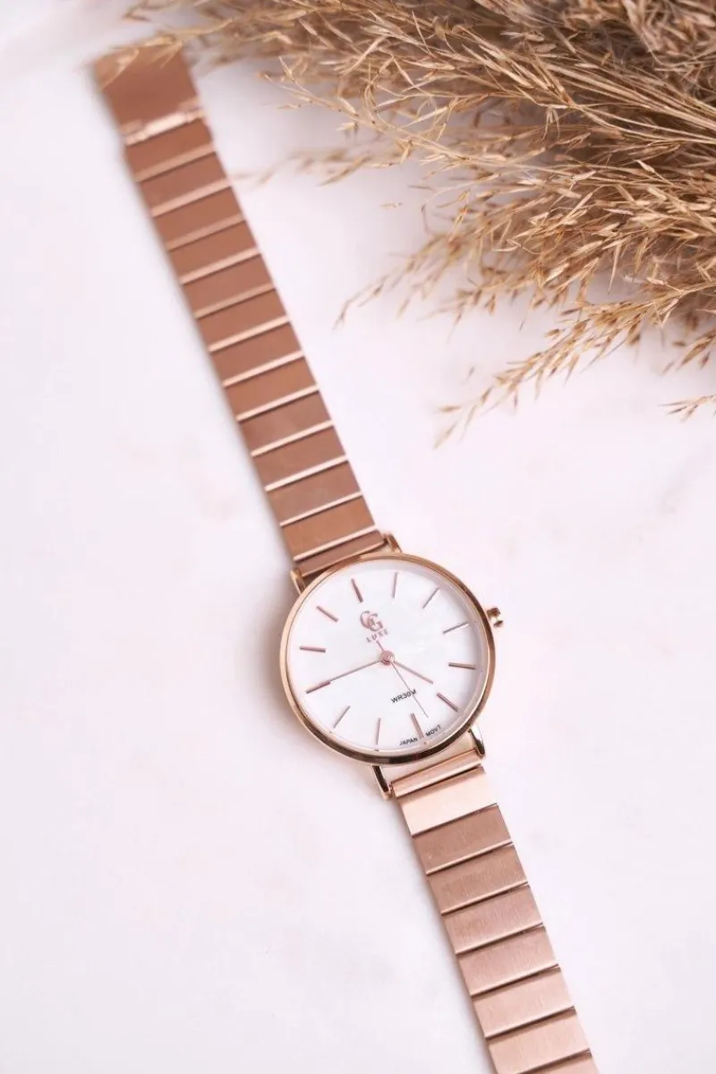 Ten model zegarka GG Luxe posiada oryginalną bransoletkę ze stali nierdzewnej. Okrągła, czytelna tarcza posiada piękne perłowe wykończenie. Ten zegarek będzie pasować również na drobne nadgarstki. Wodoszczelność WR30M zapewnia bezpieczeństwo podczas przypadkowego zachlapania zegarka, np. mycia rąk.