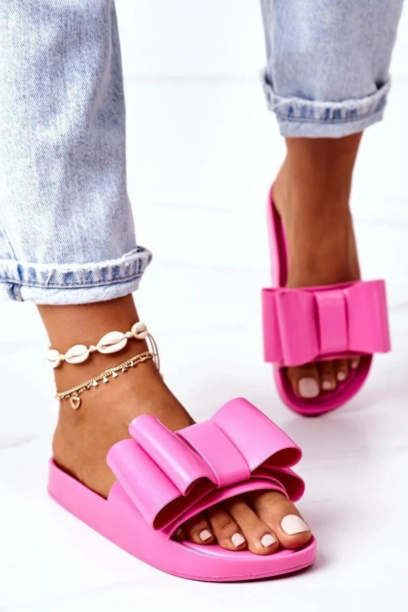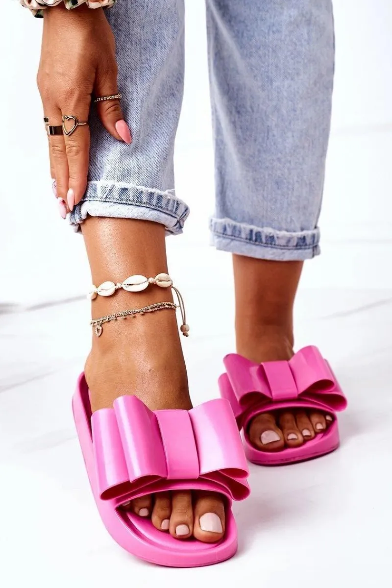 Gumowe klapki damskie z kokardą. Buty posiadają miękką wkładkę ze skóry ekologicznej. Przy wyborze rozmiaru prosimy sugerować się tabelą rozmiarów. 2 Gatunek. Na łączeniu podeszwy widoczny jest klej.