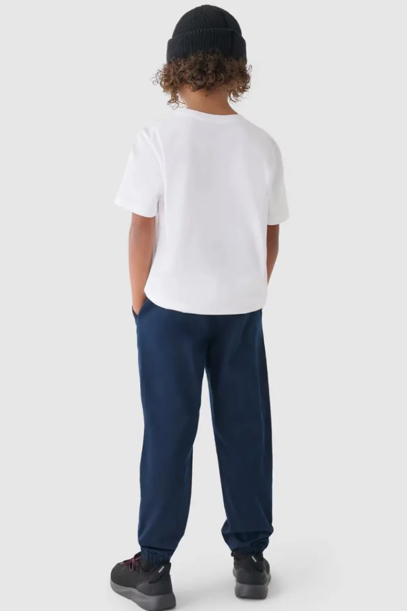 Spodnie casual joggery chłopięce idealnie sprawdzą się jako element zarówno lifestylowych, jak i sportowych stylizacji na co dzień. Posiadają krój regular, który wygodnie dopasowuje się do sylwetki oraz zwężane nogawki zakończone elastyczną gumką. Spodnie na co dzień dziecięce posiadają średnią gramaturę materiału 220 gsm, która sprawia, że są one miękkie oraz bardziej przewiewne. Spodnie casualowe dla chłopaka są wykonane w 98% z bawełny, dzięki czemu są miękkie, trwałe i przyjemne w dotyku. Dodatek elastanu (2%) sprawia, że są rozciągliwe i wygodnie układają się na sylwetce. Spodnie nie posiadają podszycia, dzięki czemu są lżejsze i odpowiednie na cieplejsze dni. Po bokach znajdują się 2 kieszenie otwarte. Elastyczny pas z zewnętrzną regulacją na sznurki. Profilowana strefa kolan.