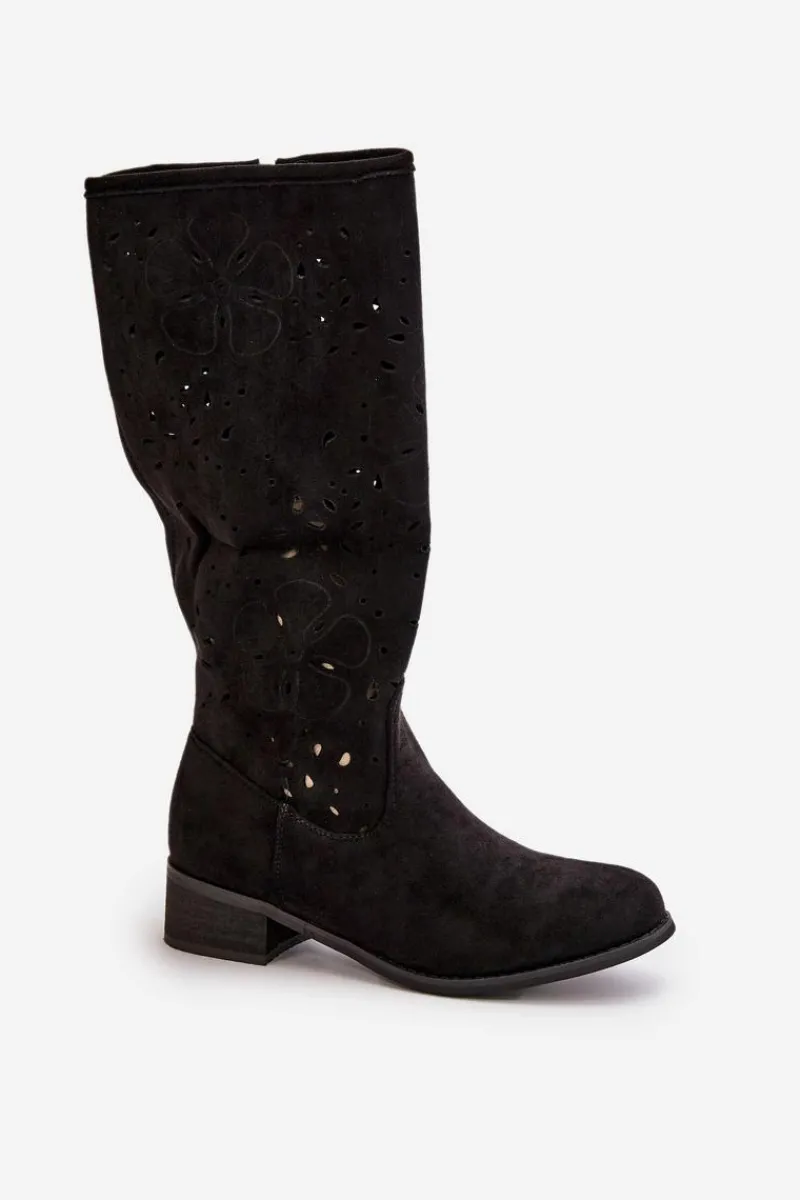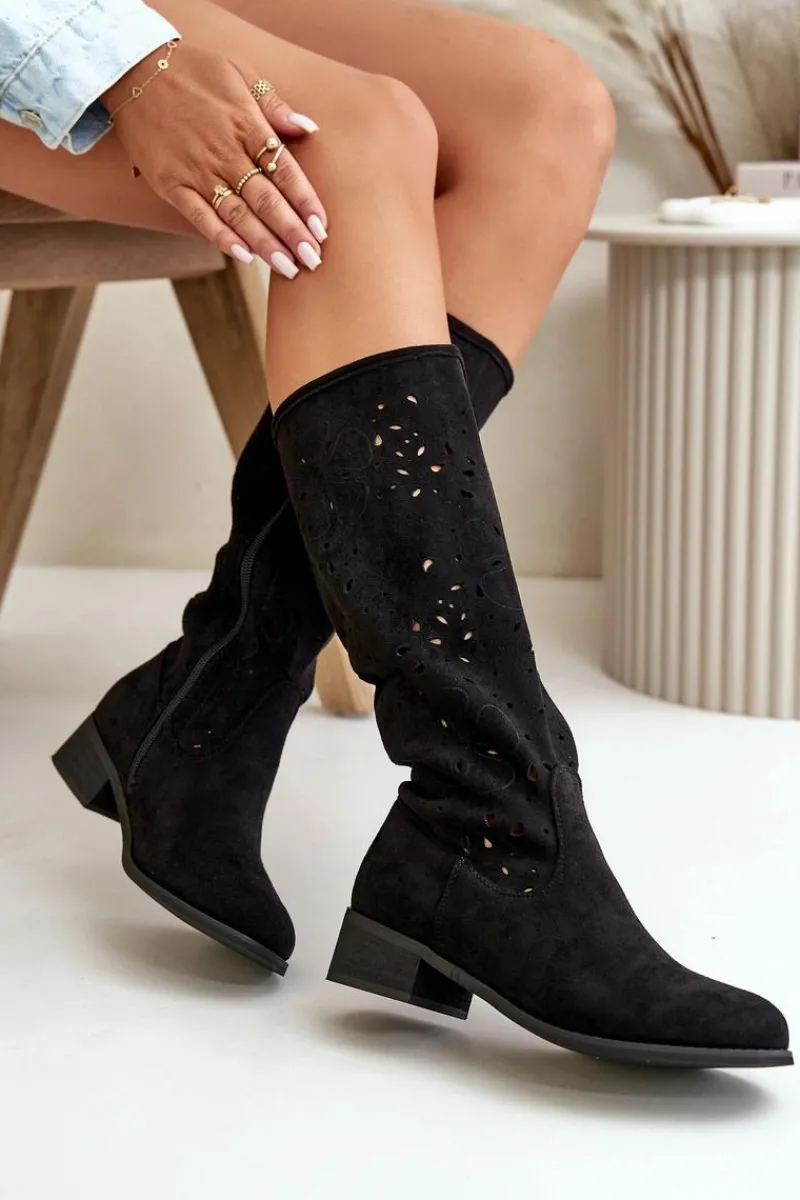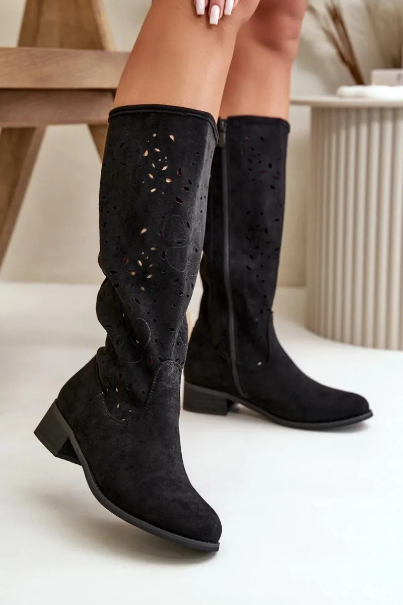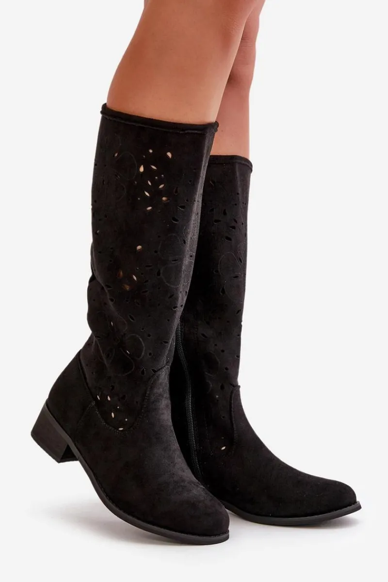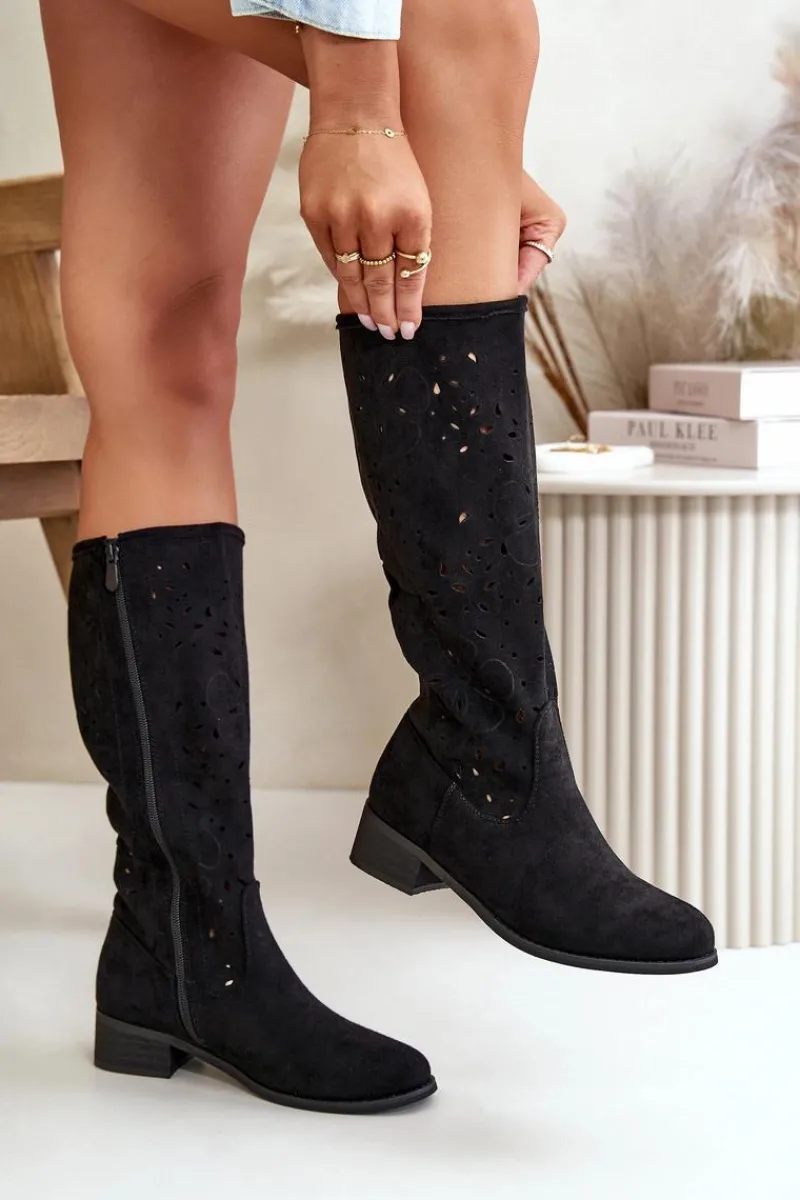 Hot Ażurowe Kozaki Damskie Na Niskim Obcasie Eko Zamszowe Zapinane Na Zamek Czarne Orchides Damskie Kozaki Ocieplane|Kozaki Ażurowe