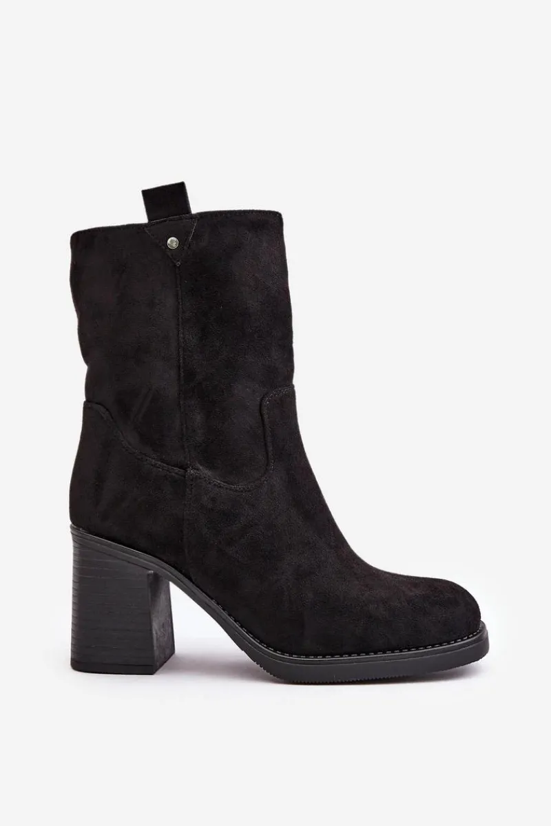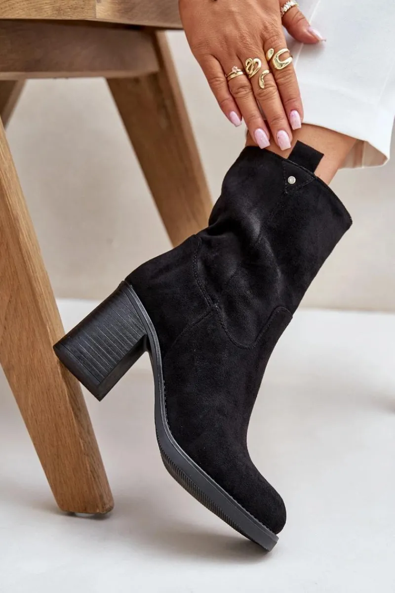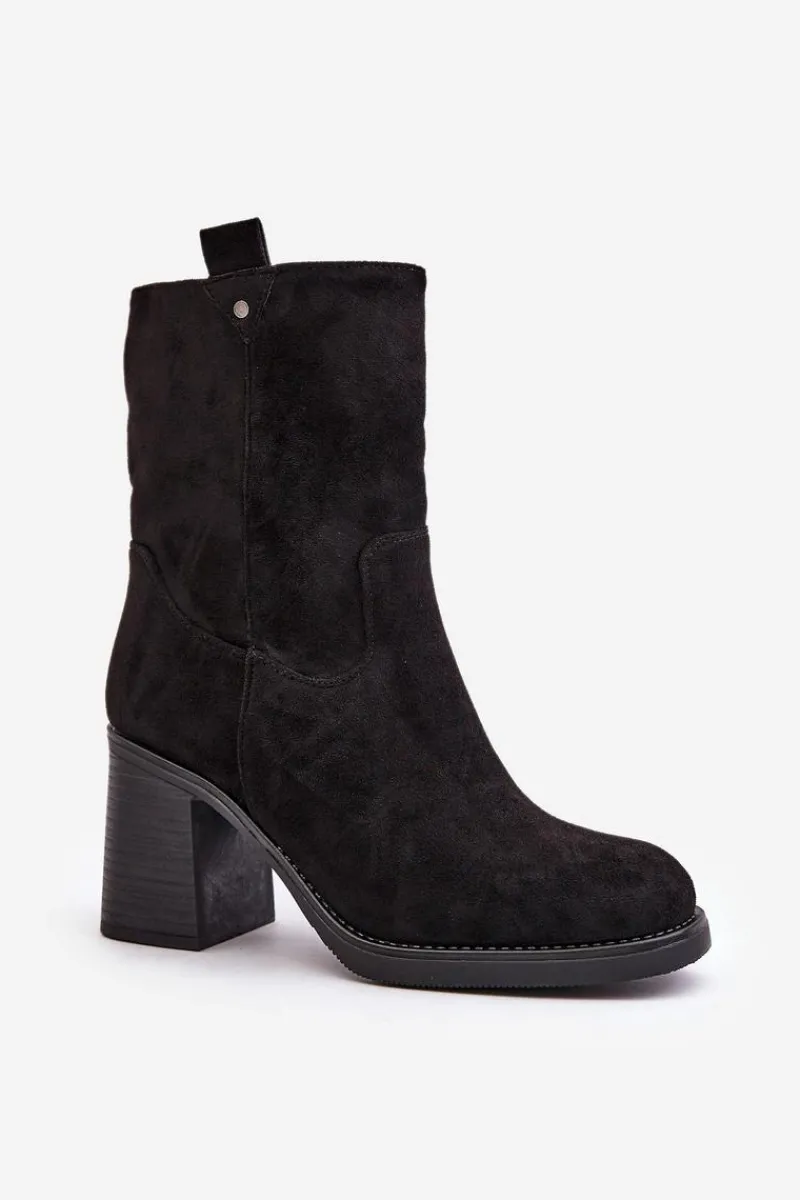 Botki damskie z eko zamszu. Ocieplane kocem obuwniczym. Noski zaokrąglone. Obcas w postaci słupka. Zapinane na zamek. Klasyczny fason, który dopełni wiele jesienno-zimowych stylizacji! Przy wyborze rozmiaru prosimy sugerować się tabelą rozmiarów.