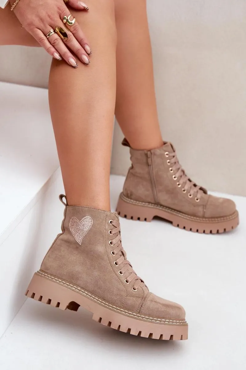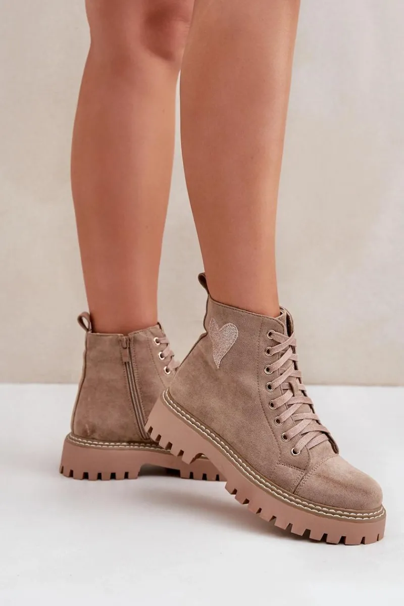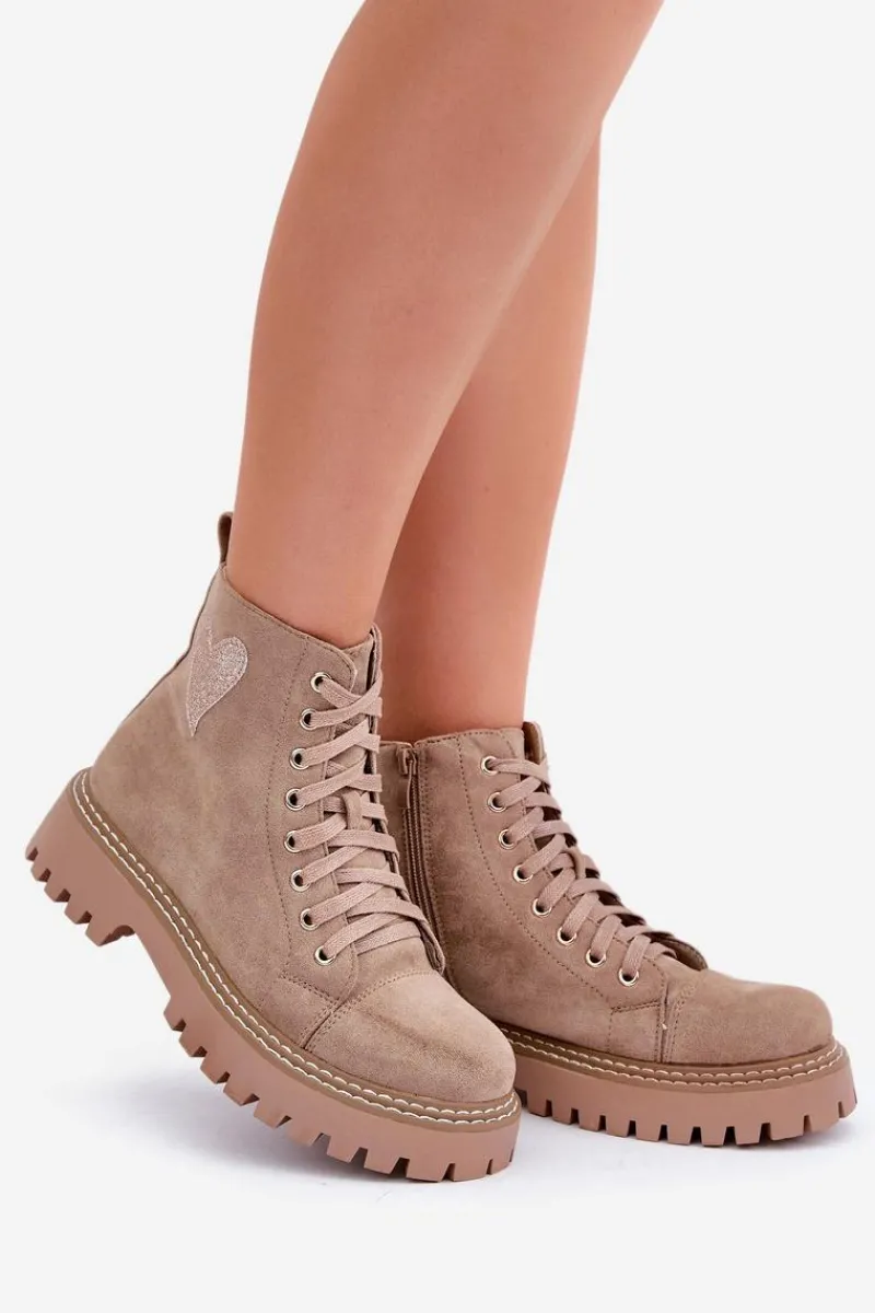 Damskie botki wykonane z eko zamszu. Model zapinany na zamek i dodatkowo sznurowany, co zapewnia doskonałe dopasowanie do stopy. Zaokrąglone noski gwarantują komfort podczas noszenia. Cholewka ozdobiona błyszczącym sercem dodaje uroku i unikalnego charakteru. Idealne na co dzień, świetnie uzupełnią casualowe stylizacje. Przy wyborze rozmiaru prosimy sugerować się tabelą rozmiarów.