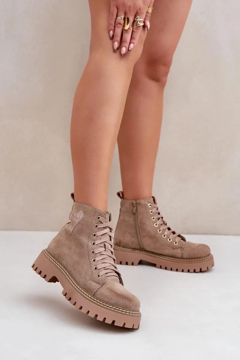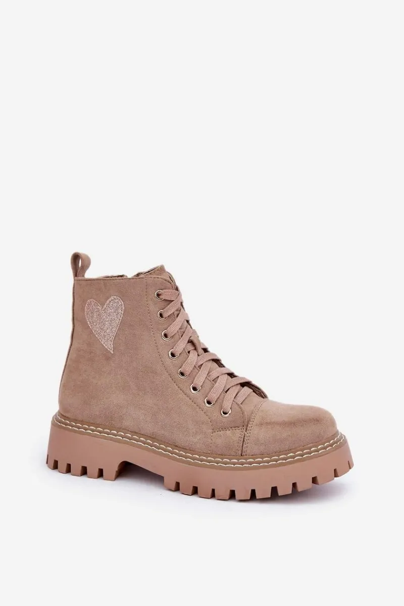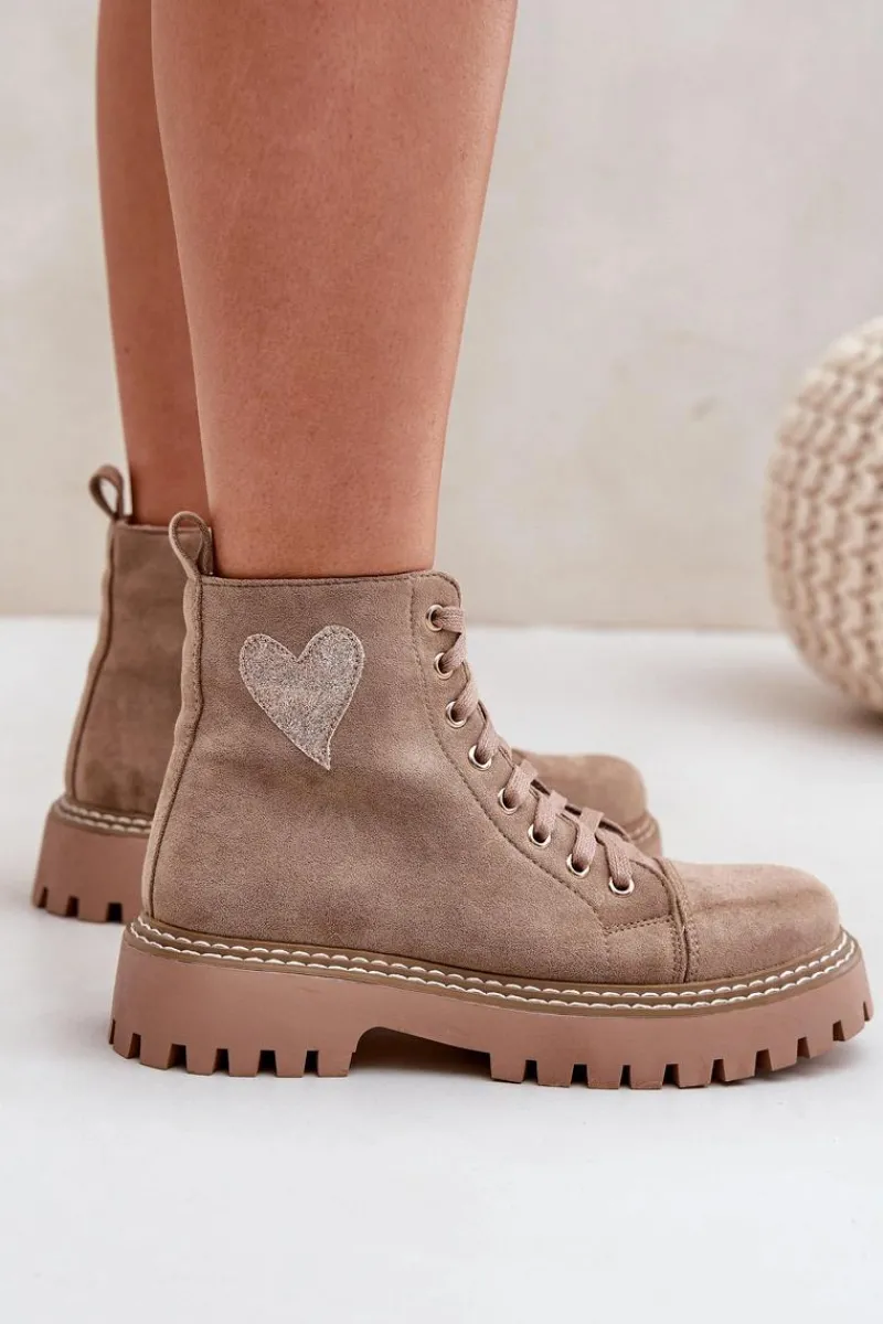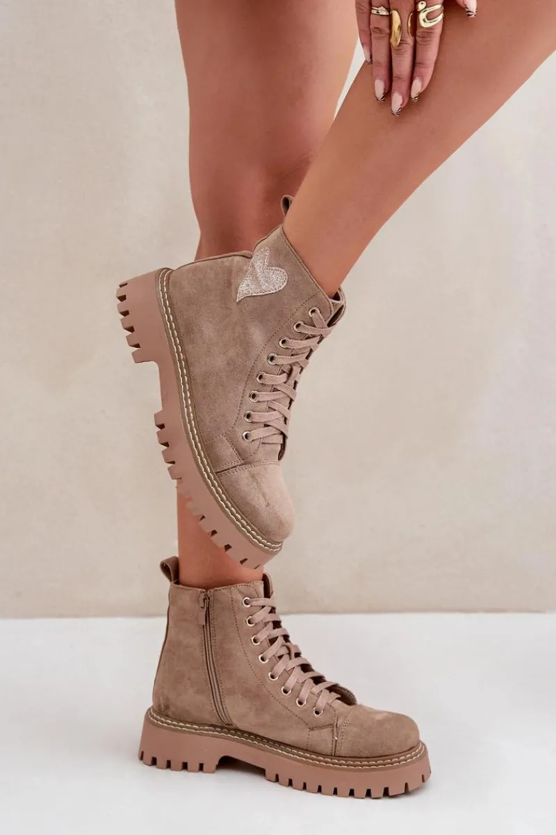 Damskie botki wykonane z eko zamszu. Model zapinany na zamek i dodatkowo sznurowany, co zapewnia doskonałe dopasowanie do stopy. Zaokrąglone noski gwarantują komfort podczas noszenia. Cholewka ozdobiona błyszczącym sercem dodaje uroku i unikalnego charakteru. Idealne na co dzień, świetnie uzupełnią casualowe stylizacje. Przy wyborze rozmiaru prosimy sugerować się tabelą rozmiarów.