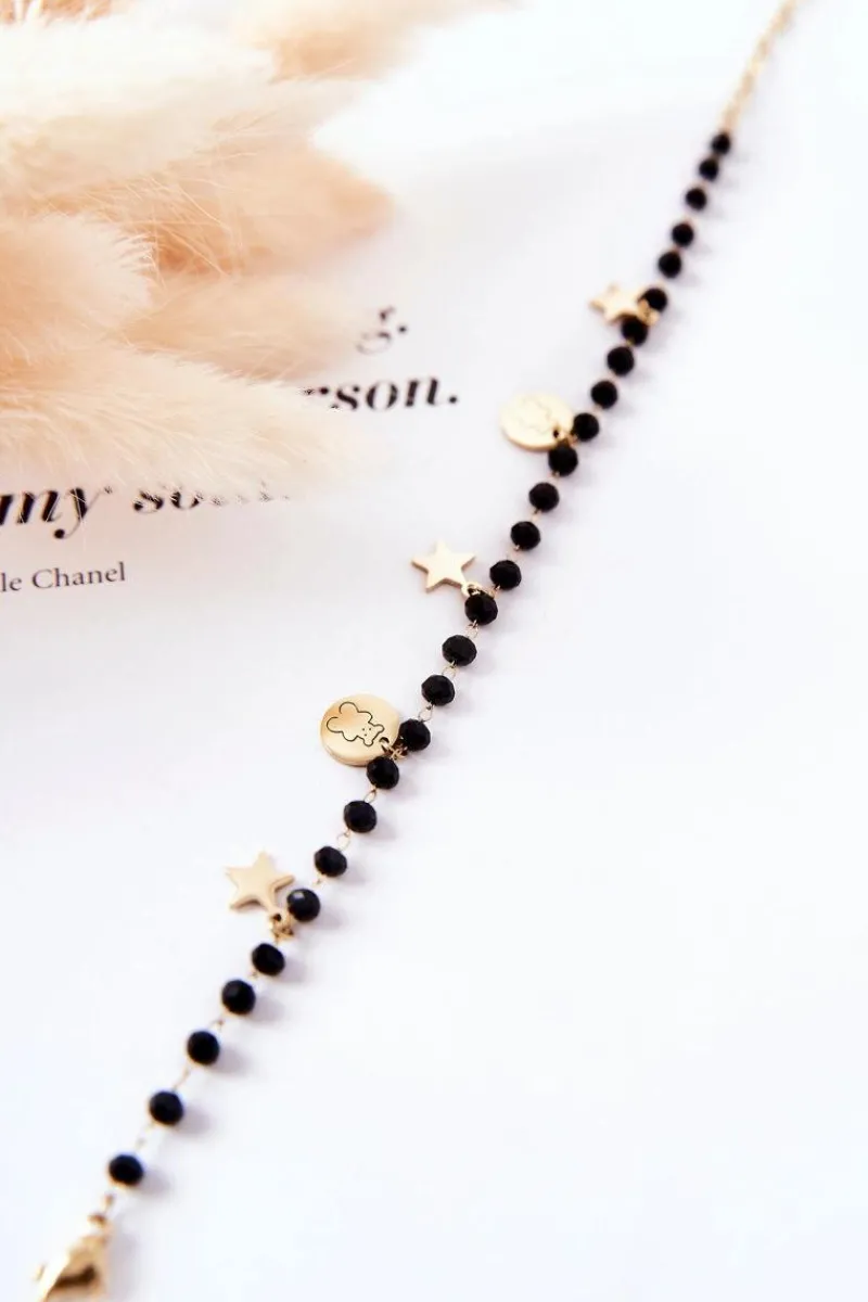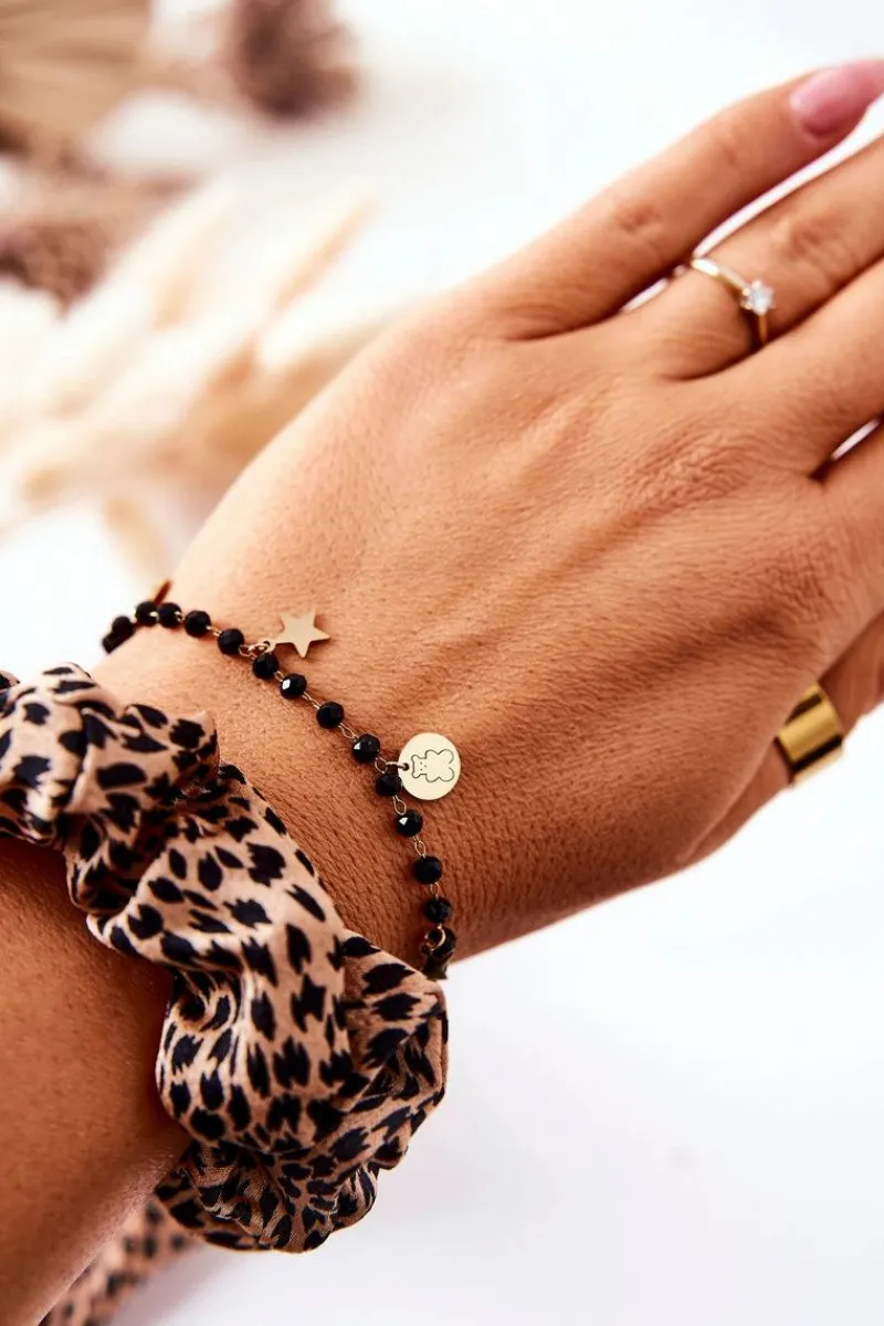 Bransoletka wykonana z połączenia stali nierdzewnej oraz kamieni wykonanych z tworzywa. Posiada zawieszki w kształcie gwiazdek oraz misiów. Regulowana długość. Idealnie będzie się komponować także z zegarkiem lub innymi bransoletkami.