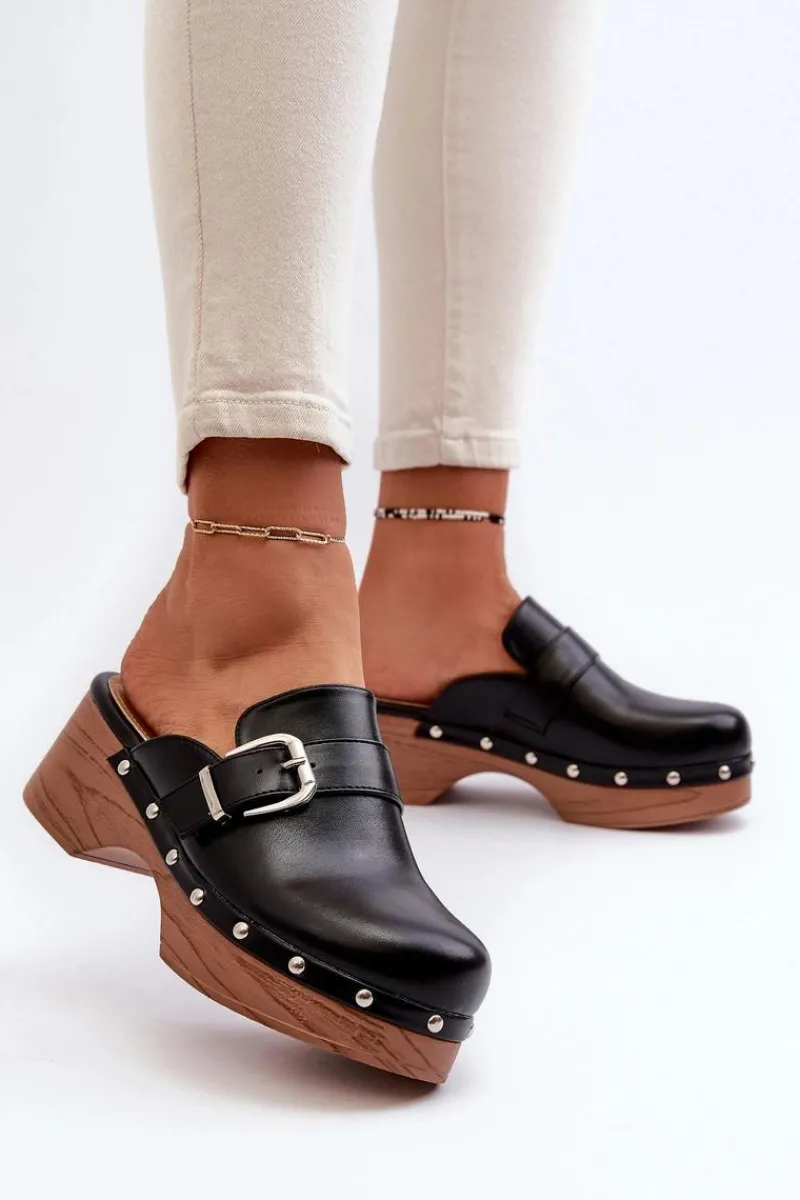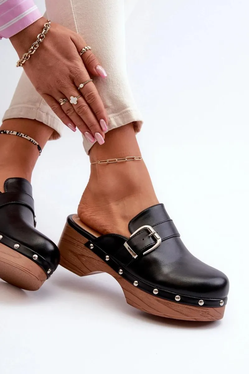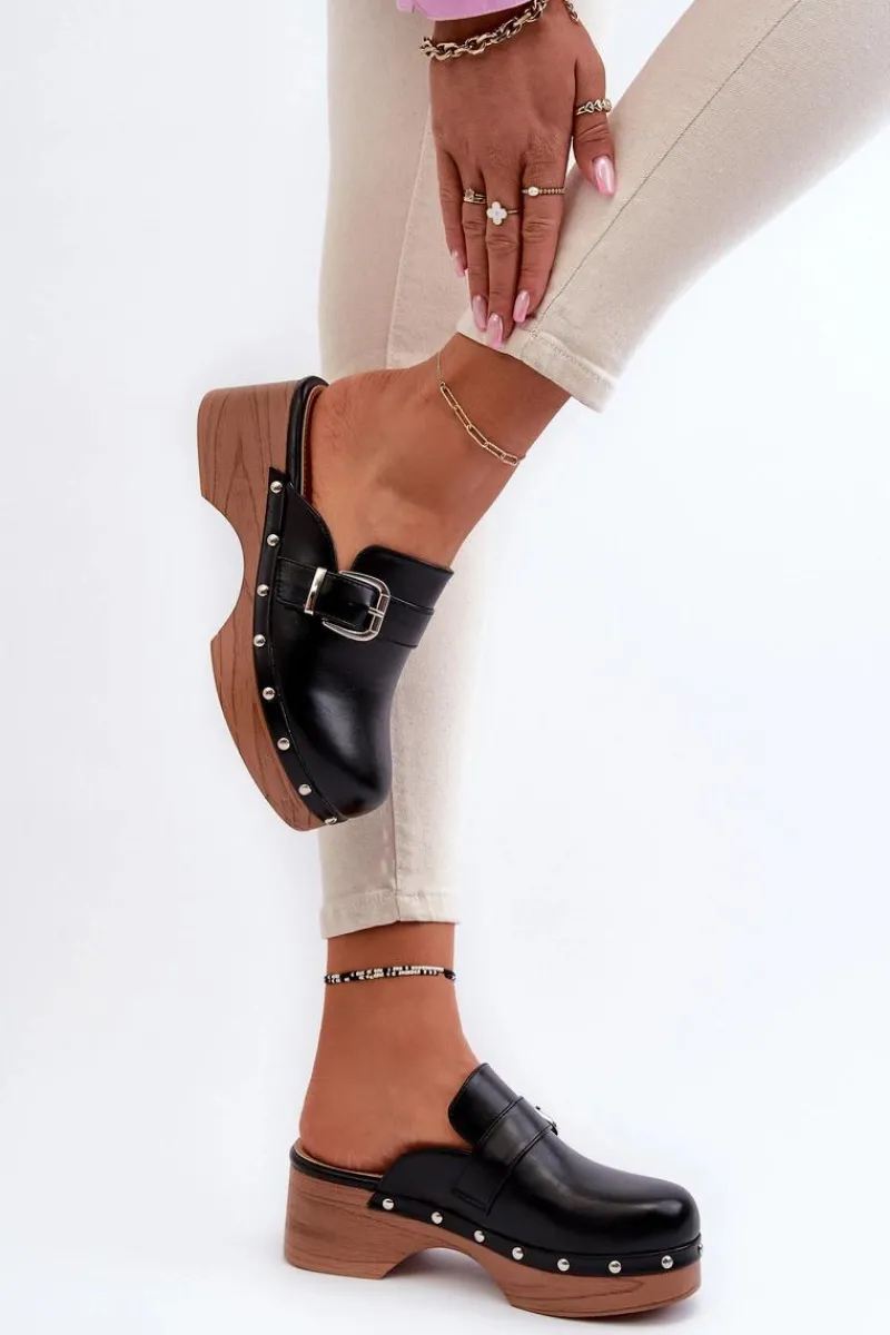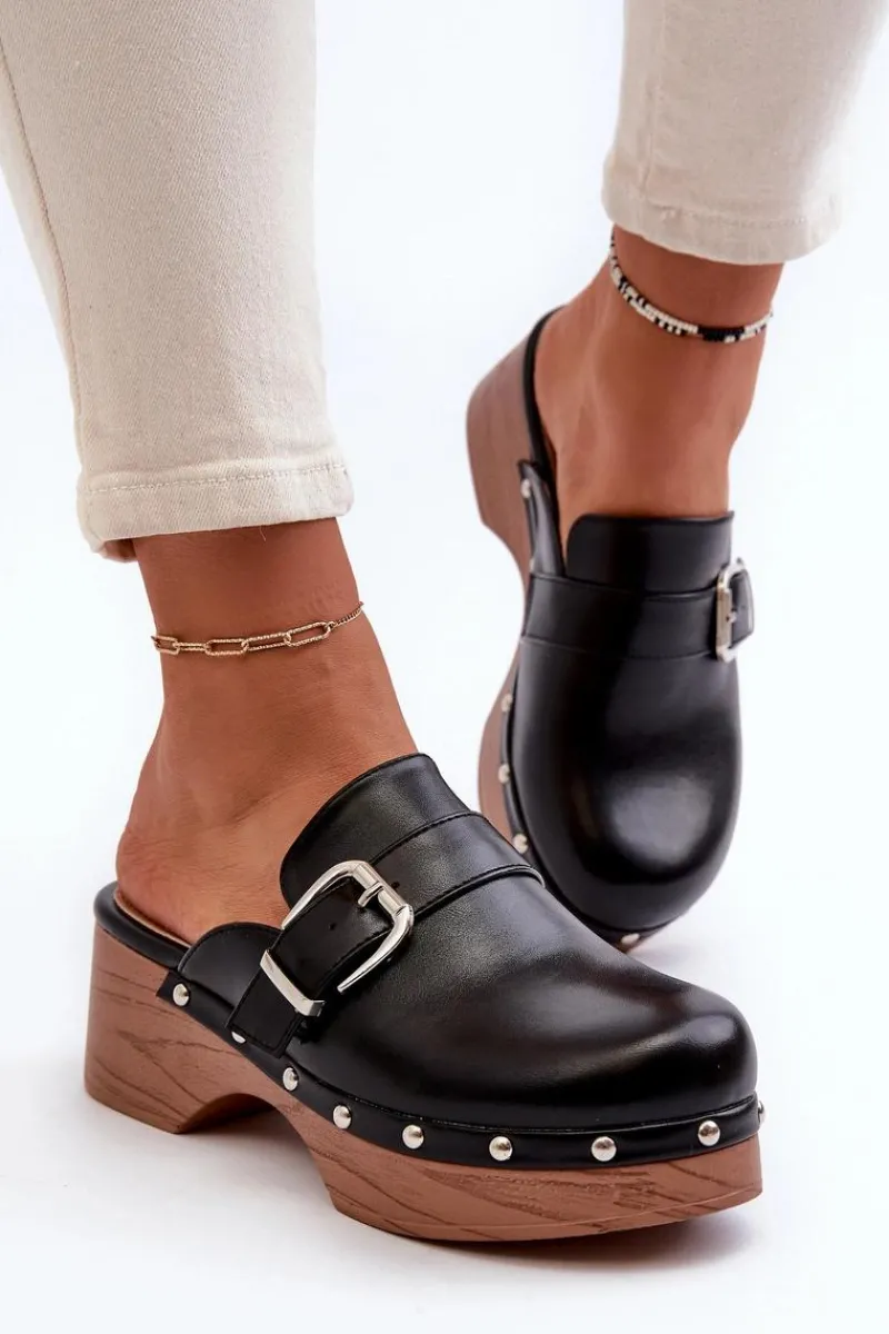 Lekkie klapki osadzone na obcasie i platformie, co nadaje im subtelny wyraz. Na cholewce pasek z klamrą oraz ozdobne ćwieki wokół podeszwy. Wykonane z eko skóry, zarówno cholewka, jak i wkładka gwarantują trwałość i komfort noszenia. Ten model świetnie komponuje się z codziennymi stylizacjami, dodając im nuty szyku i wyrafinowania. Przy wyborze rozmiaru prosimy sugerować się tabelą rozmiarów.