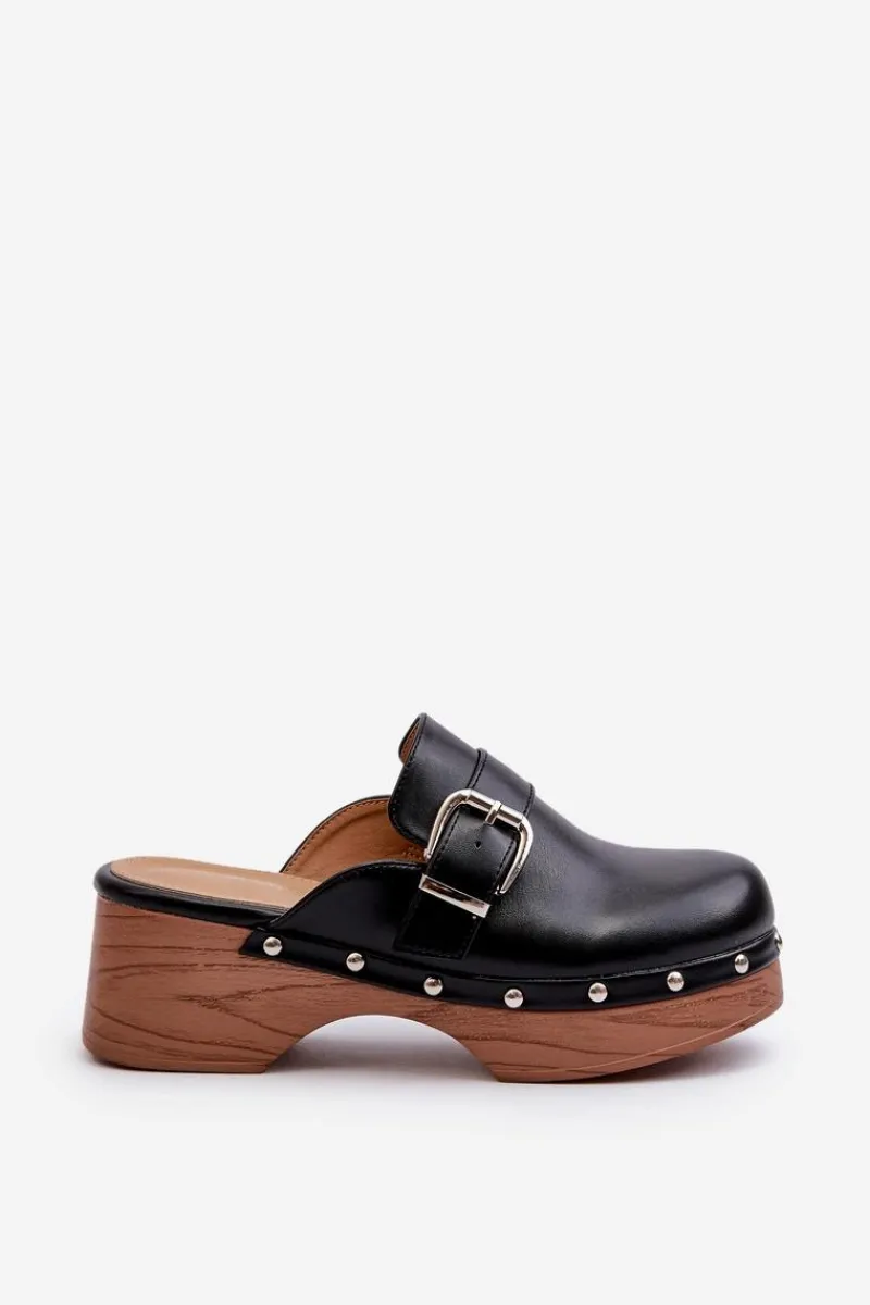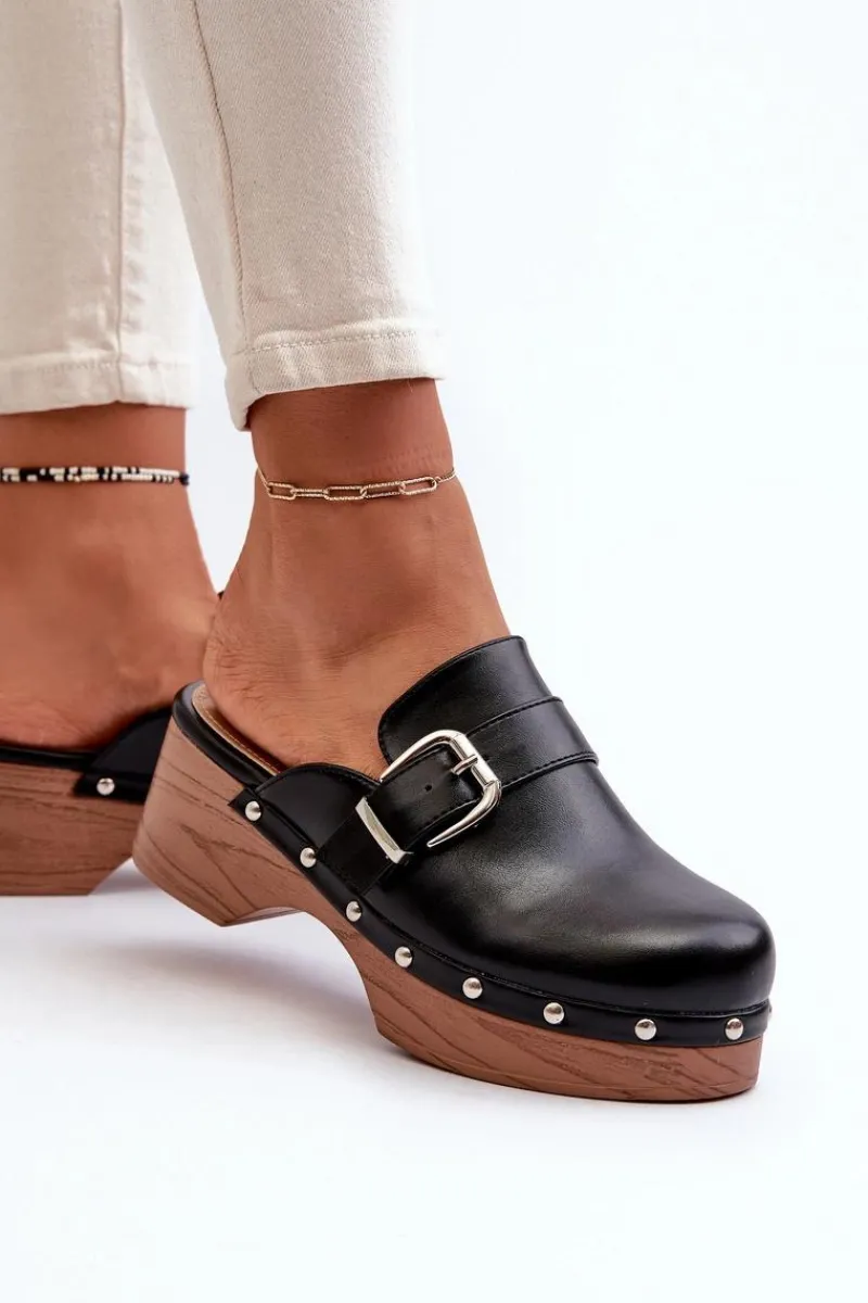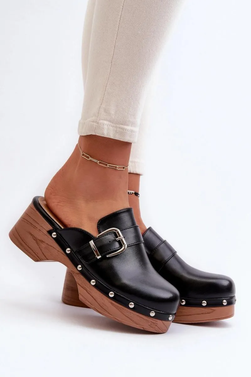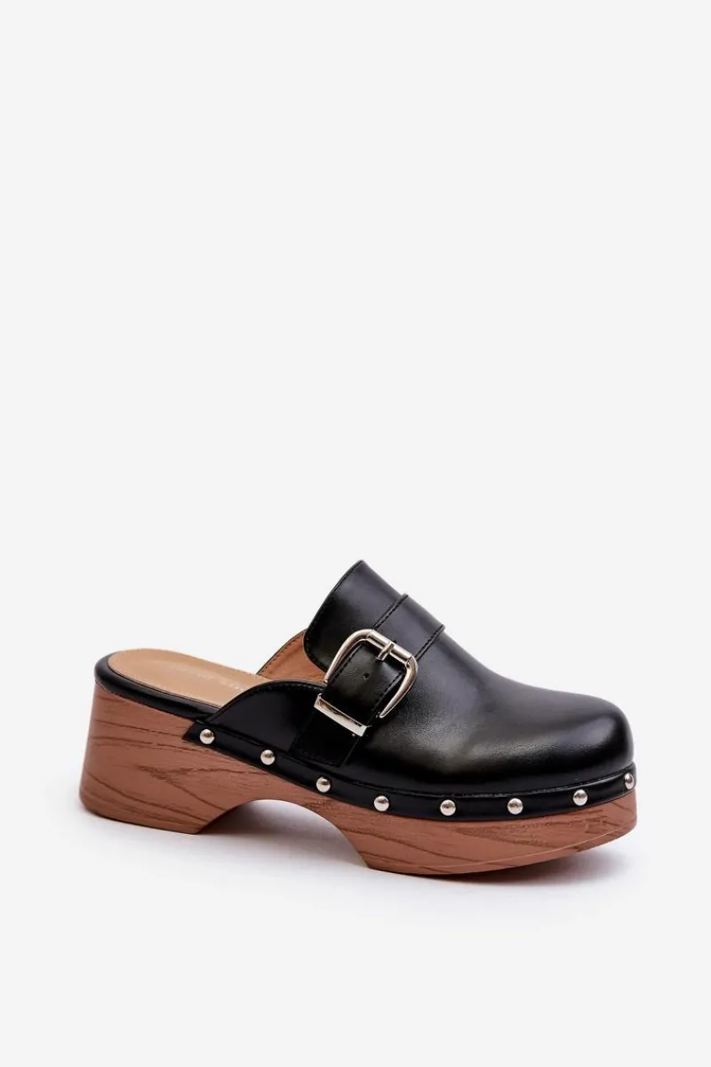 Lekkie klapki osadzone na obcasie i platformie, co nadaje im subtelny wyraz. Na cholewce pasek z klamrą oraz ozdobne ćwieki wokół podeszwy. Wykonane z eko skóry, zarówno cholewka, jak i wkładka gwarantują trwałość i komfort noszenia. Ten model świetnie komponuje się z codziennymi stylizacjami, dodając im nuty szyku i wyrafinowania. Przy wyborze rozmiaru prosimy sugerować się tabelą rozmiarów.