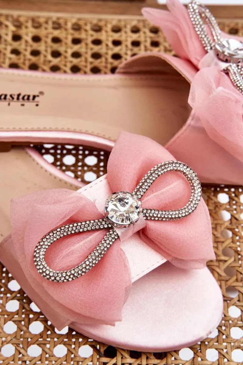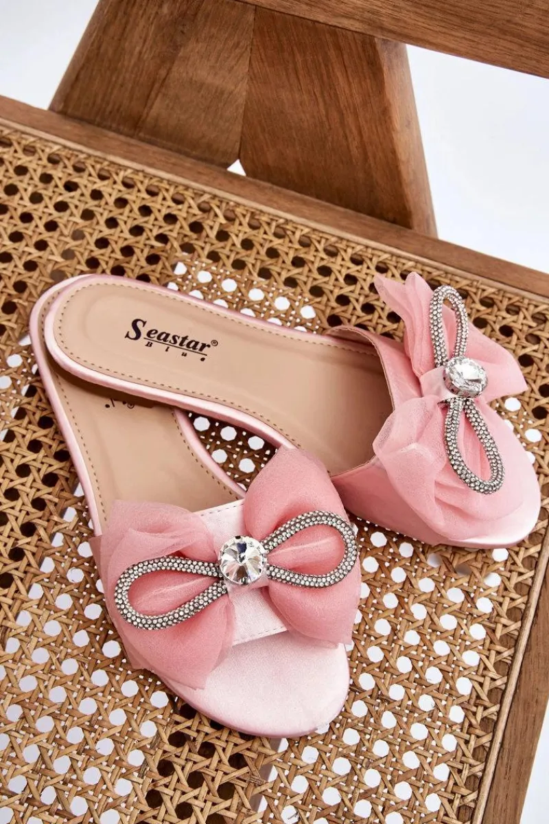 Wygodne klapki wykonane z materiału tekstylnego. Posiadają z przodu piękną kokardę z dodatkami w postaci dżetów imitujących cyrkonie. Miękka wkładka została wykonana z eko skóry. Buty te osadzono na płaskim obcasie. Model idealny na co dzień. Świetnie podkreśli wiele Twoich letnich stylizacji! Przy wyborze rozmiaru prosimy sugerować się tabelą rozmiarów.