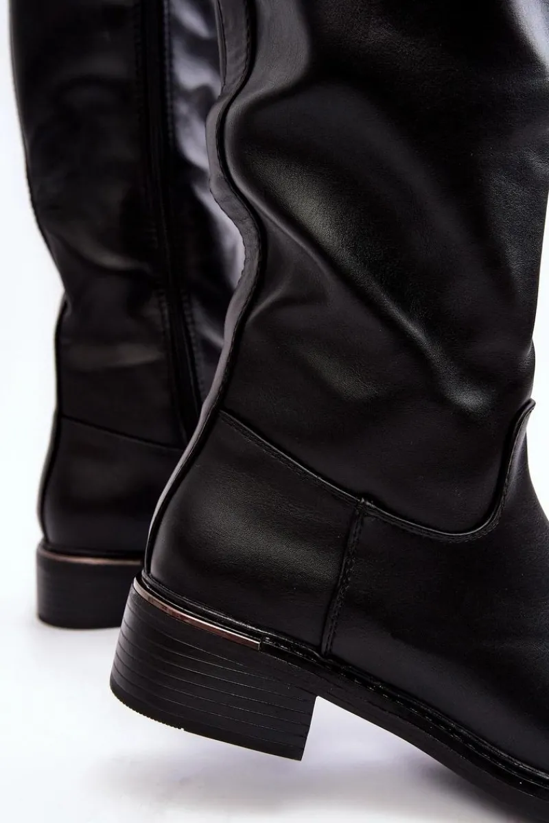 Damskie, klasyczne kozaki zostały wykonane z eko skóry. Osadzone na płaskim, stabilnym obcasie. Cholewka przed kolano zapinana suwakiem. Noski zaokrąglone. Zapiętek usztywniony. Miękka wkładka zapewni komfortowe użytkowanie obuwia. Idealne do każdej jesienno-zimowej stylizacji! Przy wyborze rozmiaru prosimy kierować tabelą rozmiarów.