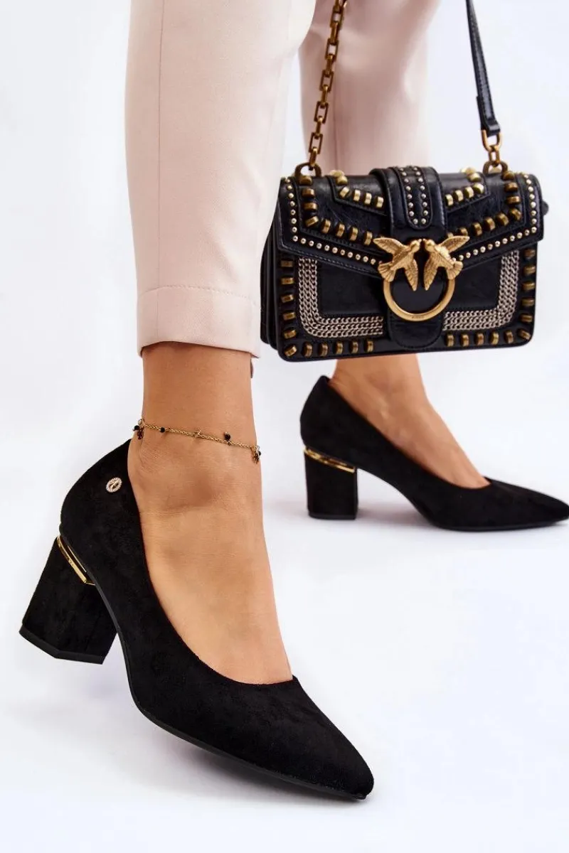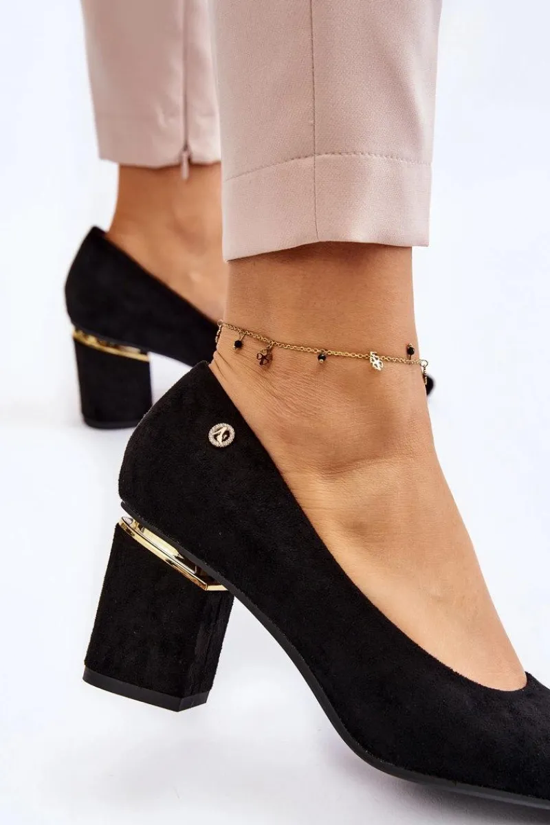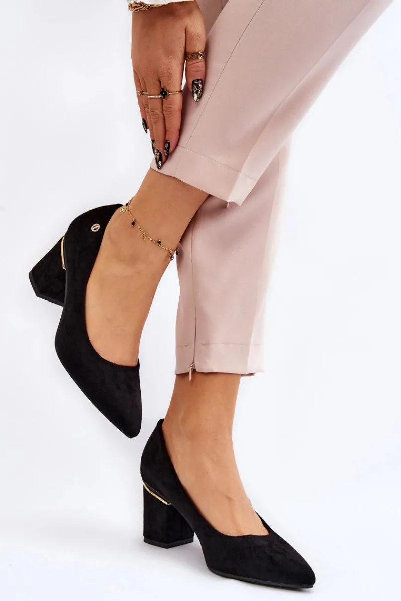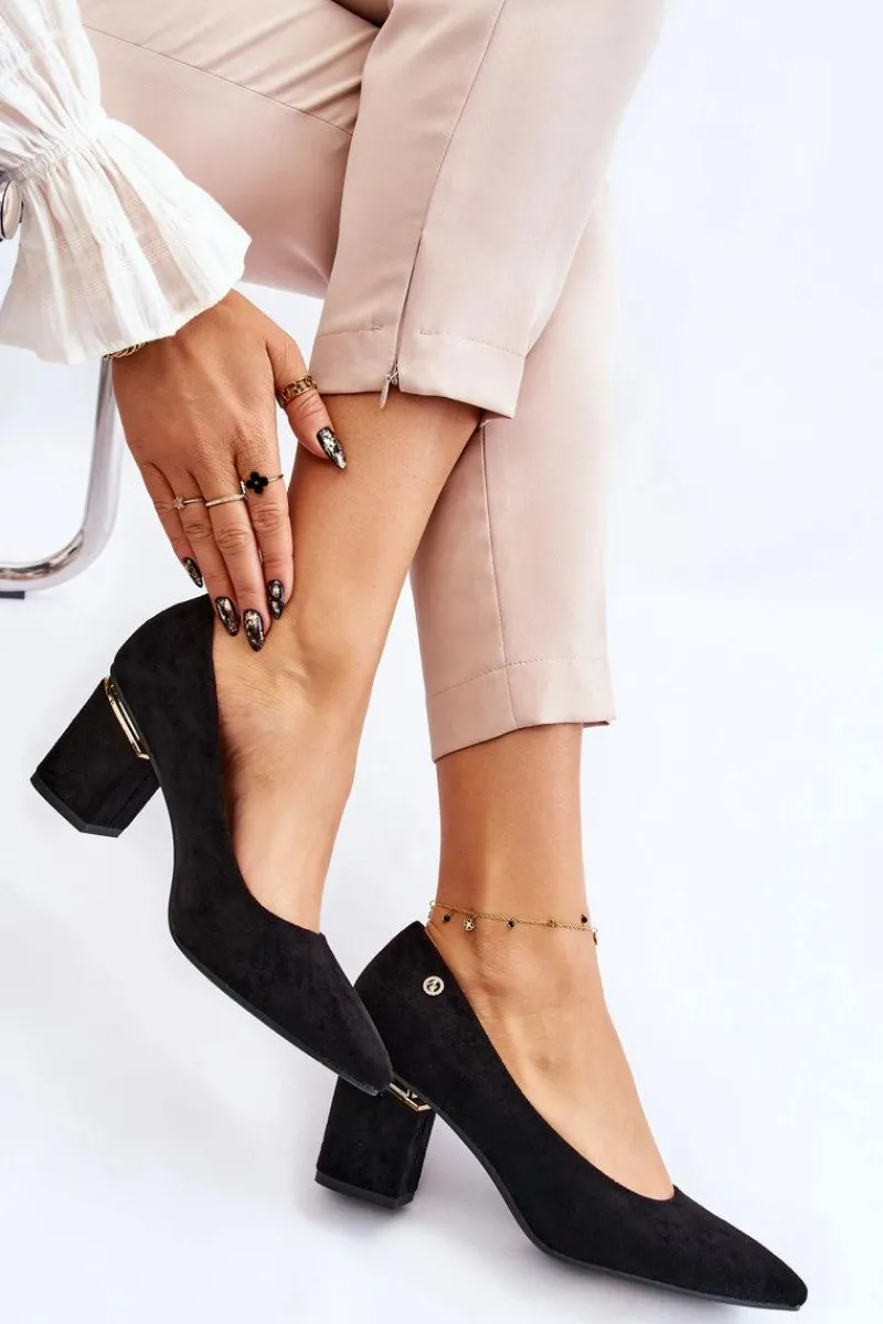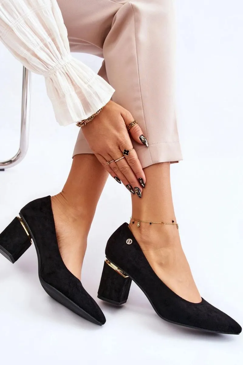 Piękne czółenka osadzone na obcasie w postaci słupka. Wykonane z zamszowej eko skóry. Nosek w szpic wysmukli nogi. Idealny model do wielu stylizacji. Buty są niezwykle komfortowe w użytkowaniu, dzięki wkładce z naturalnej skóry. Obcas został ozdobiony lustrzanym elementem. Przy wyborze rozmiaru prosimy sugerować się tabelą rozmiarów.