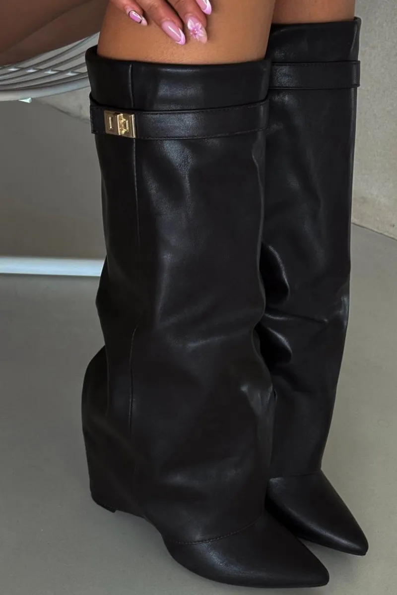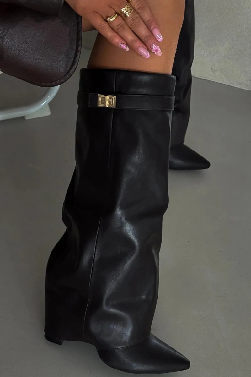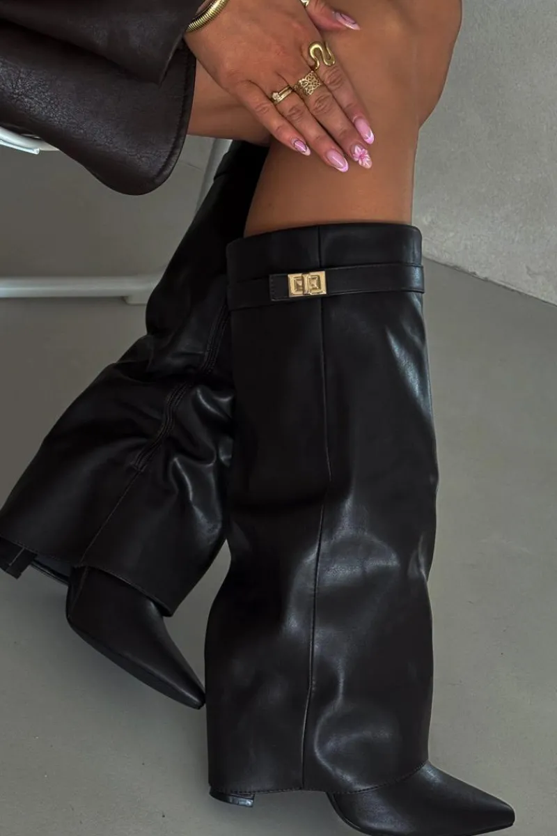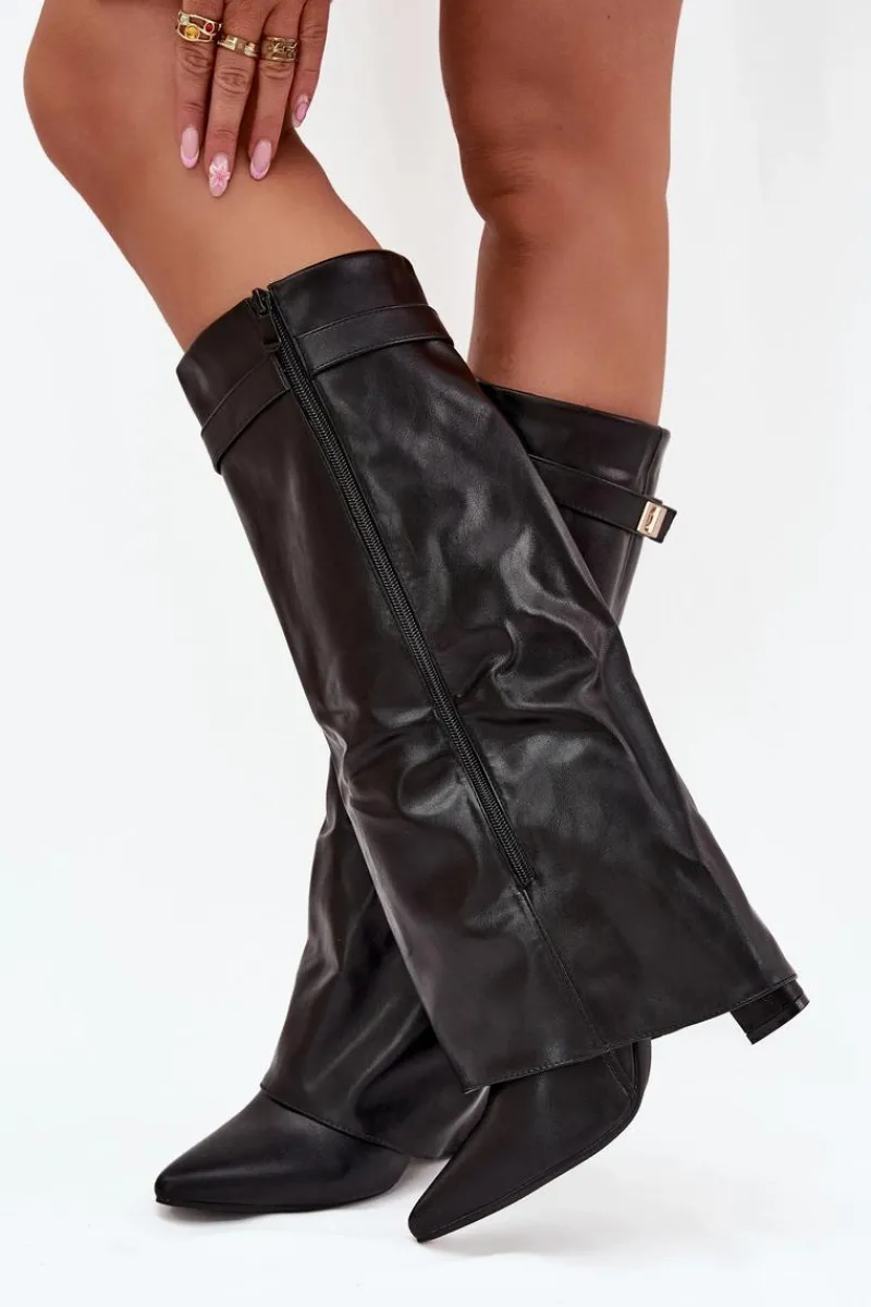 Kozaki damskie z eko skóry, sięgające przed kolano, to elegancka propozycja na chłodniejsze dni. Głównym atutem tego modelu jest wywinięta cholewka ozdobiona paseczkiem ze złotym detalem, który nadaje im wyjątkowego charakteru. Noski w szpic optycznie wysmuklają nogi, a obcas w formie słupka zapewnia stabilność i komfort. Zapinane na zamek, te kozaki będą doskonałym wyborem na eleganckie wyjścia oraz codzienne stylizacje. Przy wyborze rozmiaru prosimy sugerować się tabelą rozmiarów.