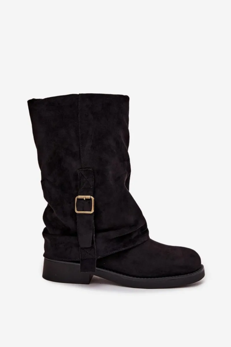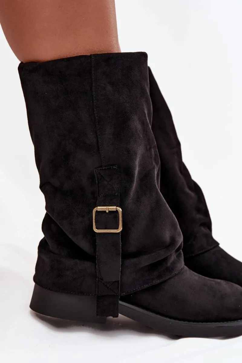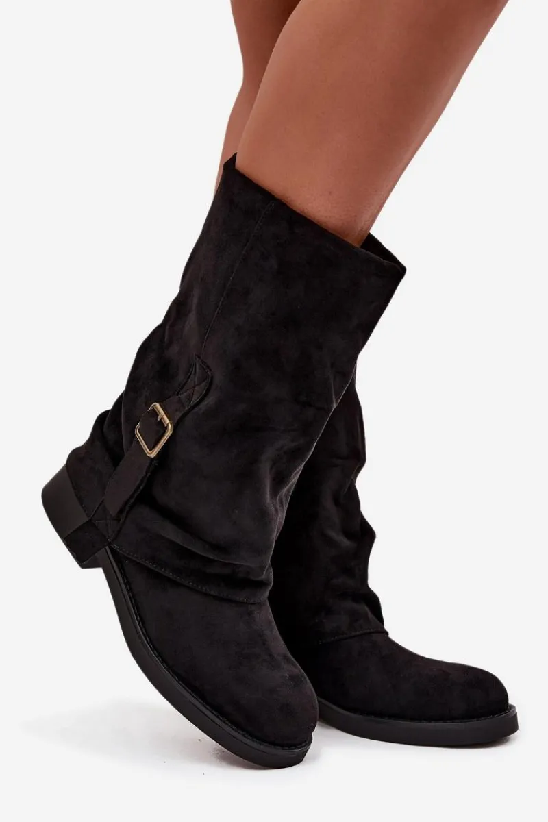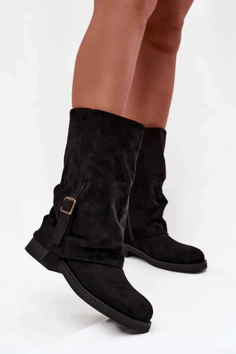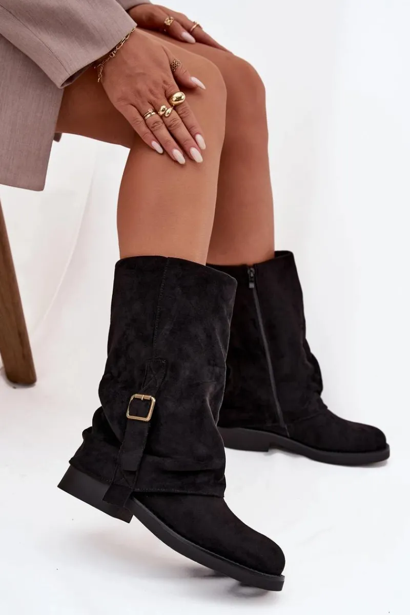 Kozaki damskie wykonane z eko zamszu to idealna propozycja dla kobiet, które cenią styl i wygodę w jednym. Model osadzony na płaskim obcasie zapewnia komfort podczas codziennego noszenia, jednocześnie prezentując się elegancko i kobieco. Zapięcie na zamek ułatwia zakładanie oraz zdejmowanie obuwia, co zwiększa jego praktyczność. Uwagę przyciąga efektowna, wywinięta cholewka ozdobiona paskiem z klamrą, która dodaje całości modnego charakteru. Miękka faktura eko zamszu podkreśla wygląd butów, czyniąc je doskonałym uzupełnieniem jesienno-zimowych stylizacji. Te kozaki świetnie sprawdzą się zarówno w zestawieniu ze spódnicami i sukienkami, jak i z dopasowanymi spodniami, tworząc stylowy, codzienny look. Przy wyborze rozmiaru prosimy sugerować się tabelą rozmiarów.