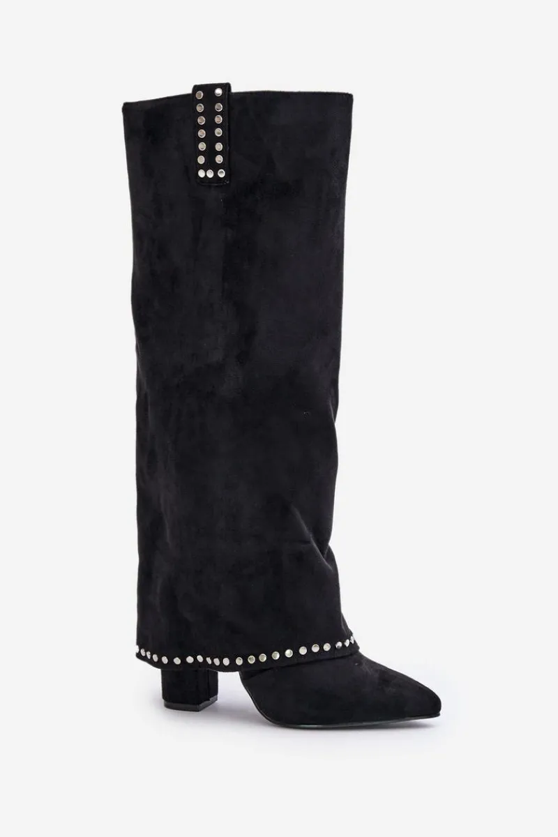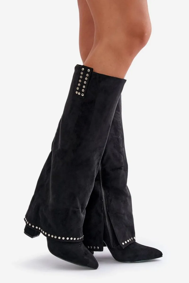 Damskie kozaki z luźną cholewką wykonane z eko zamszu. Osadzone na stabilnym słupkowym obcasie, z noskami w szpic, które dodają wyrafinowanego charakteru. Wnętrze ocieplone kocem obuwniczym zapewnia ciepło w chłodniejsze dni. Wywinięta cholewka, która płynnie przechodzi na obcas, stanowi wyjątkowy element tego modelu. Zapinane na suwak, świetnie komponują się z sukienkami i spódnicami, dodając szyku każdej stylizacji. Przy wyborze rozmiaru prosimy sugerować się tabelą rozmiarów.