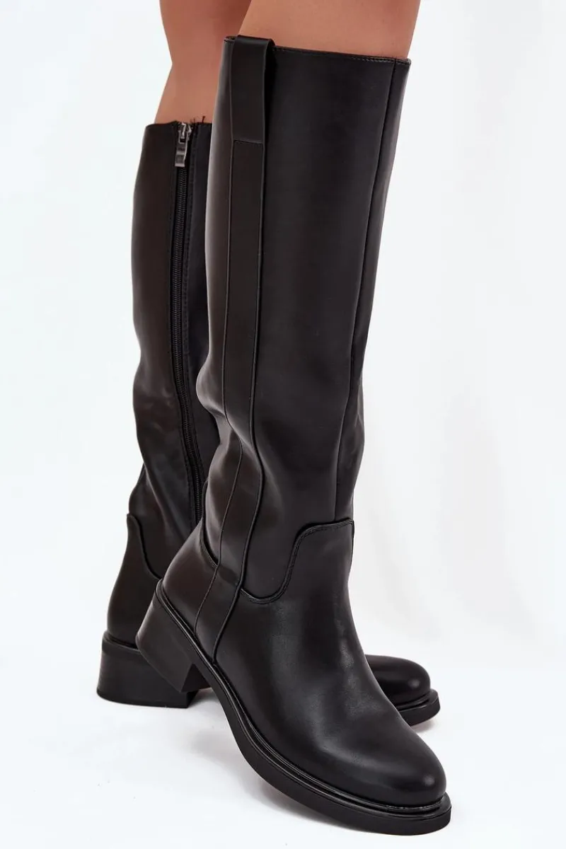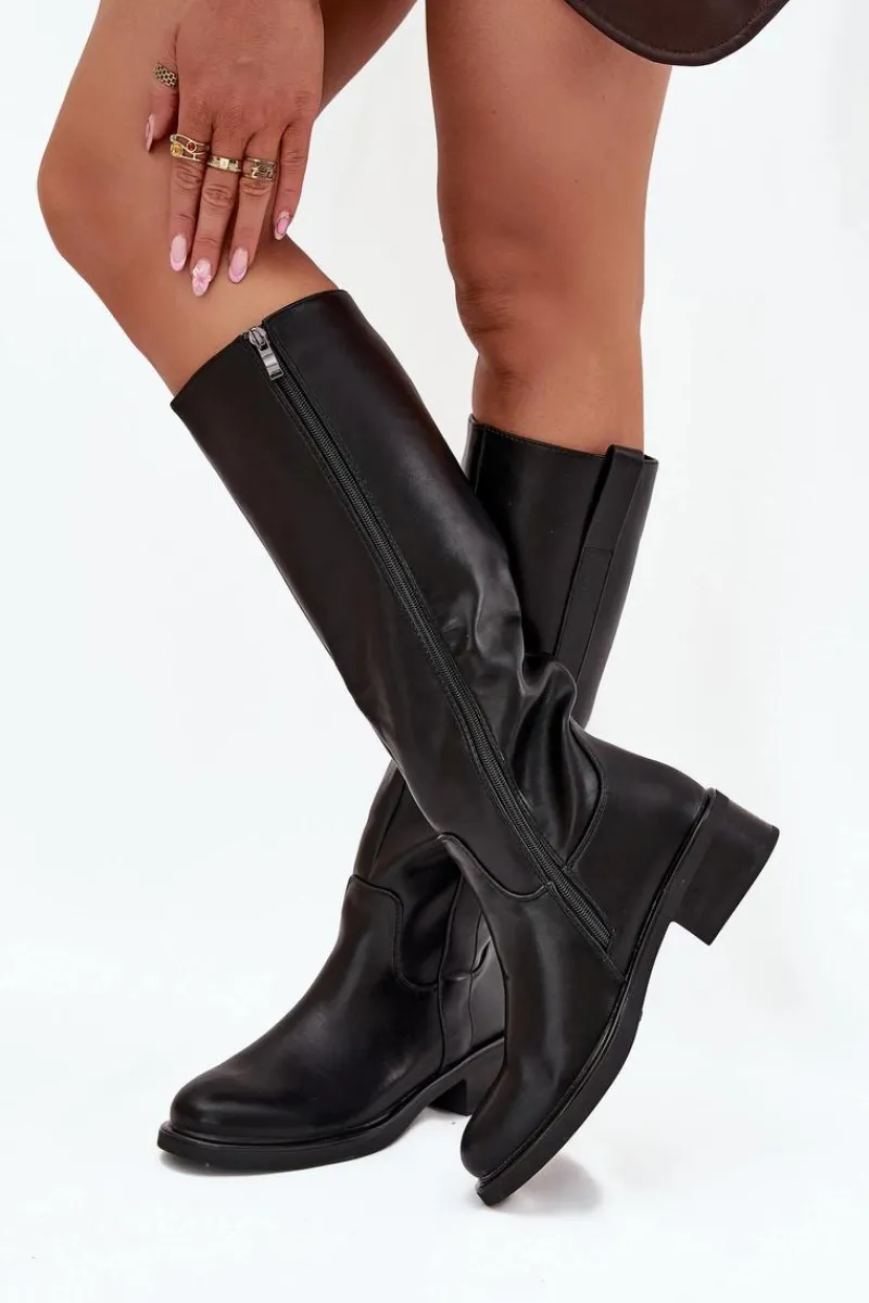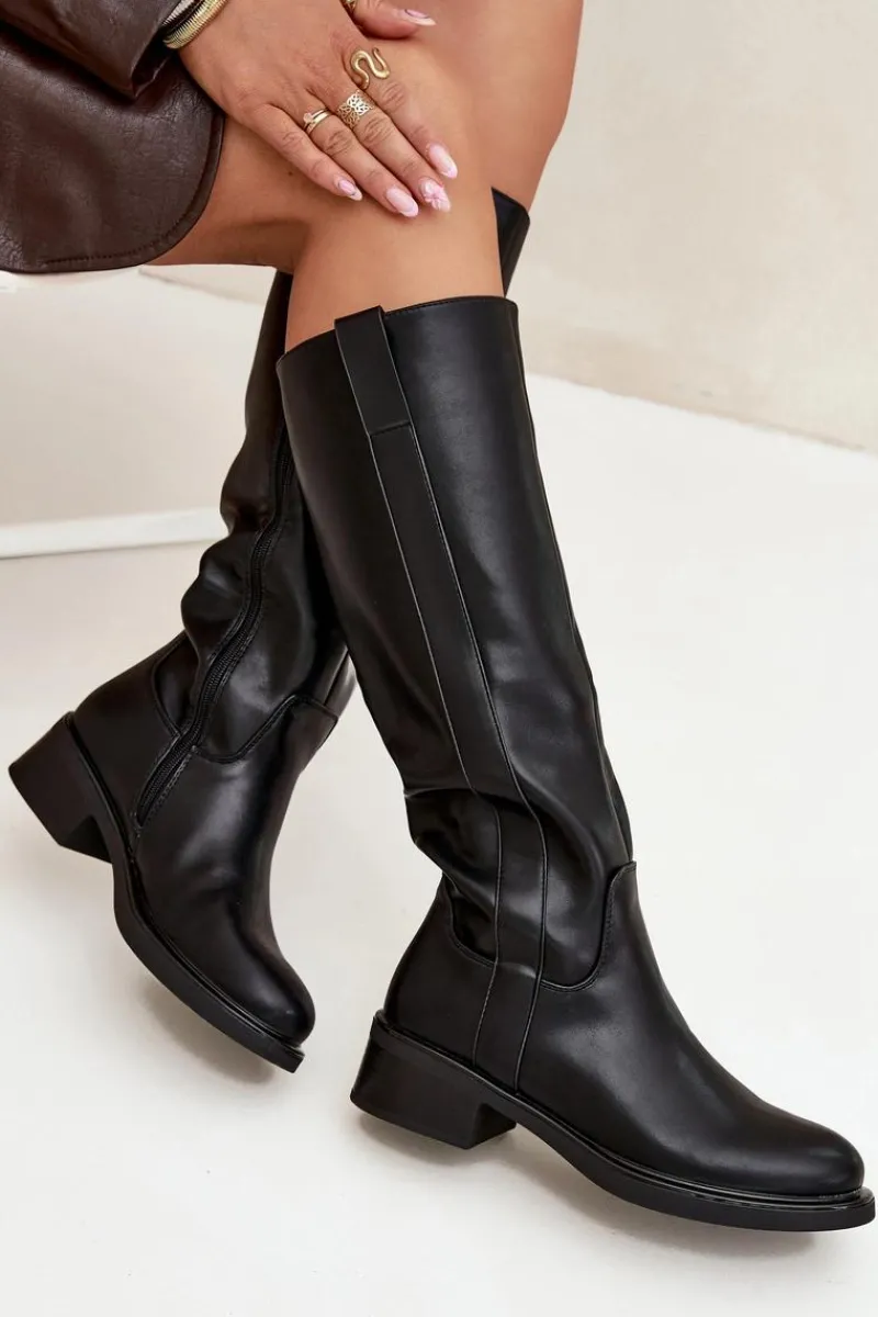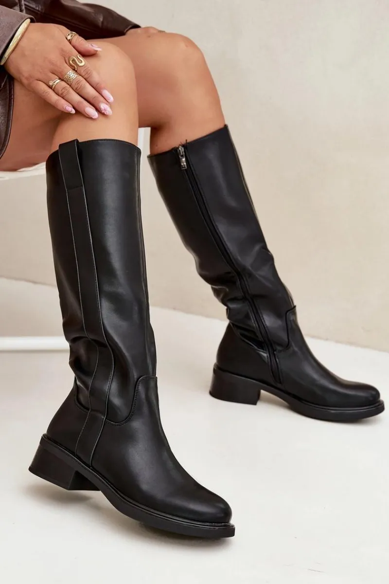 Kozaki oficerki damskie z eko skóry, osadzone na niskim obcasie w formie klocka, to połączenie klasyki z komfortem. Cholewka sięga przed kolano. Zapinane na zamek, co ułatwia ich zakładanie. Ocieplane kocem obuwniczym. Idealne do codziennych stylizacji, doskonale komponują się z sukienkami, spódnicami i spodniami. Przy wyborze rozmiaru prosimy sugerować się tabelą rozmiarów.