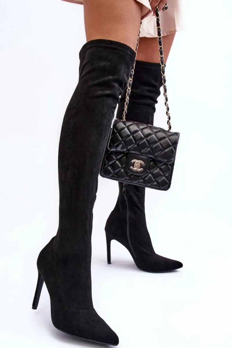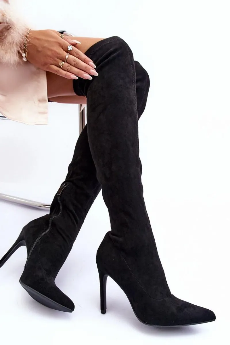 Modne kozaki za kolano zostały wykonane z eko zamszu. Zapinane na suwak w dolnej części cholewki. Obcas w postaci szpilki. Wnętrze ocieplone na wysokości stopy. Zapiętek usztywniony, noski w szpic. Koniecznie musisz mieć ten model w swojej garderobie! Przy wyborze rozmiaru prosimy kierować tabelą rozmiarów.